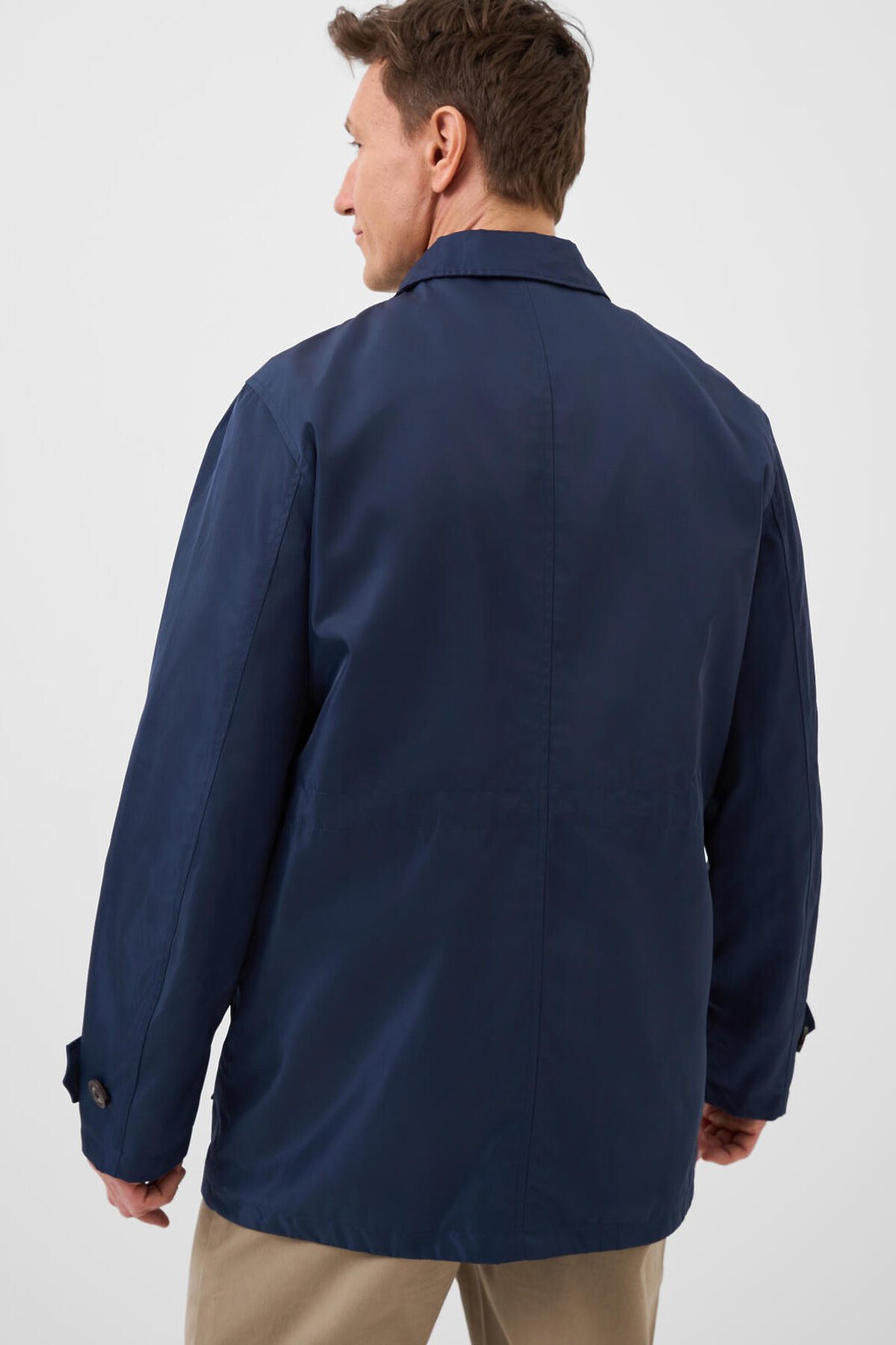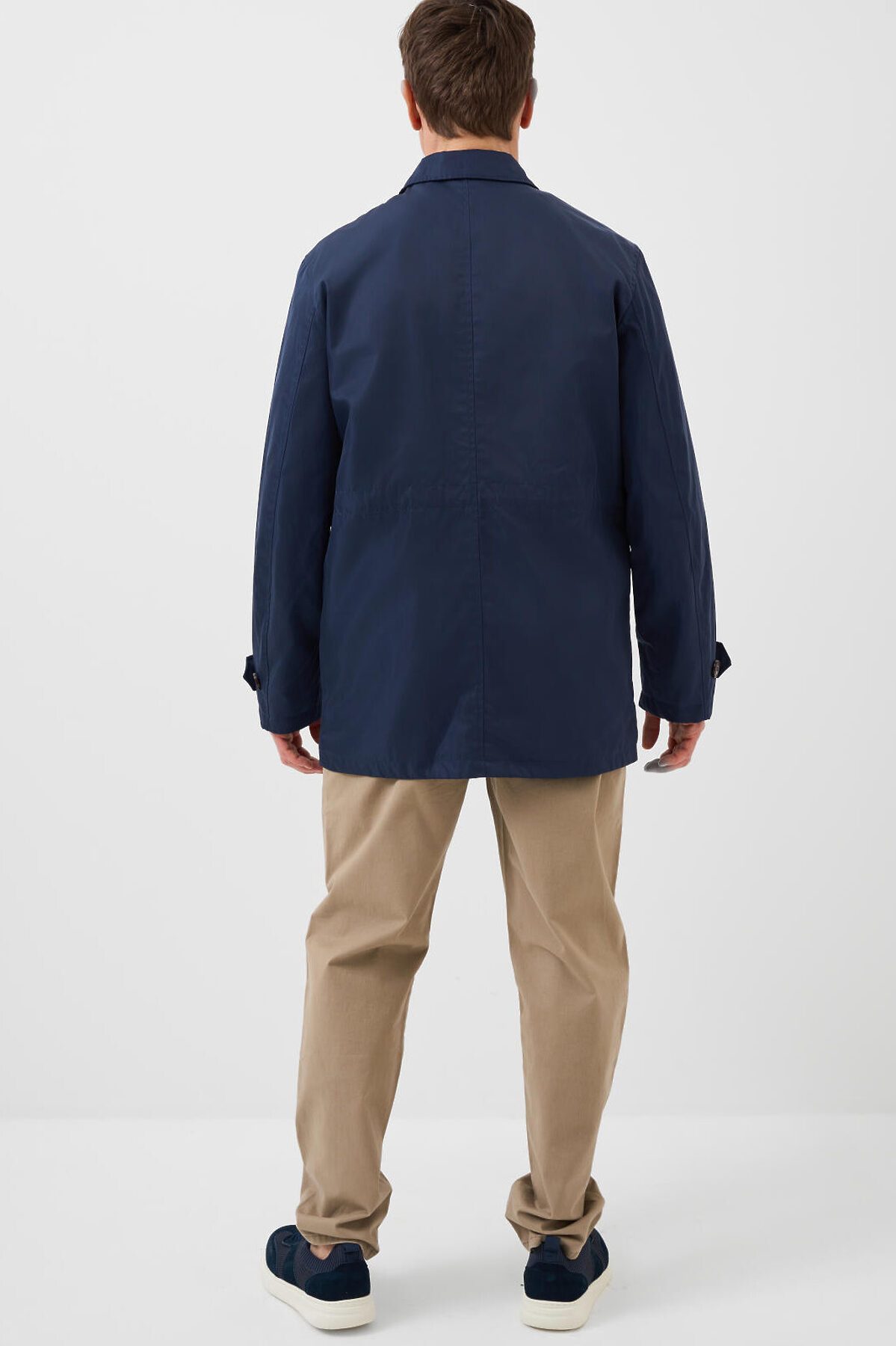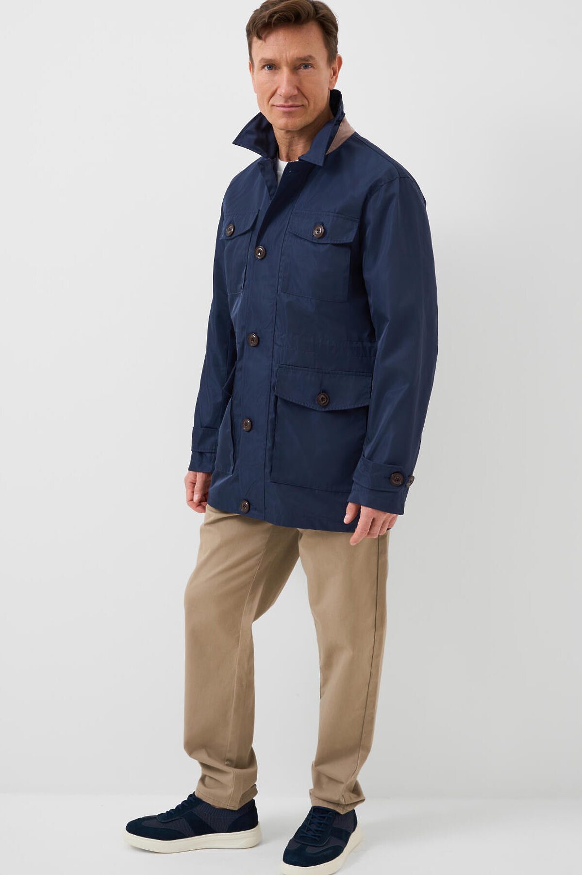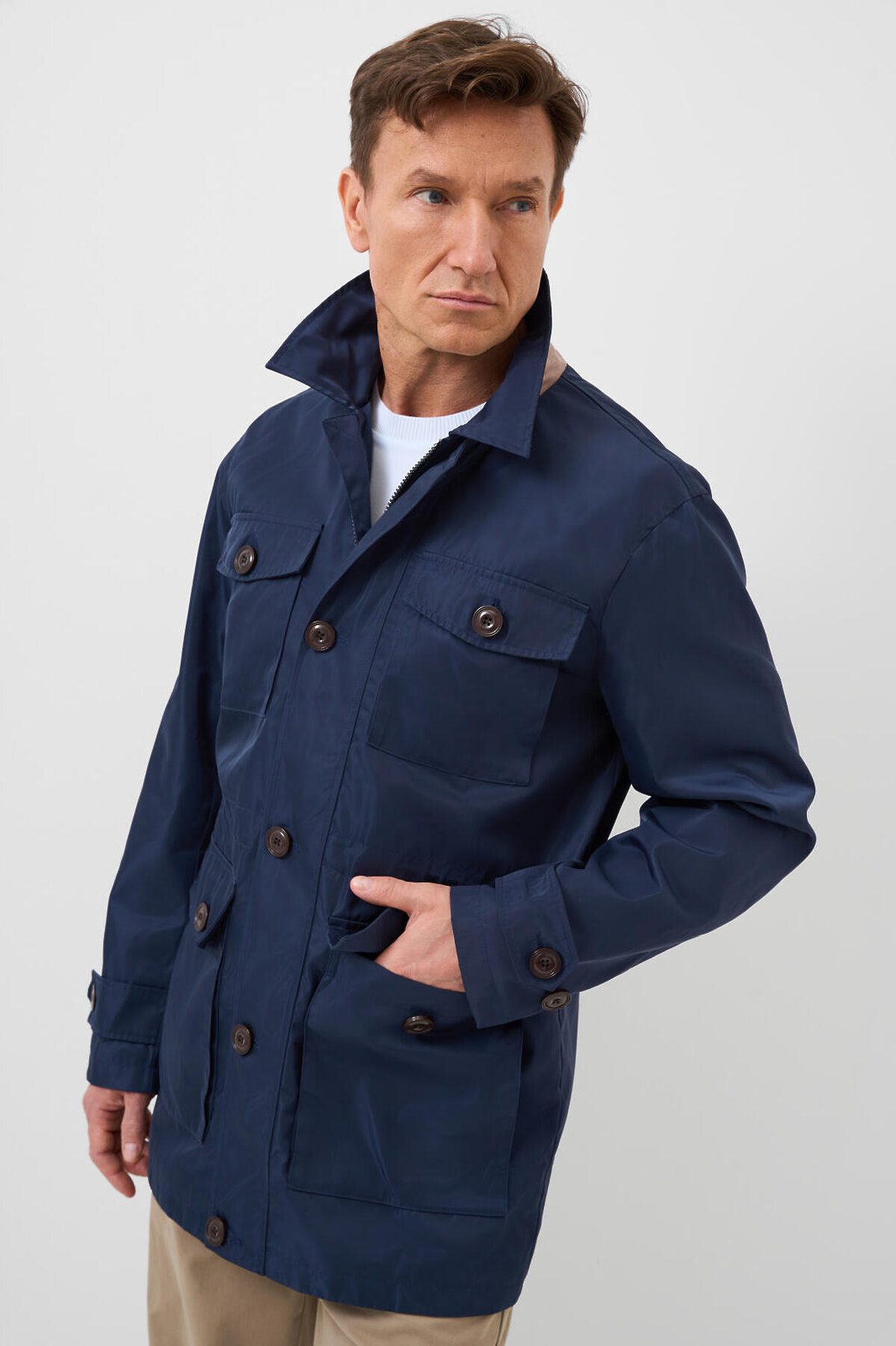 Мужская ветровка с классическим отложным воротником. Температурный режим от +20С до +10С. Ткань с ветрозащитным и водоотталкивающим покрытием. Внутри гладкая подкладка. Спереди расположены четыре накладных кармана на пуговицах. Центральная застёжка — молния с двумя бегунками, скрытая под ветрозащитной планкой на пуговицах. По талии вшит регулируемый шнур, чтобы подогнать изделие по фигуре. Рукава длинные, с манжетами на пуговицах. Внутри — два внутренних кармана на молнии.