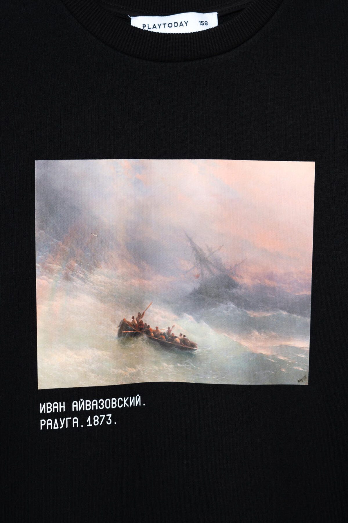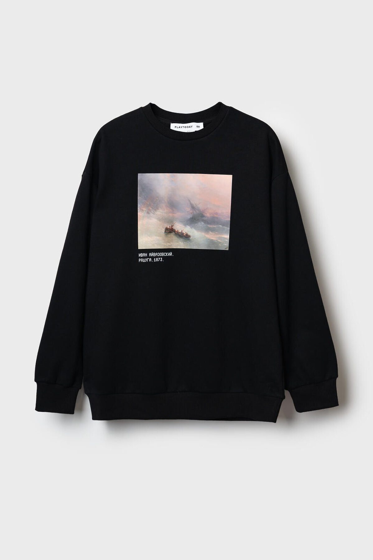 Свитшот оверсайз для мальчика подростка. Выполнен из хлопкового футера без начеса. На груди расположен крупный принт — репродукция картины Айвазовского «Радуга». Под изображением — подпись с названием и датой создания картины. Горловина, манжеты и низ изделия оформлены эластичными резинками. Можно составить family look cо взрослым вариантом аналогичного дизайна.