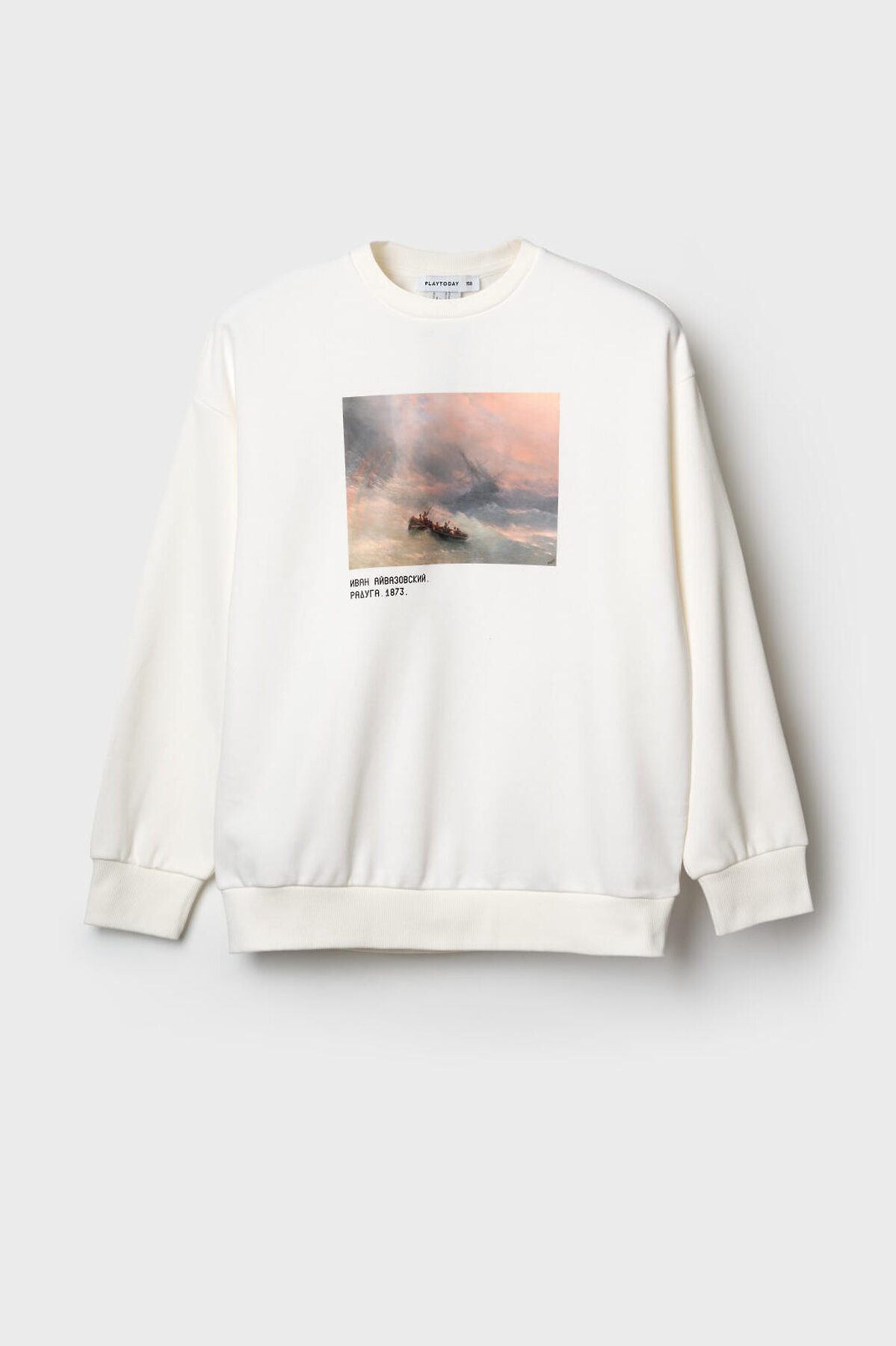 Свитшот оверсайз для мальчика подростка. Выполнен из хлопкового футера без начеса. На груди расположен крупный принт — репродукция картины Айвазовского «Радуга». Под изображением — подпись с названием и датой создания картины. Горловина, манжеты и низ изделия оформлены эластичными резинками. Можно составить family look cо взрослым вариантом аналогичного дизайна.