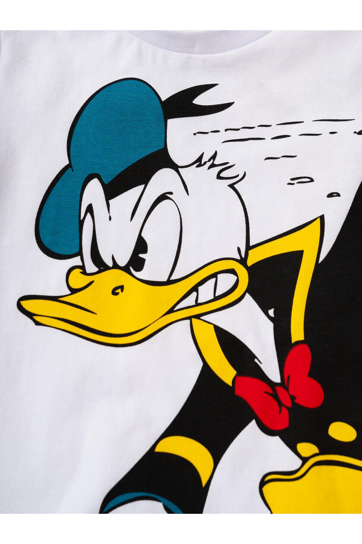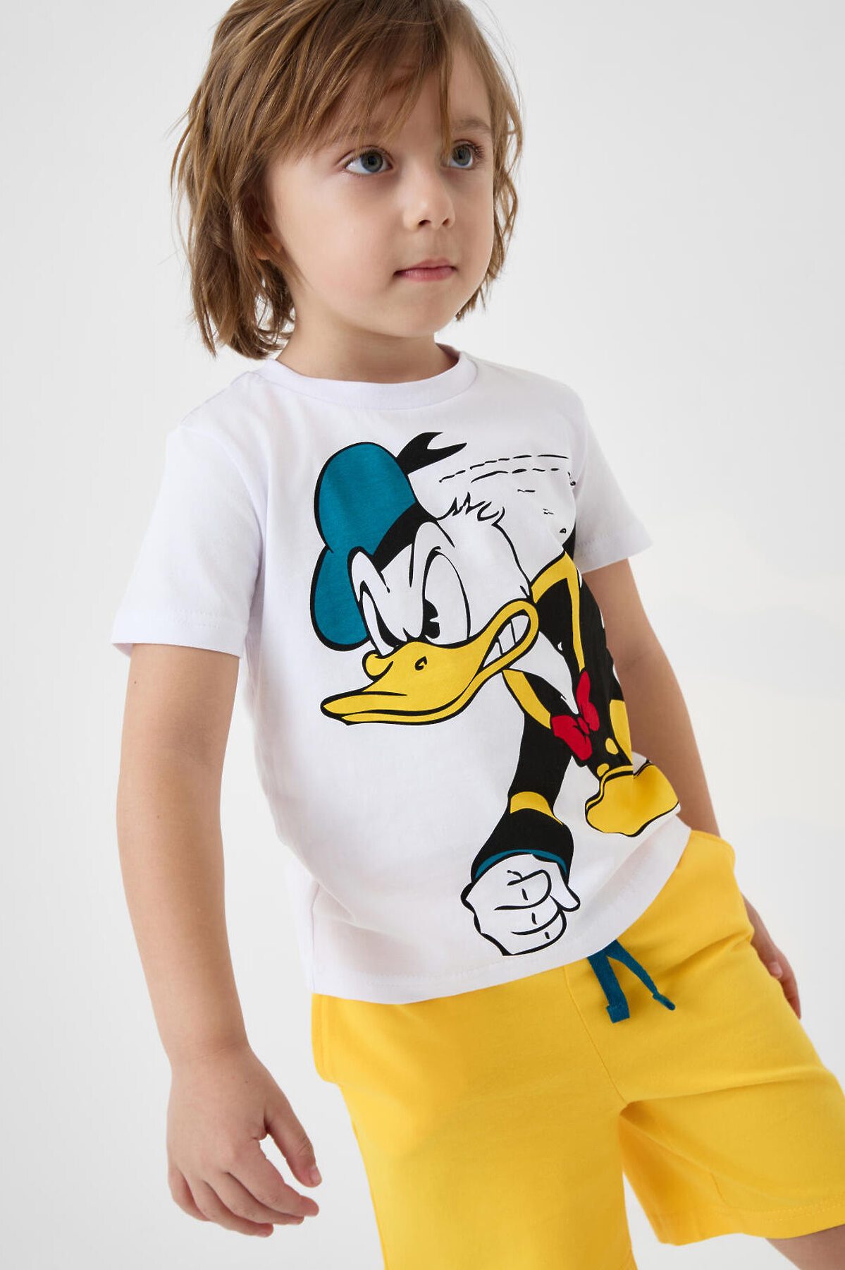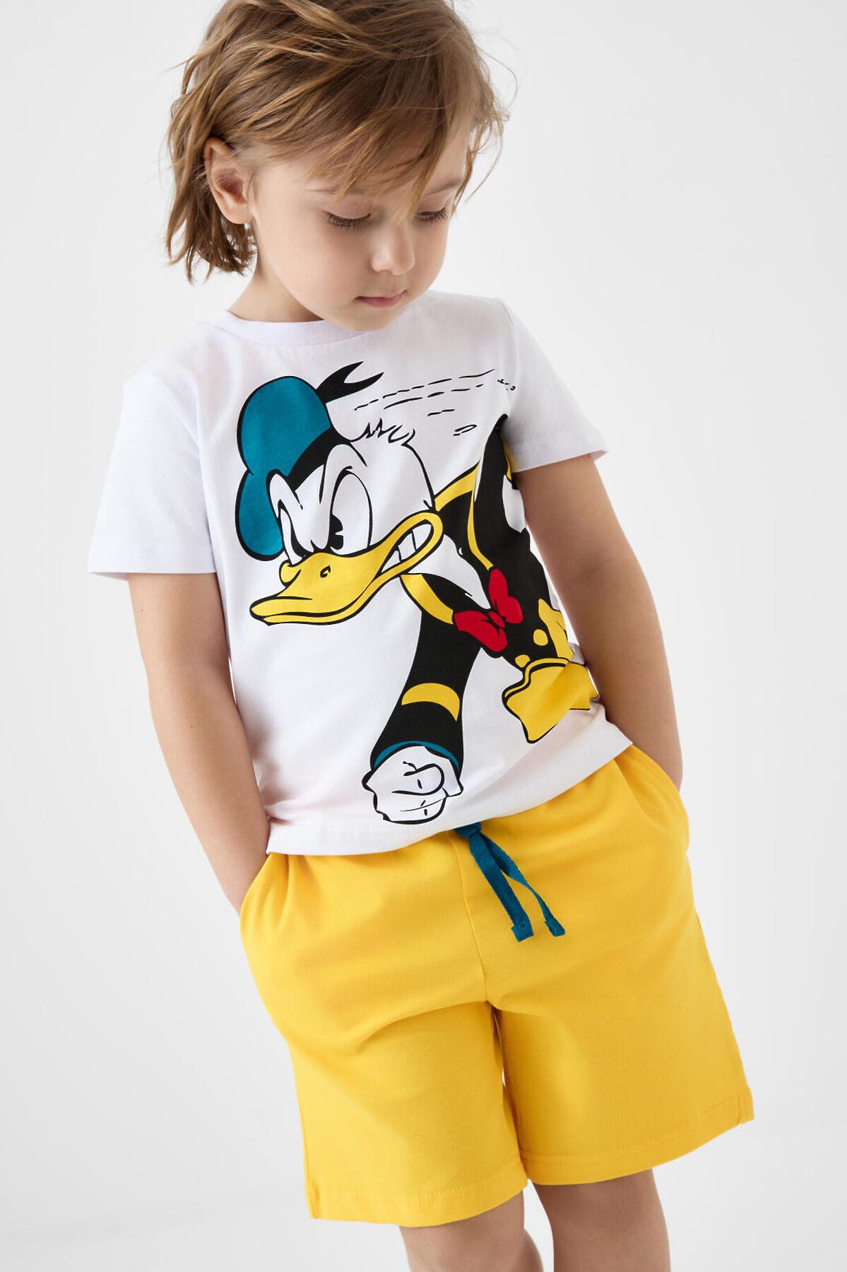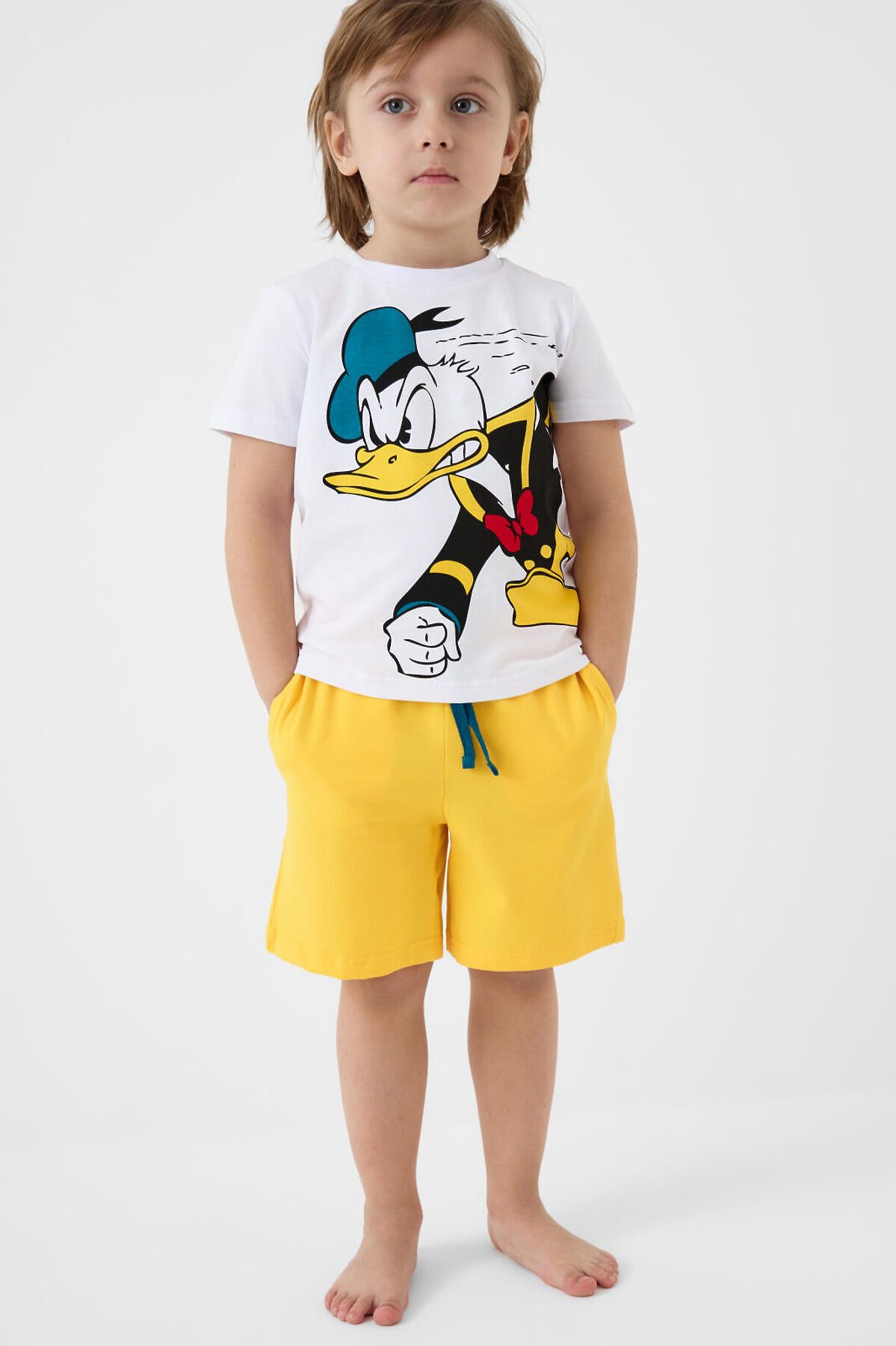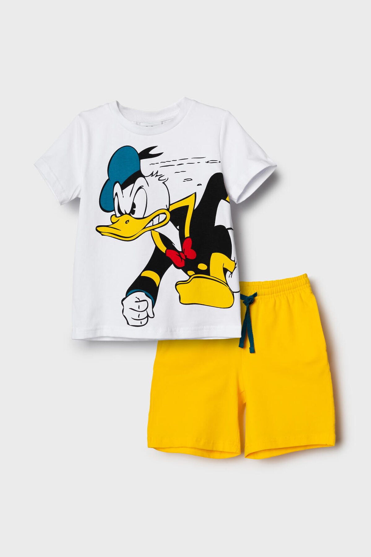 Пижама детская для мальчика. Комплект состоит из футболки, прямого кроя с короткими рукавами и шорт. На футболке яркий и крупный принт с Дональдом Даком. Шорты оснащены удобным эластичным поясом с шнурком для регулировки. Есть боковые карманы. Материал — мягкий и комфортный хлопковый трикотаж.
