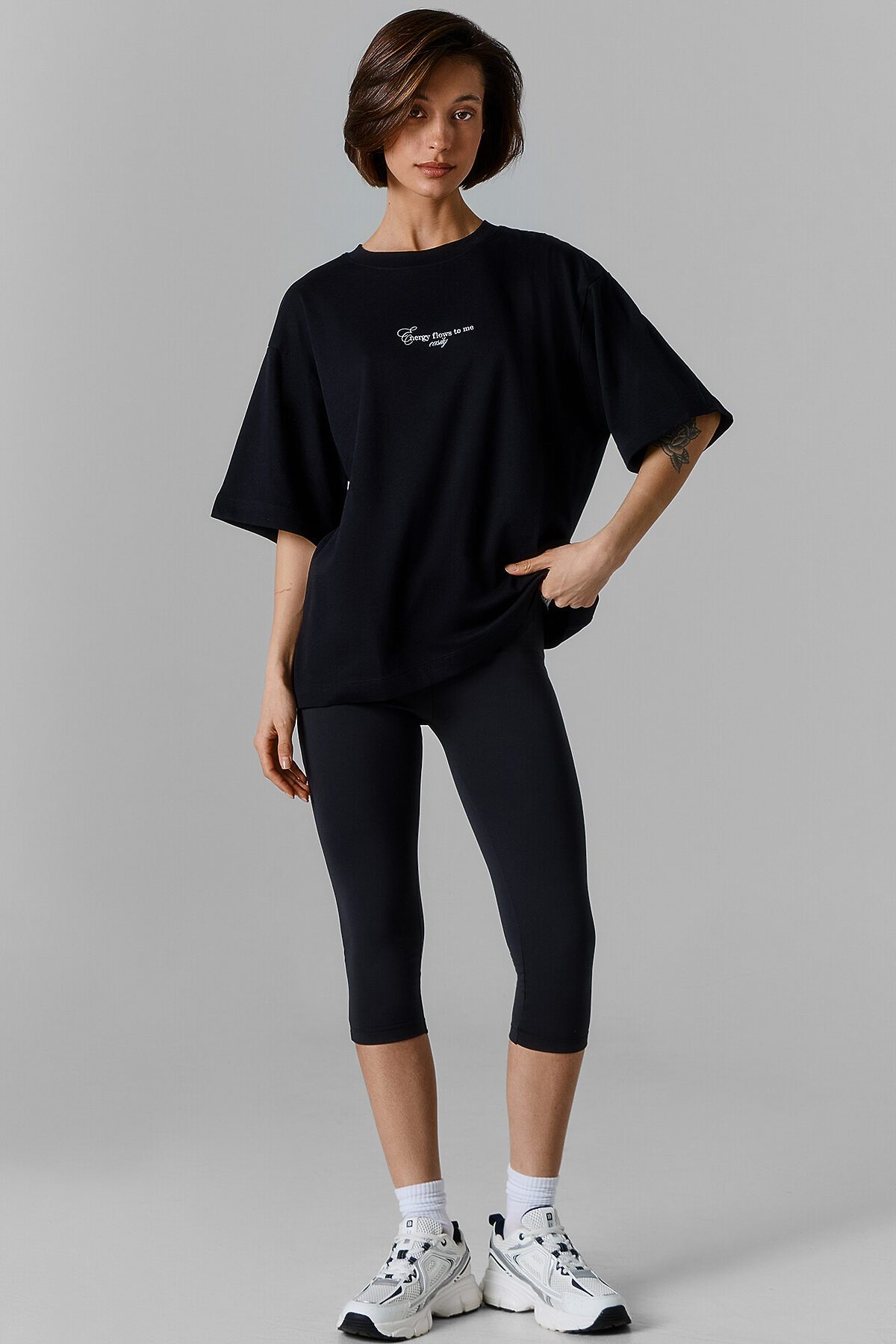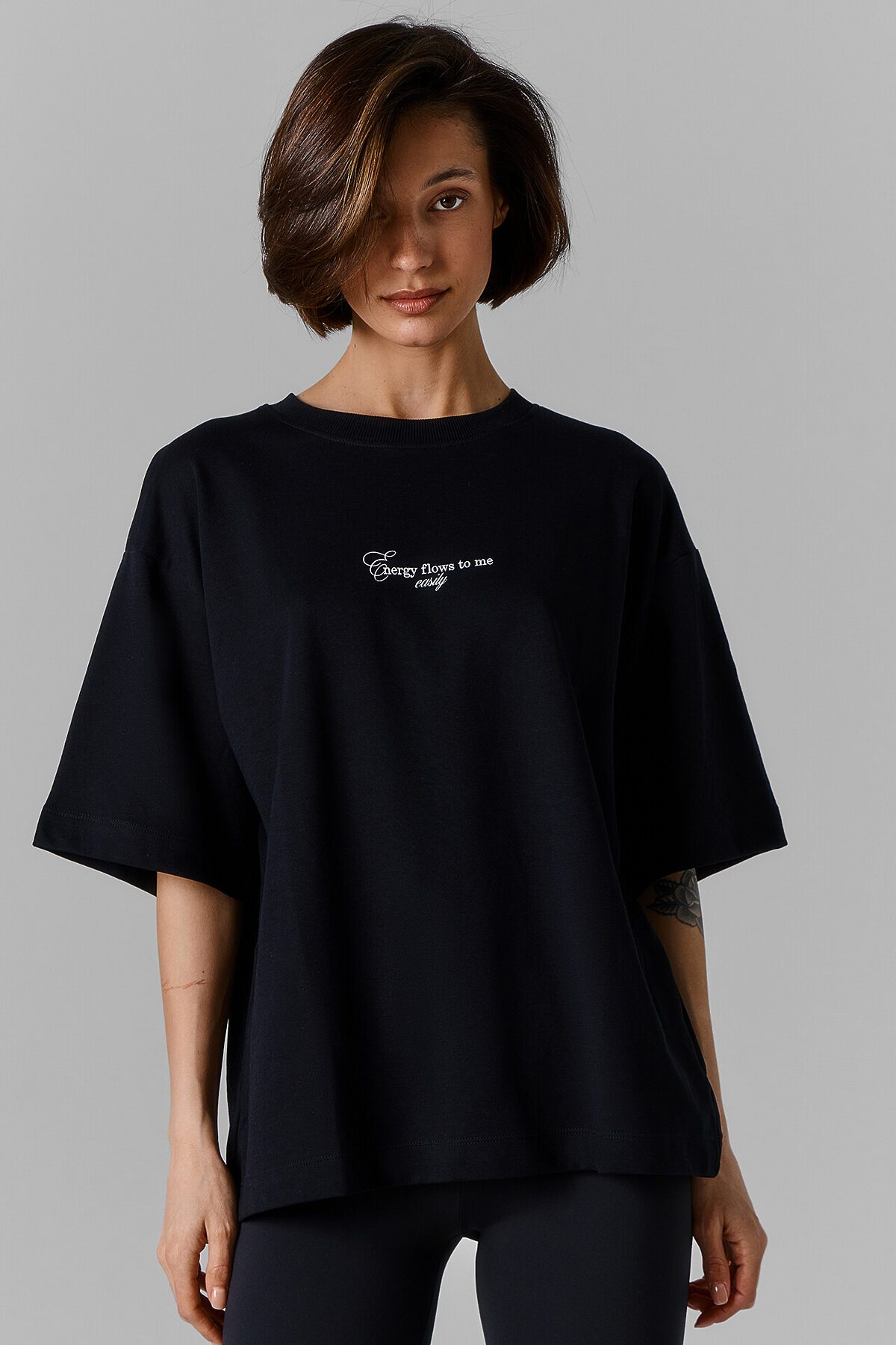 Футболка свободная, оверсайз. Горловина округлой формы обработана обтачкой из рибаны. Шов втачивания обтачки по спинке закрыт обтачкой из основного полотна. Рукава втачные, корткие. Линия плеча спущена. Нижние срезы футболки и рукавов обработаны швом вподгибку.