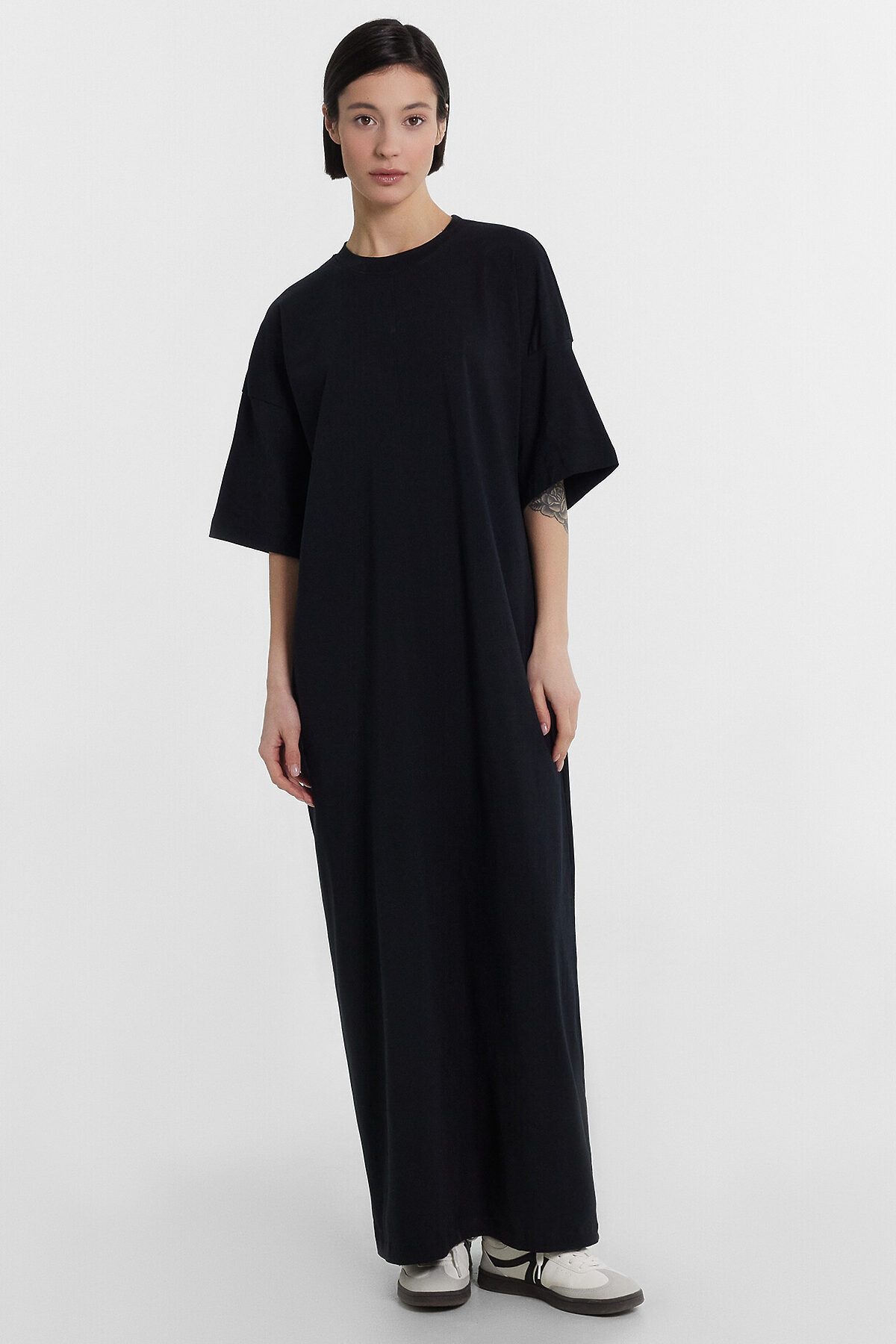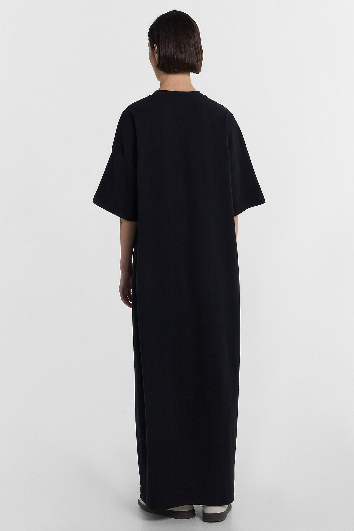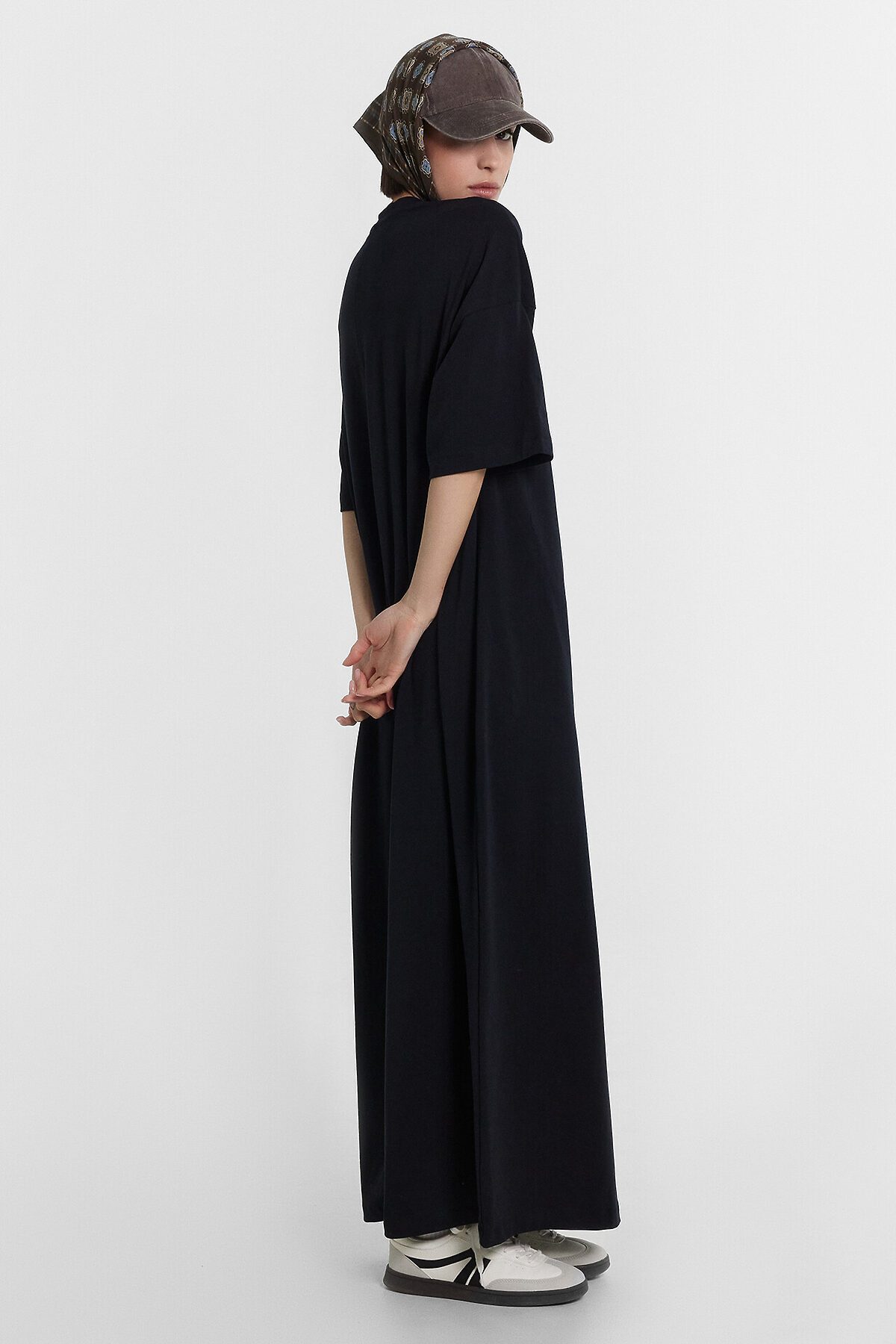 Платье свободного силуэта, длиной макси. Горловина круглая, обработана обтачкой из основного полотна. Шов втачивания обтачки по спинке закрыт бейкой из основного полотна. Рукава втачные короткие, пройма углублена. Нижние срезы платья и рукавов обработаны швом вподгибку.