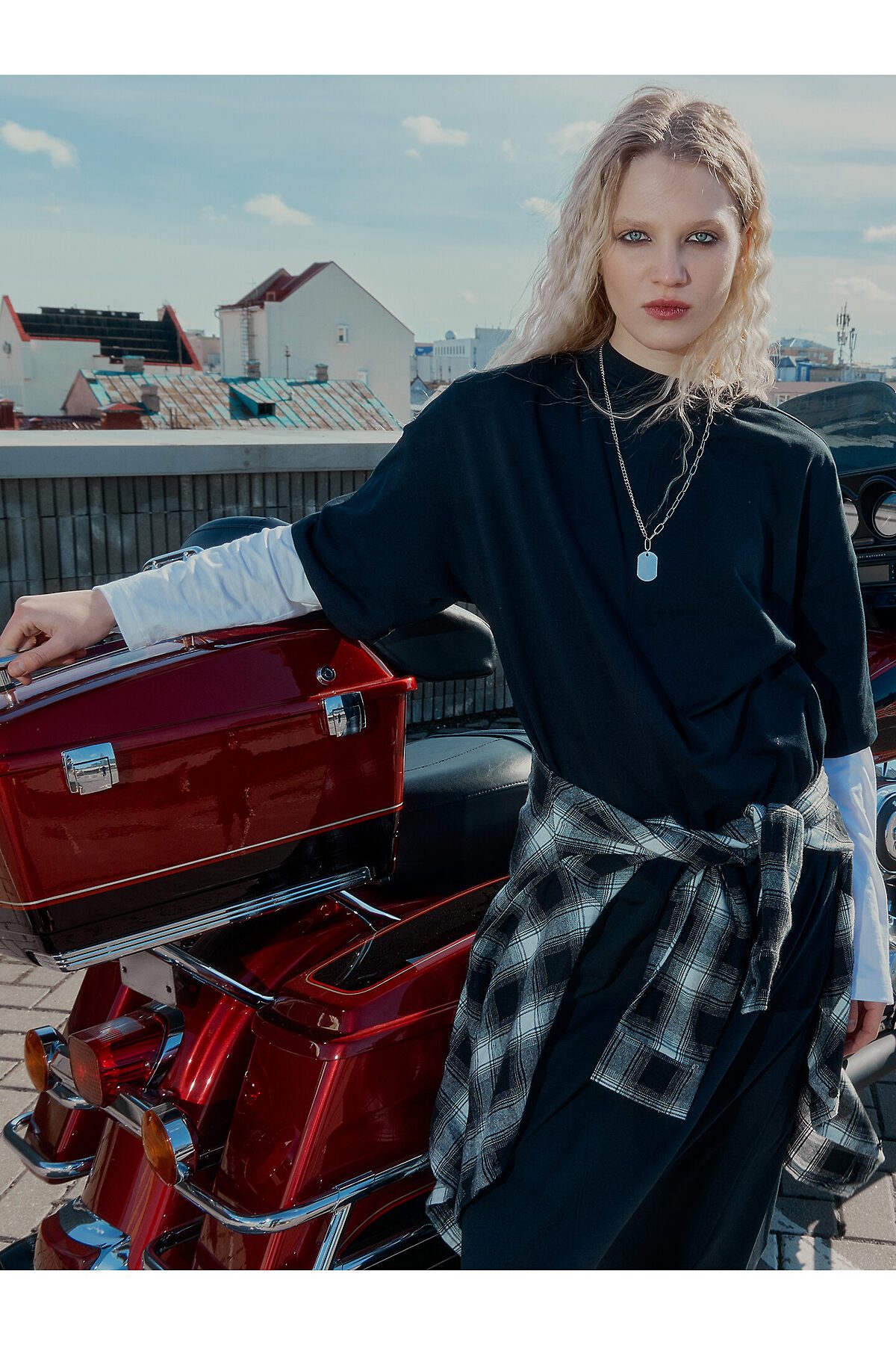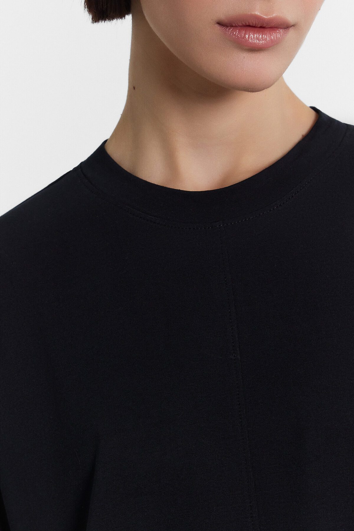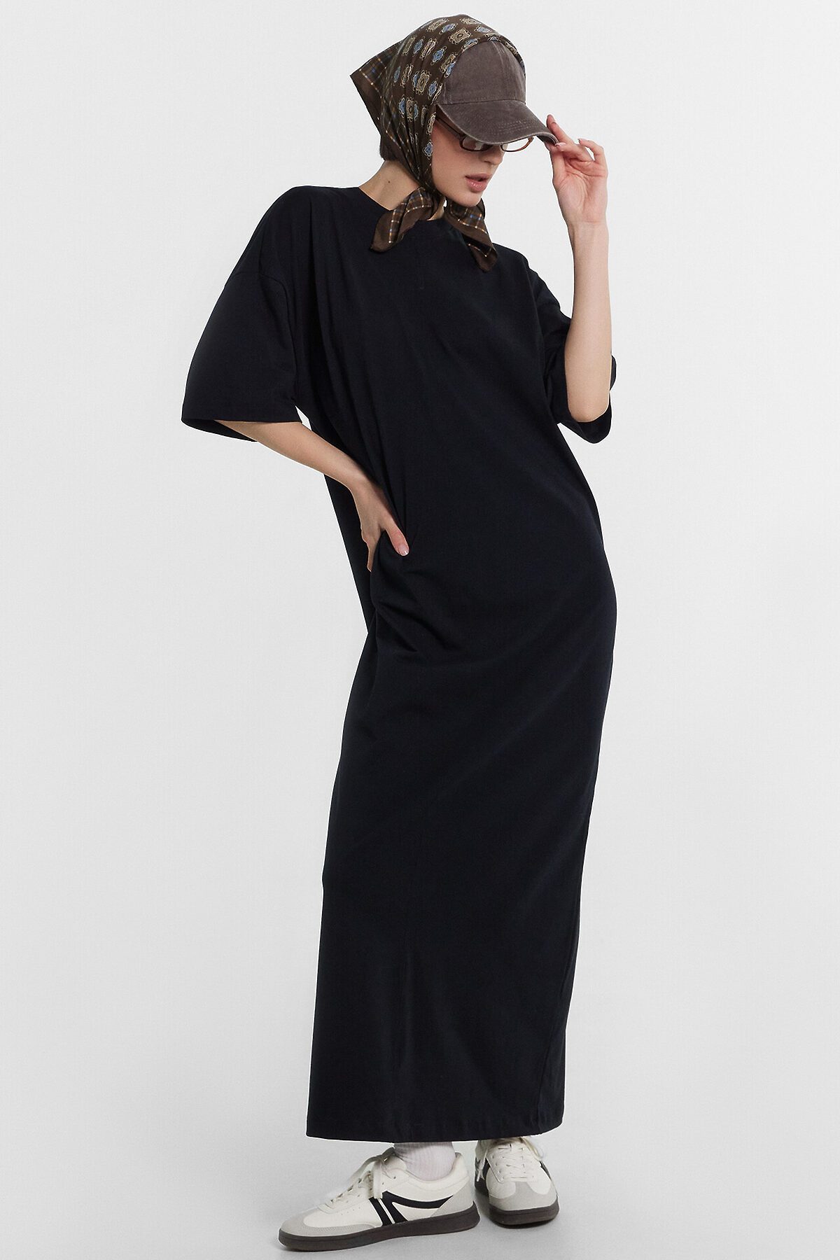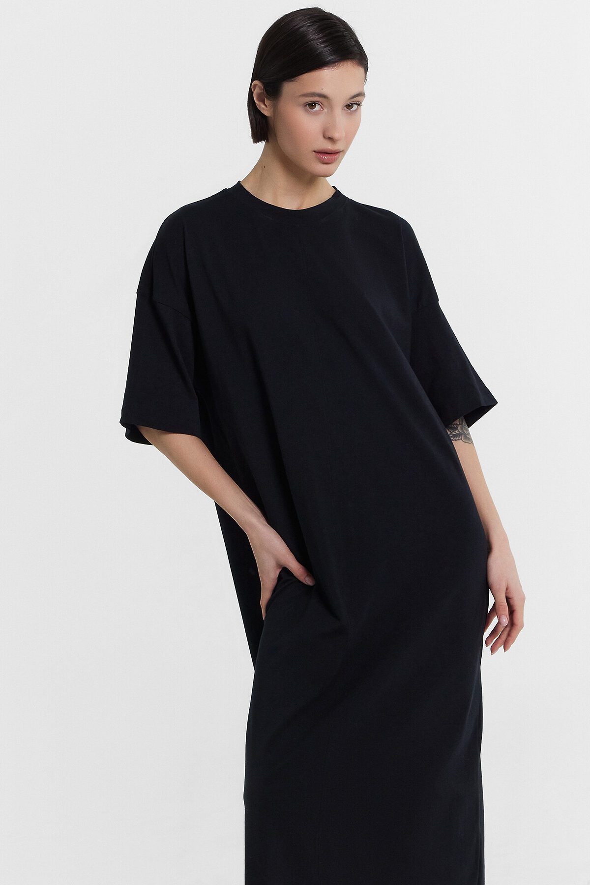 Платье свободного силуэта, длиной макси. Горловина круглая, обработана обтачкой из основного полотна. Шов втачивания обтачки по спинке закрыт бейкой из основного полотна. Рукава втачные короткие, пройма углублена. Нижние срезы платья и рукавов обработаны швом вподгибку.