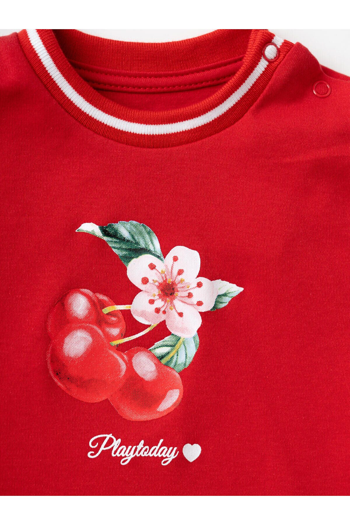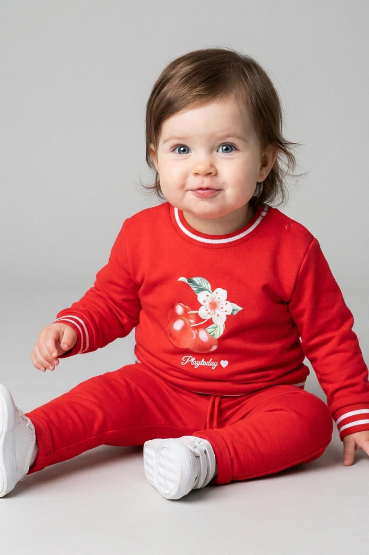 Детский костюм для девочки. Комплект выполнен из хлопкового трикотажа интерлок и состоит из свитшота и брюк на резинке. Толстовка прямого кроя с красочным принтом вишен. Манжеты и пояс выполнены из эластичного риба, благодаря чему изделие хорошо держит форму. Брюки — комфортные, с эластичным поясом и шнуром для регулировки посадки.