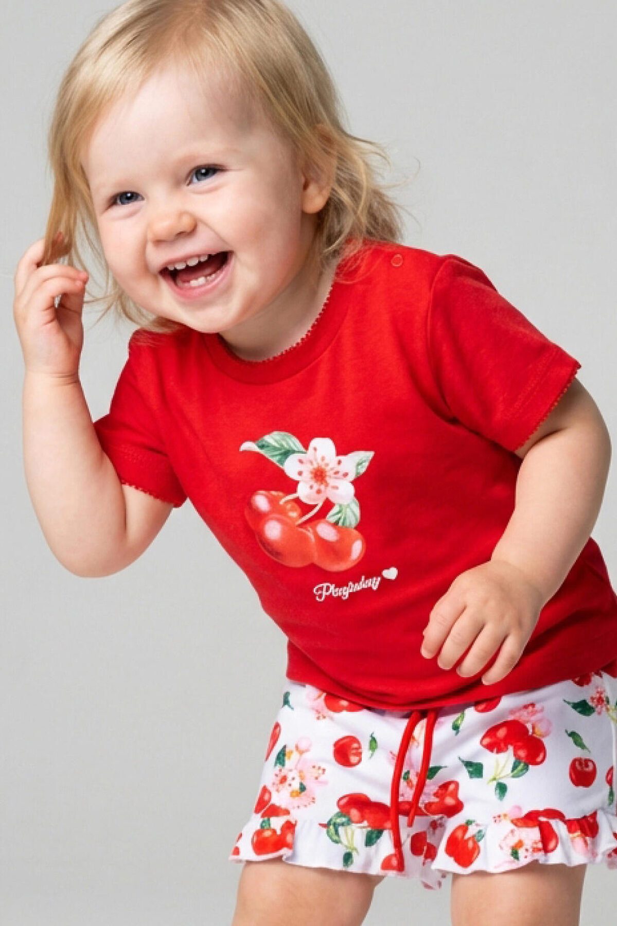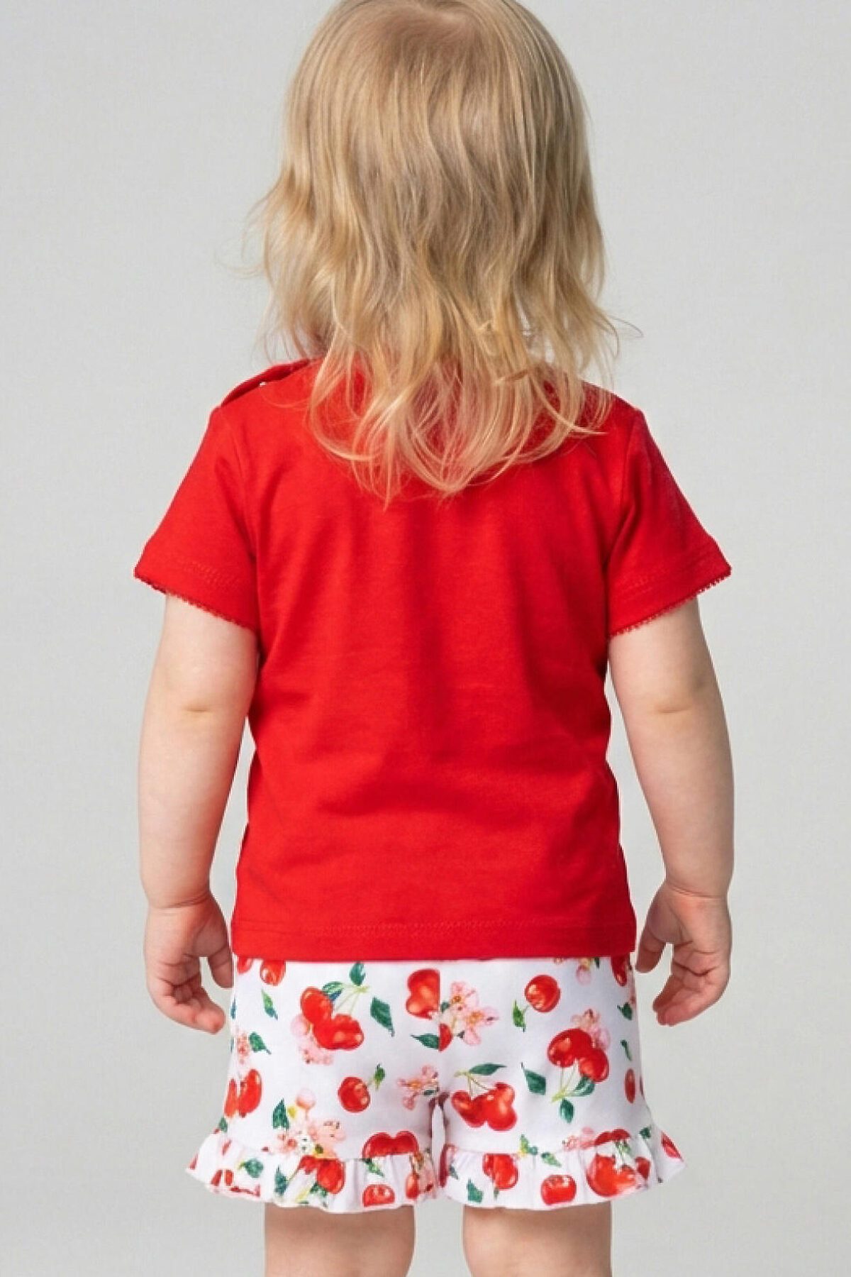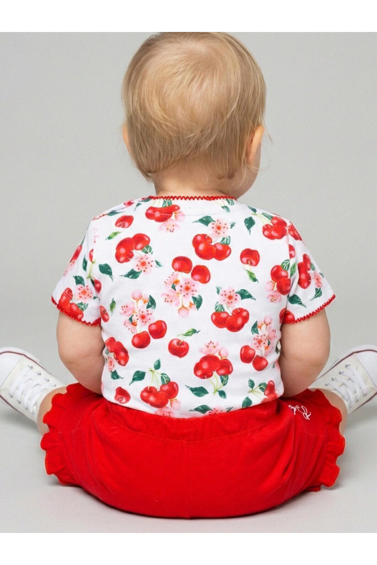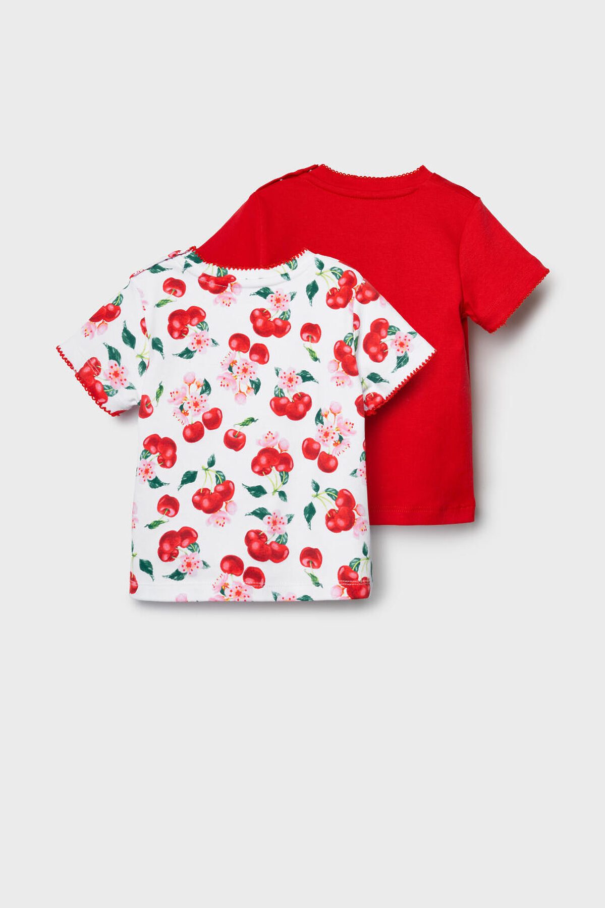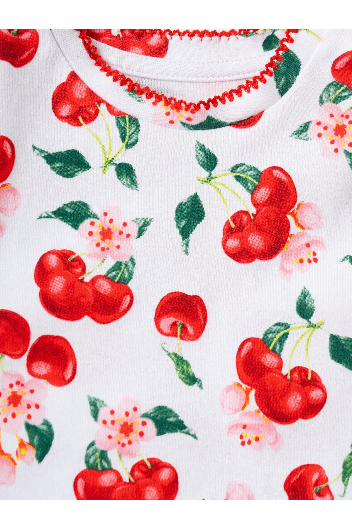 Набор детских футболок для девочки. Комплект из 2 футболок выполнен из хлопкового трикотажа интерлок. Застежка на плече на кнопках для удобного переодевания. Яркие красочные принты с вишнями, цветами и листьями.