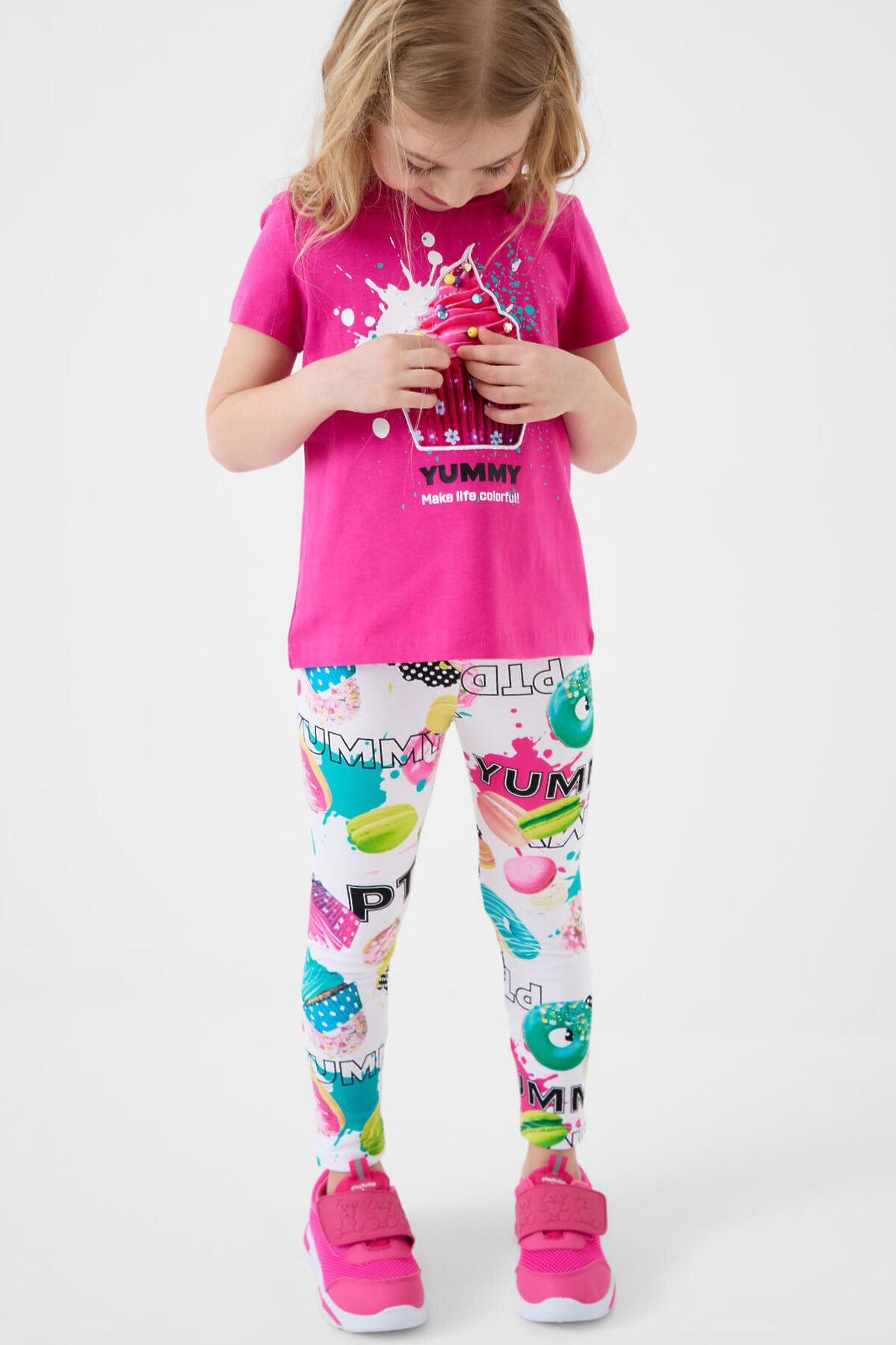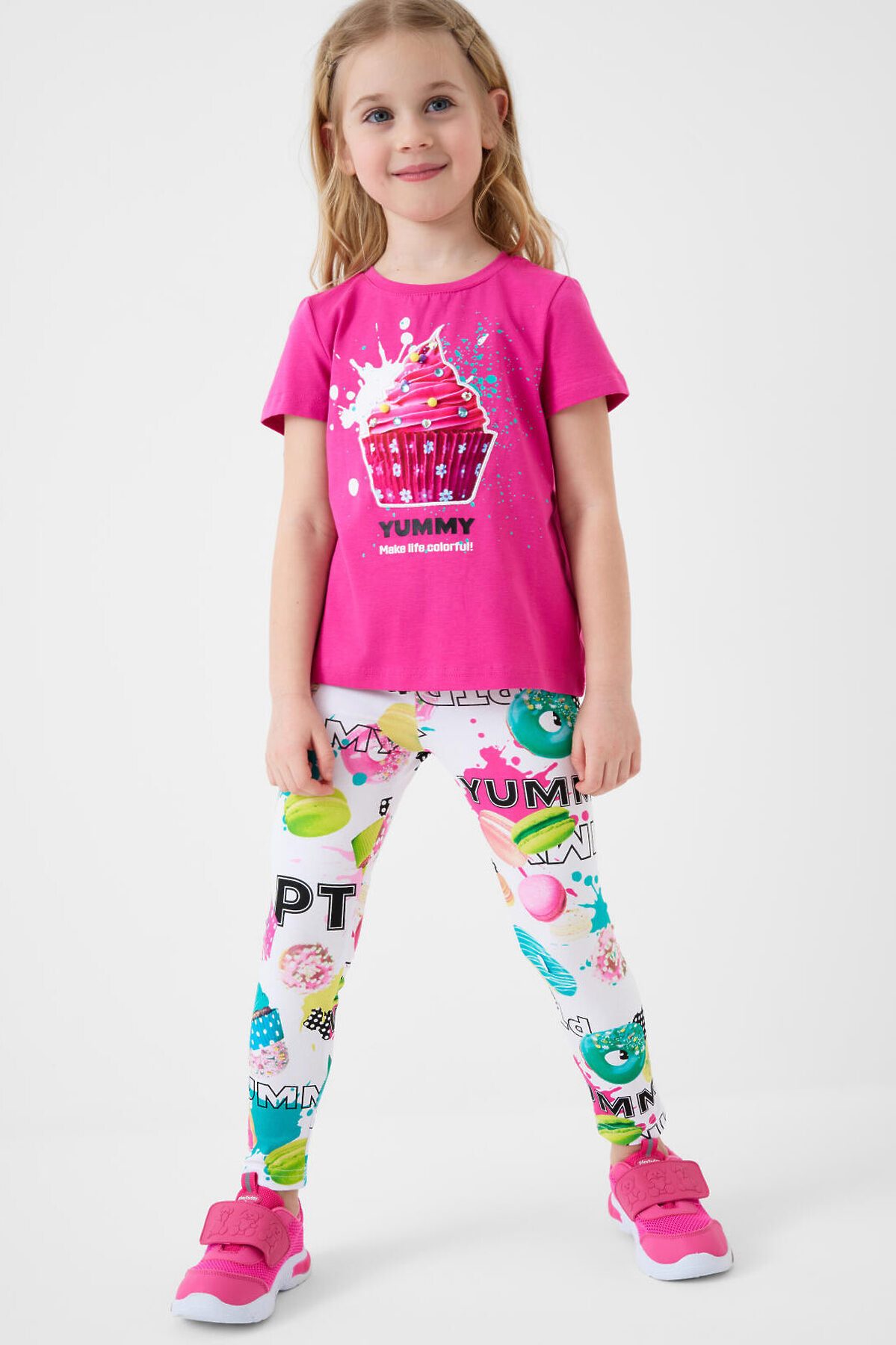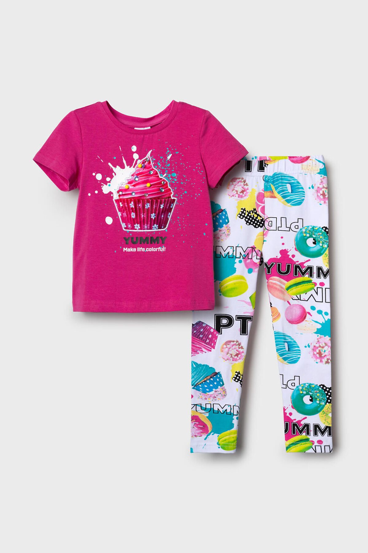 Летний детский комплект для девочки. Состоит из футболки с коротким рукавом и легинсов с ярким принтом. Футболка прямого кроя, выполнена из хлопкового трикотажа джерси и украшена красочным принтом с капкейком. Леггинсы на резинке выполнены из хлопкового трикотажа джерси. Принт на легинсах с донатами, капкейками и макарунами.
