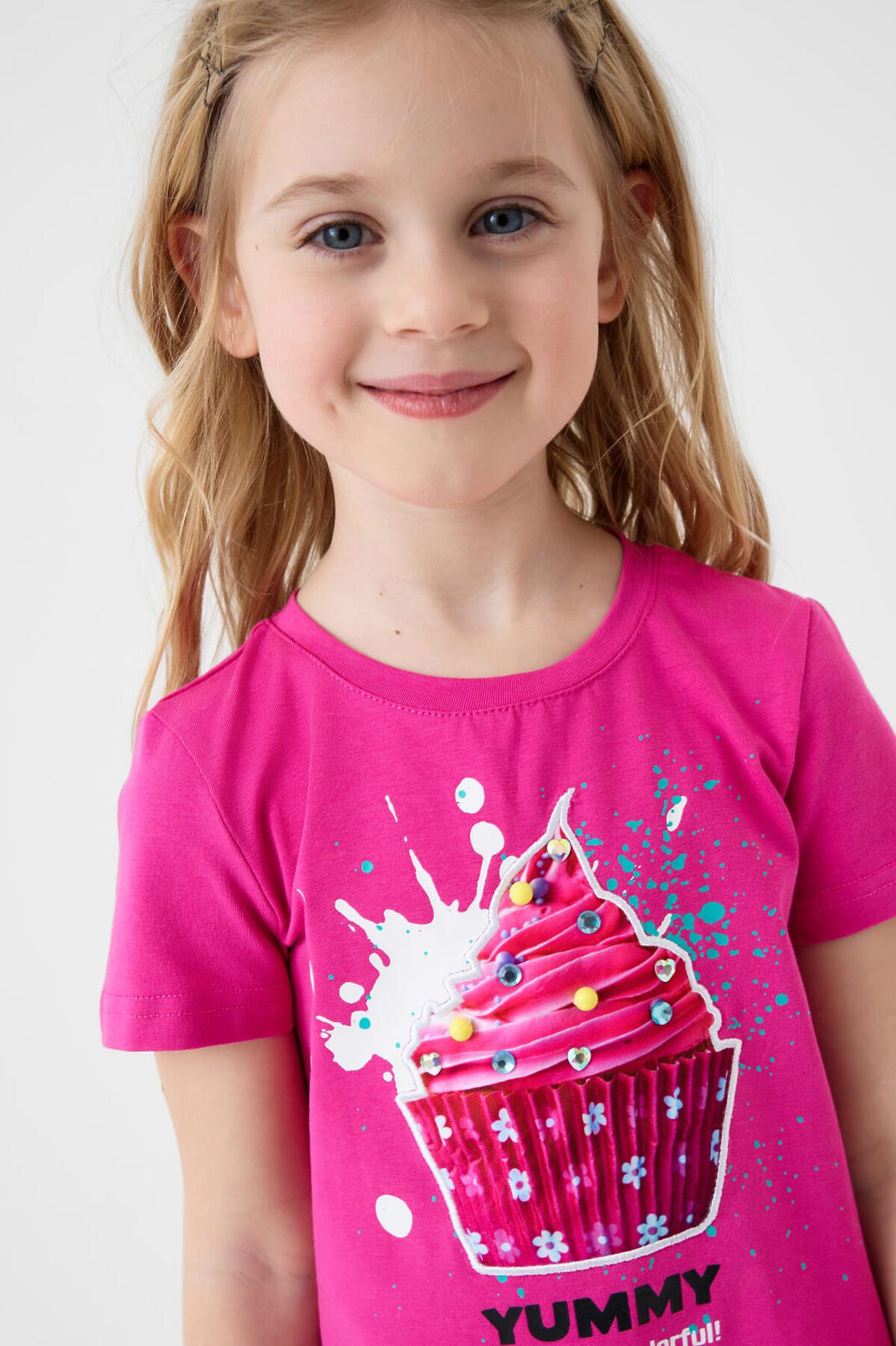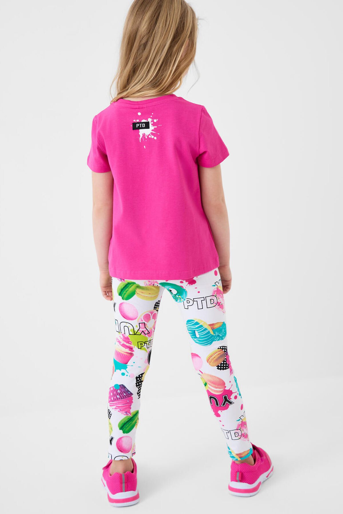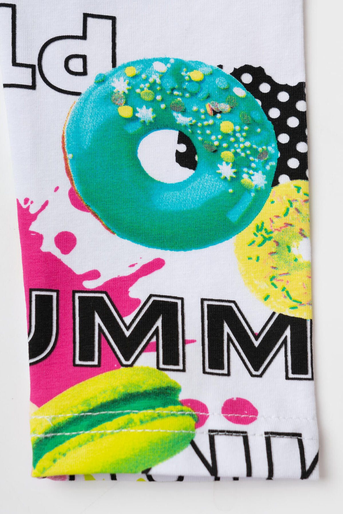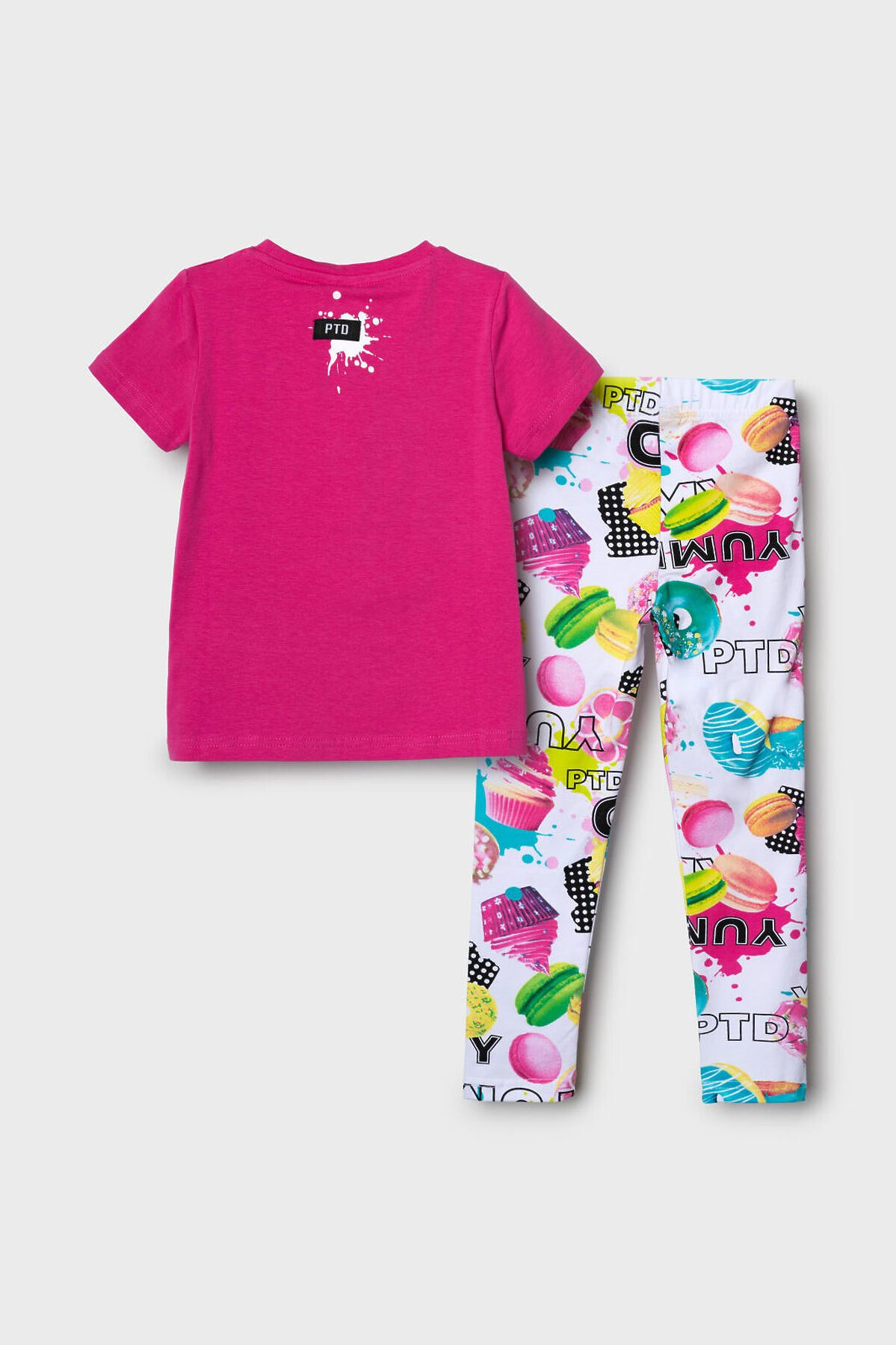 Летний детский комплект для девочки. Состоит из футболки с коротким рукавом и легинсов с ярким принтом. Футболка прямого кроя, выполнена из хлопкового трикотажа джерси и украшена красочным принтом с капкейком. Леггинсы на резинке выполнены из хлопкового трикотажа джерси. Принт на легинсах с донатами, капкейками и макарунами.