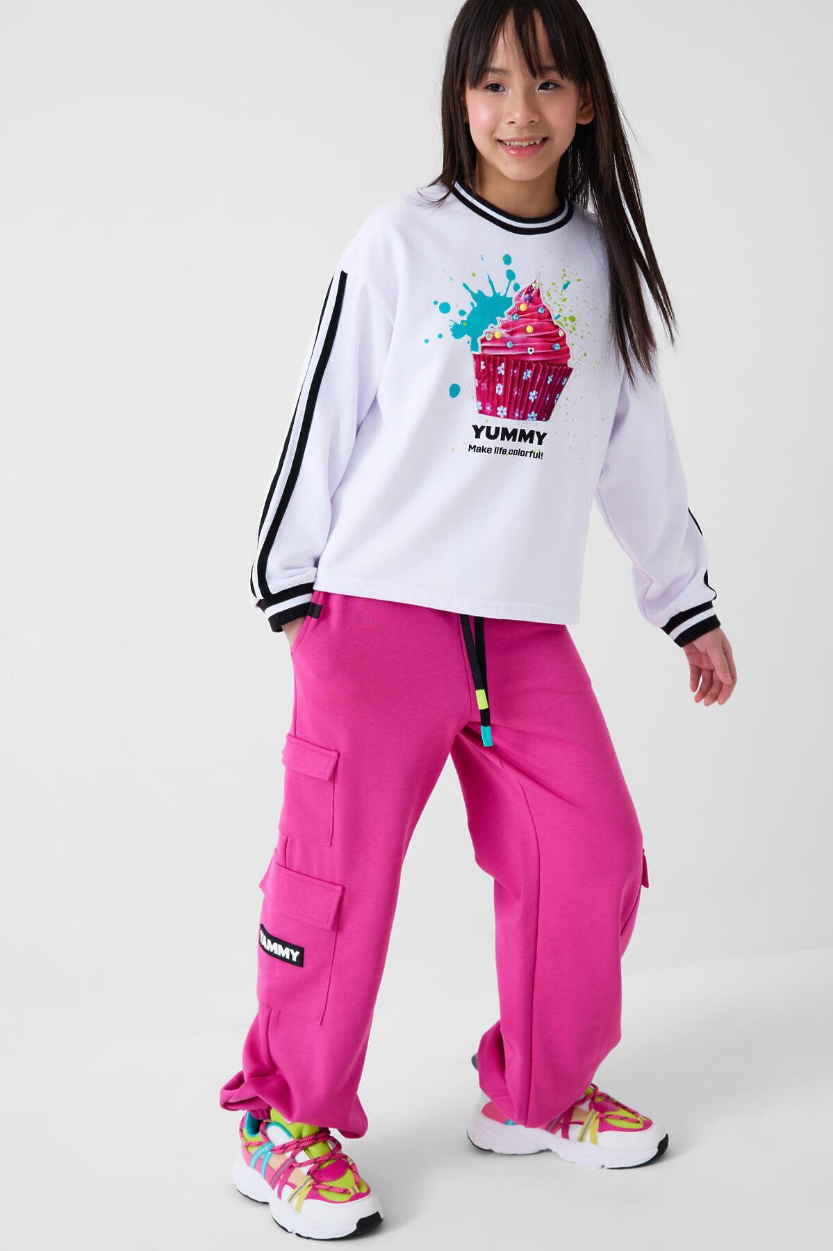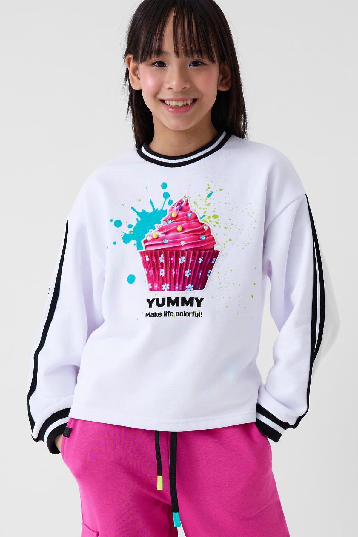 Свитшот оверсайз для девочки подростка. Выполнен из хлопкового футера без начеса. На передней части — выразительный принт с капкейком. Низ изделия и рукава оформлены эластичными резинками. Модель укороченная, длиной до бедер.