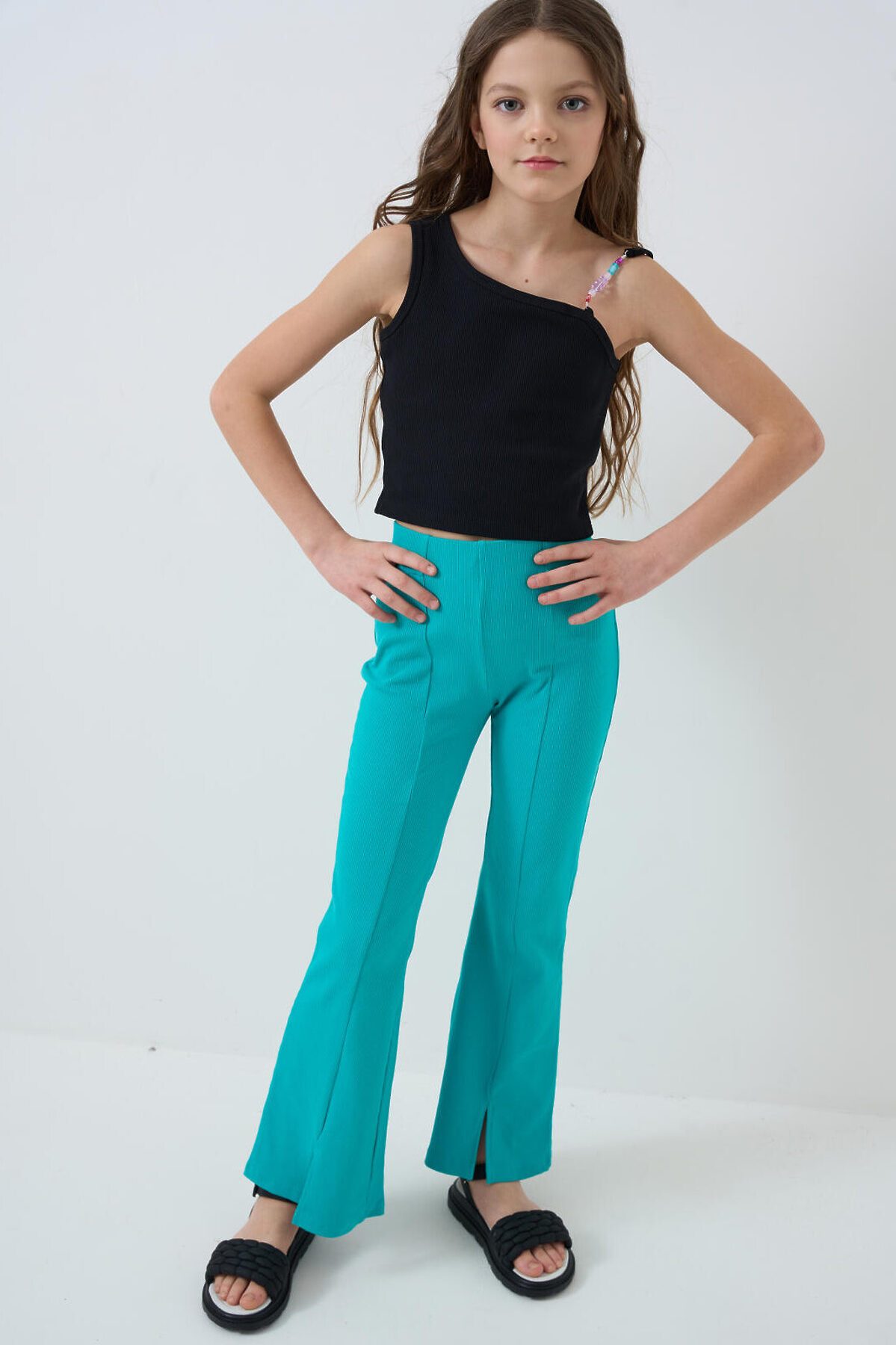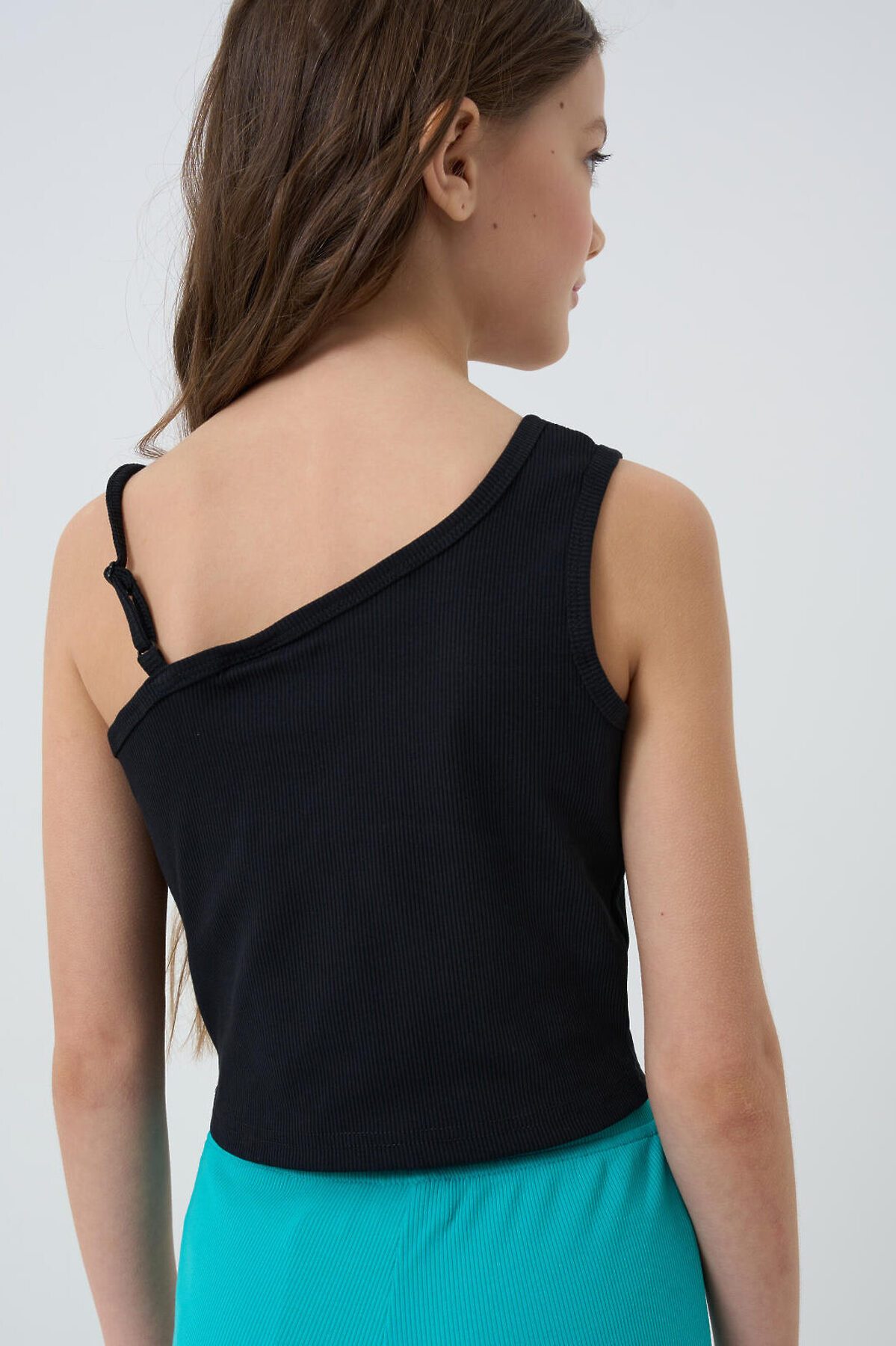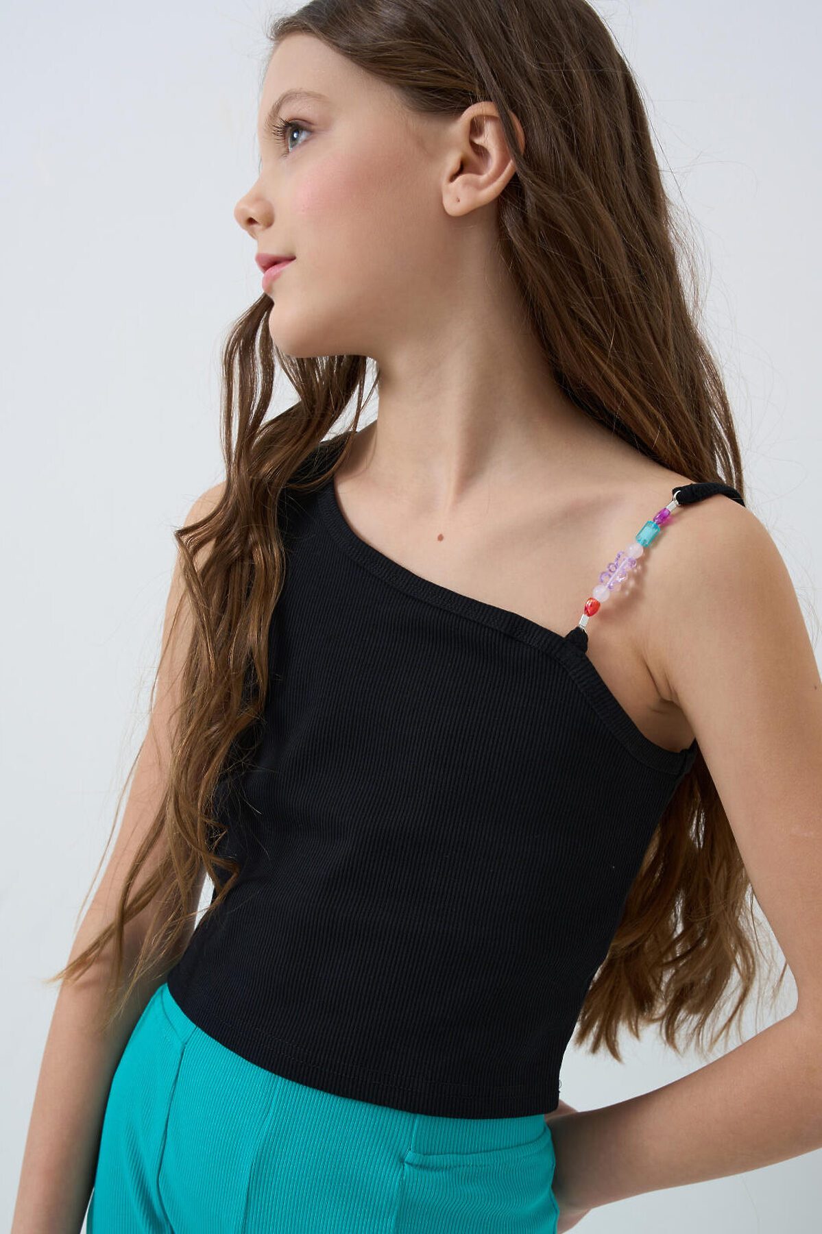 Укороченный трикотажный топ в рубчик для девочки подростка. Асимметричный крой — на одно плечо, с декоративной бретелью, украшенной цветными бусинами. Декор в виде бусин придаёт изделию яркий, модный акцент.