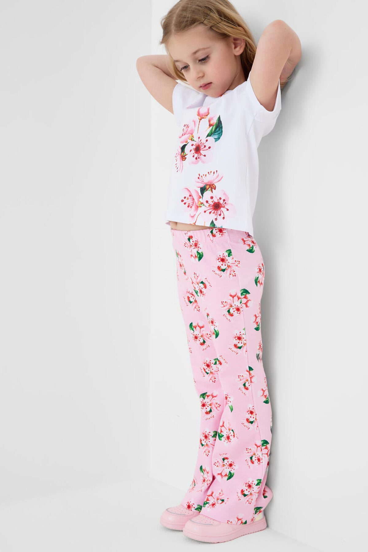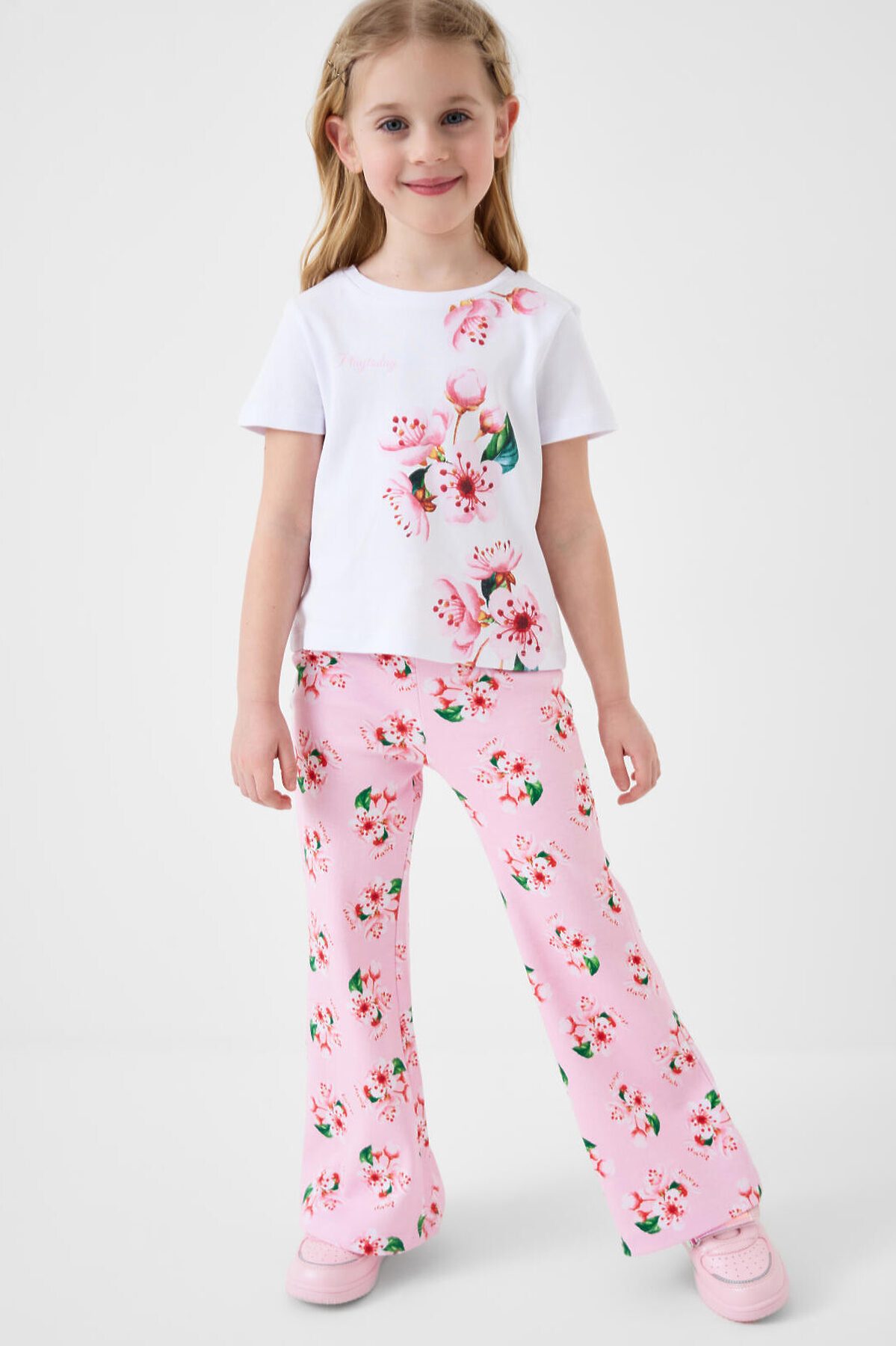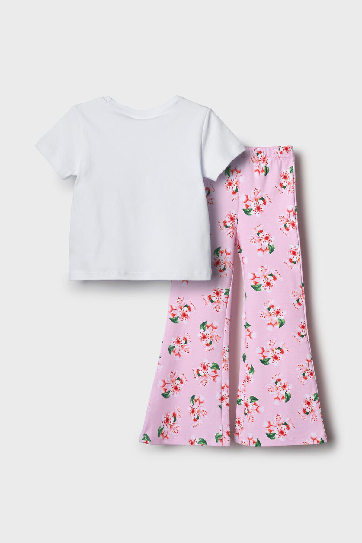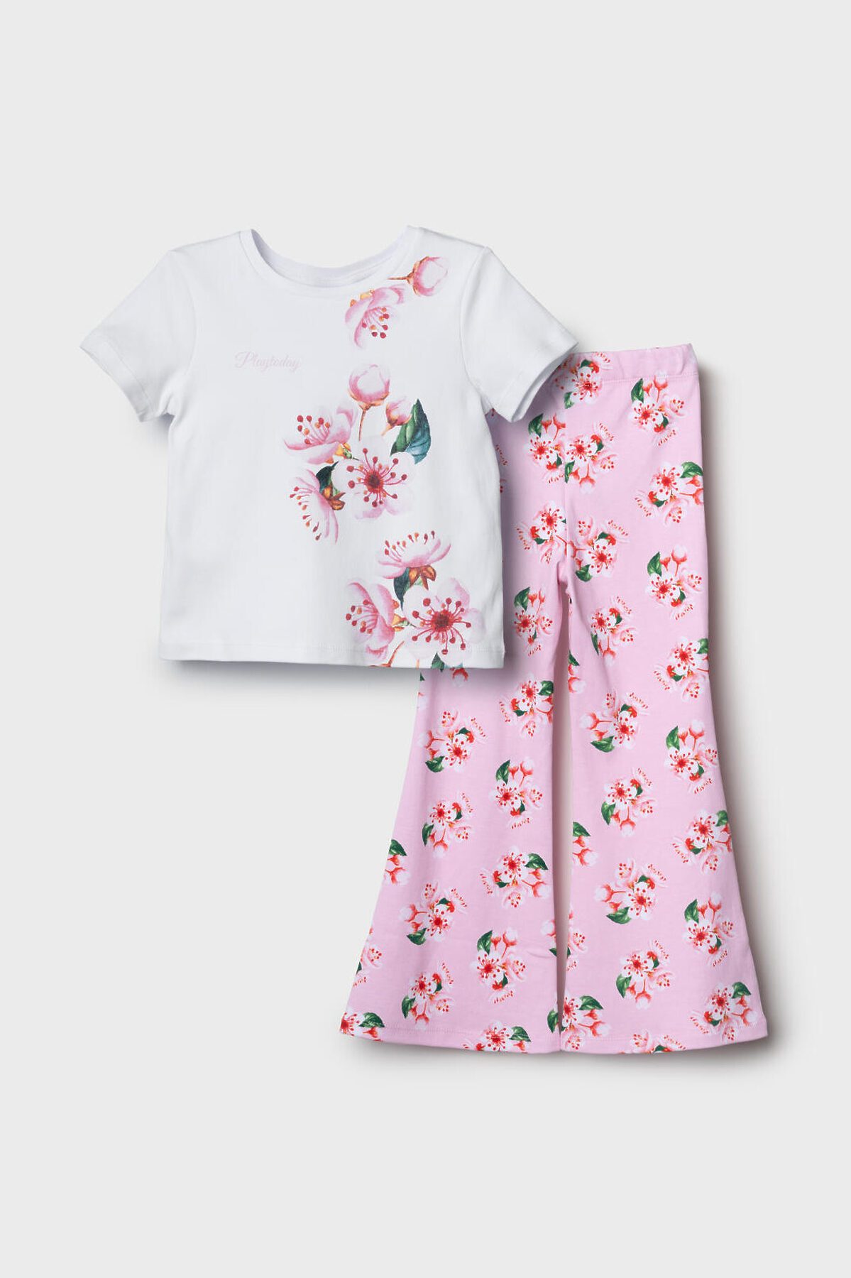 Детский комплект для девочки. Состоит из футболки и брюк клеш на резинке. Выполнен из хлопкового трикотажа. Футболка прямого силуэта, с короткими рукавами. Украшена нежным цветочным принтом. Брюки — расклешенные с эластичным поясом.