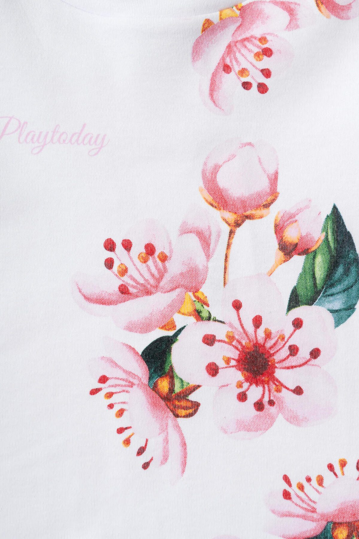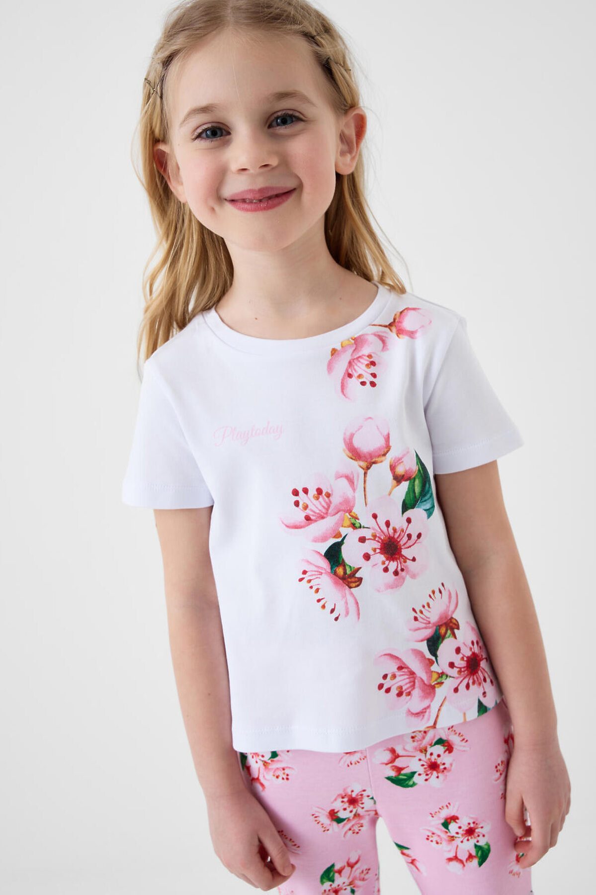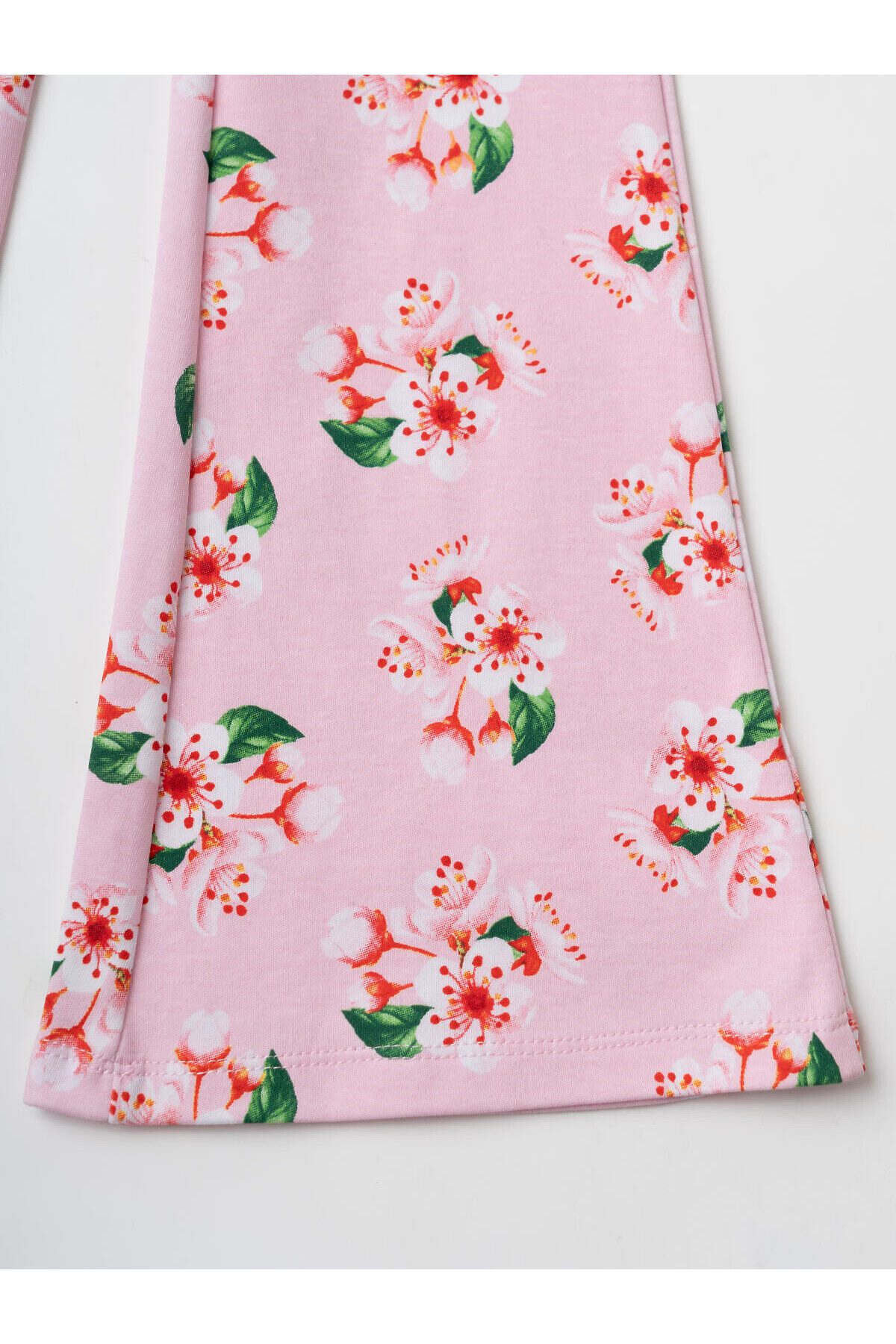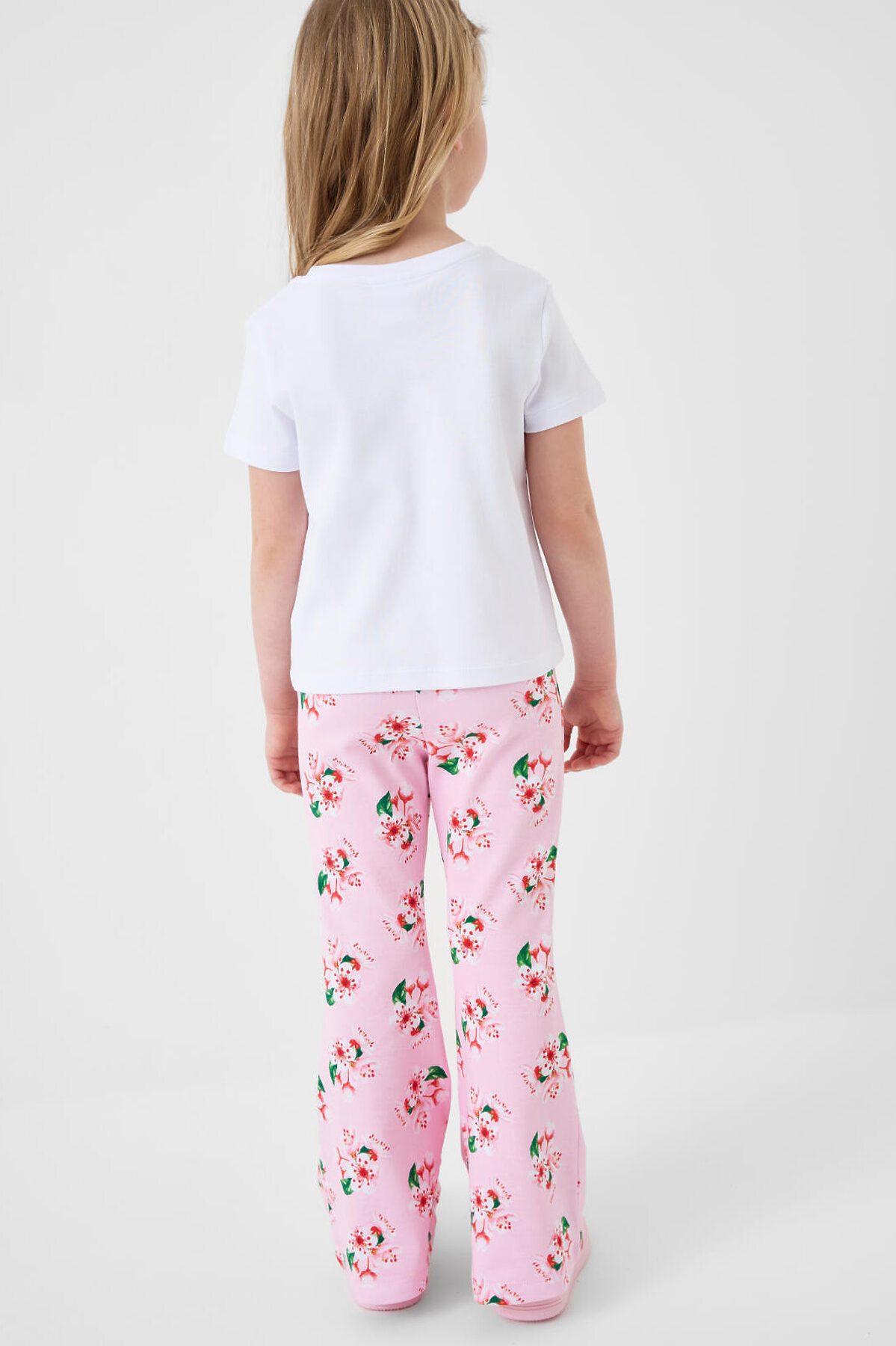 Детский комплект для девочки. Состоит из футболки и брюк клеш на резинке. Выполнен из хлопкового трикотажа. Футболка прямого силуэта, с короткими рукавами. Украшена нежным цветочным принтом. Брюки — расклешенные с эластичным поясом.