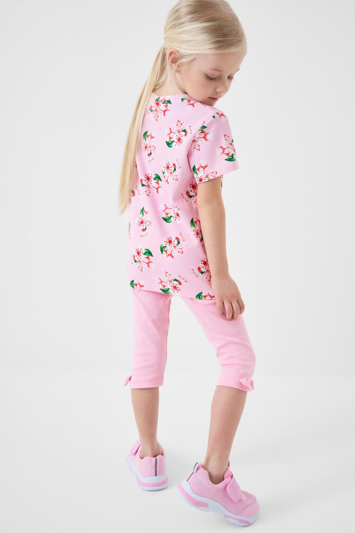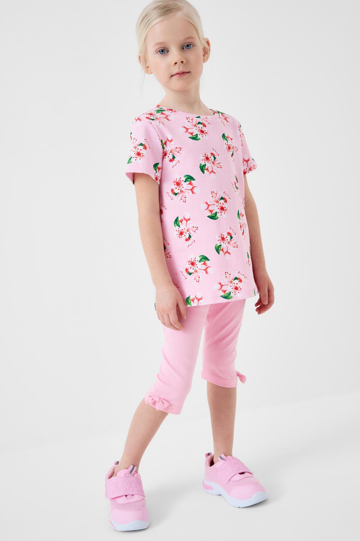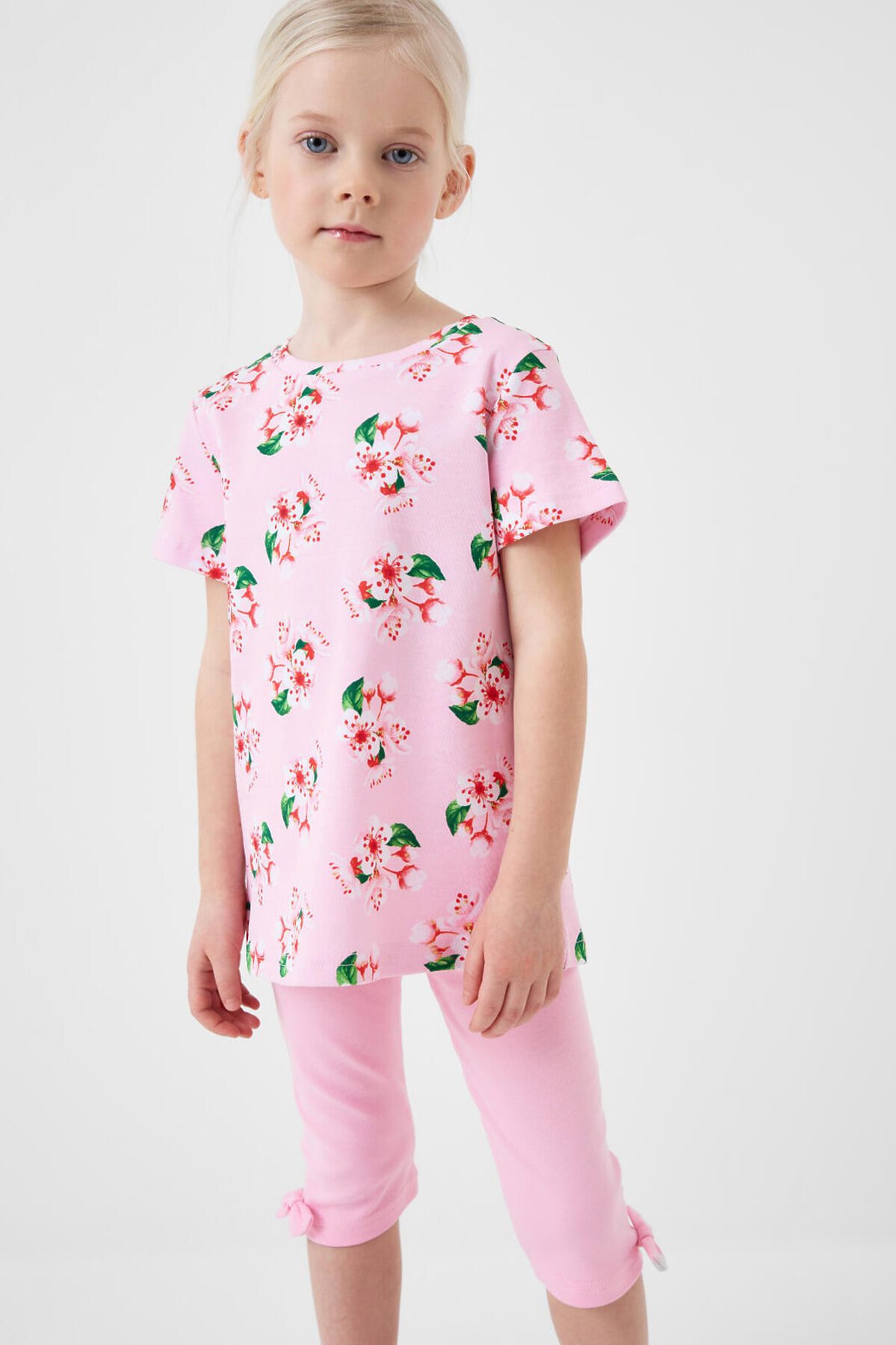 Детский комплект для девочки. Состоит из футболки прямого кроя, с коротким рукавом и укороченных легинсов. Футболка из хлопкового трикотажа интерлок, с нежным цветочным принтом. Легинсы выполнены из однотонного хлопкового трикотажа, хорошо тянутся и комфортно сидят по фигуре. Пояс с резинкой обеспечивает удобную посадку. Украшены рюшами из сетки и декоративным бантом.