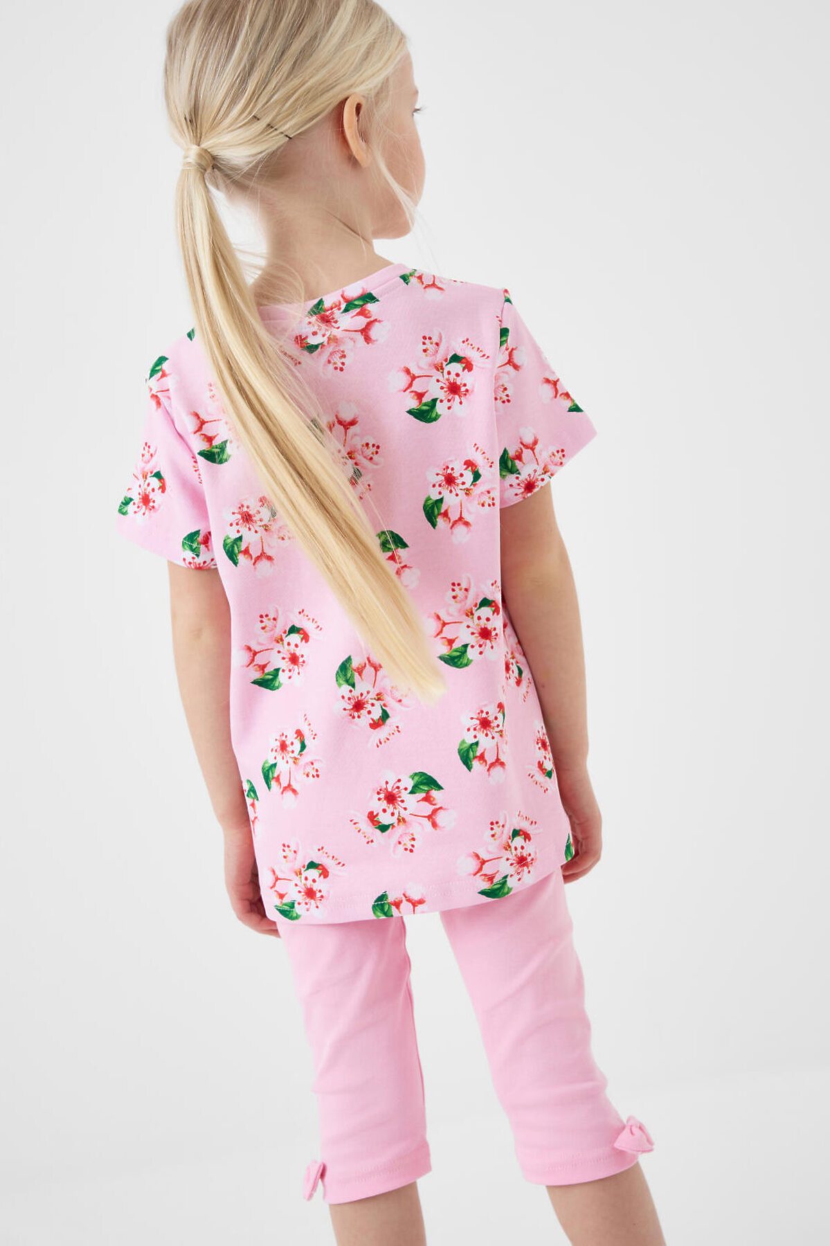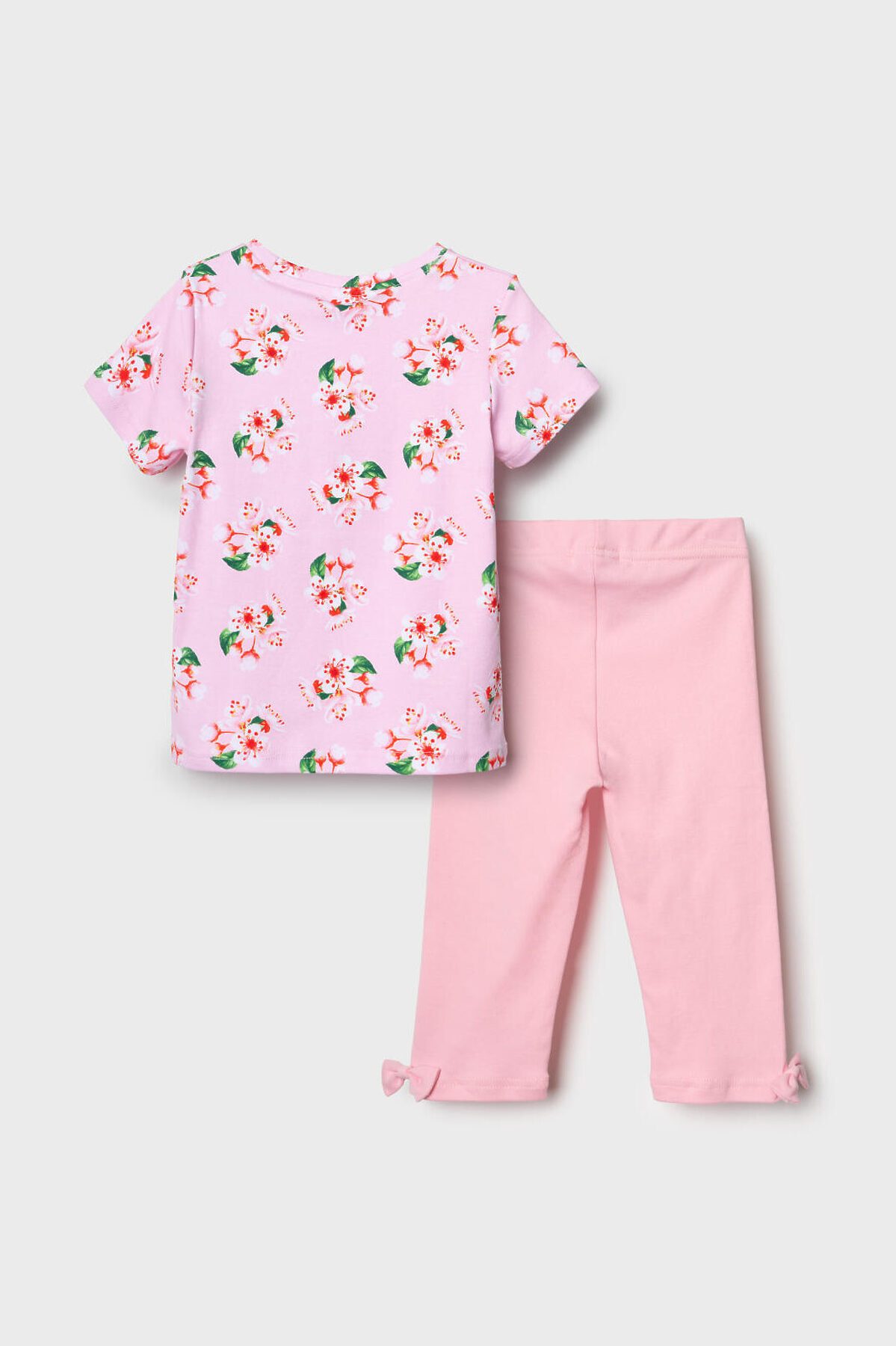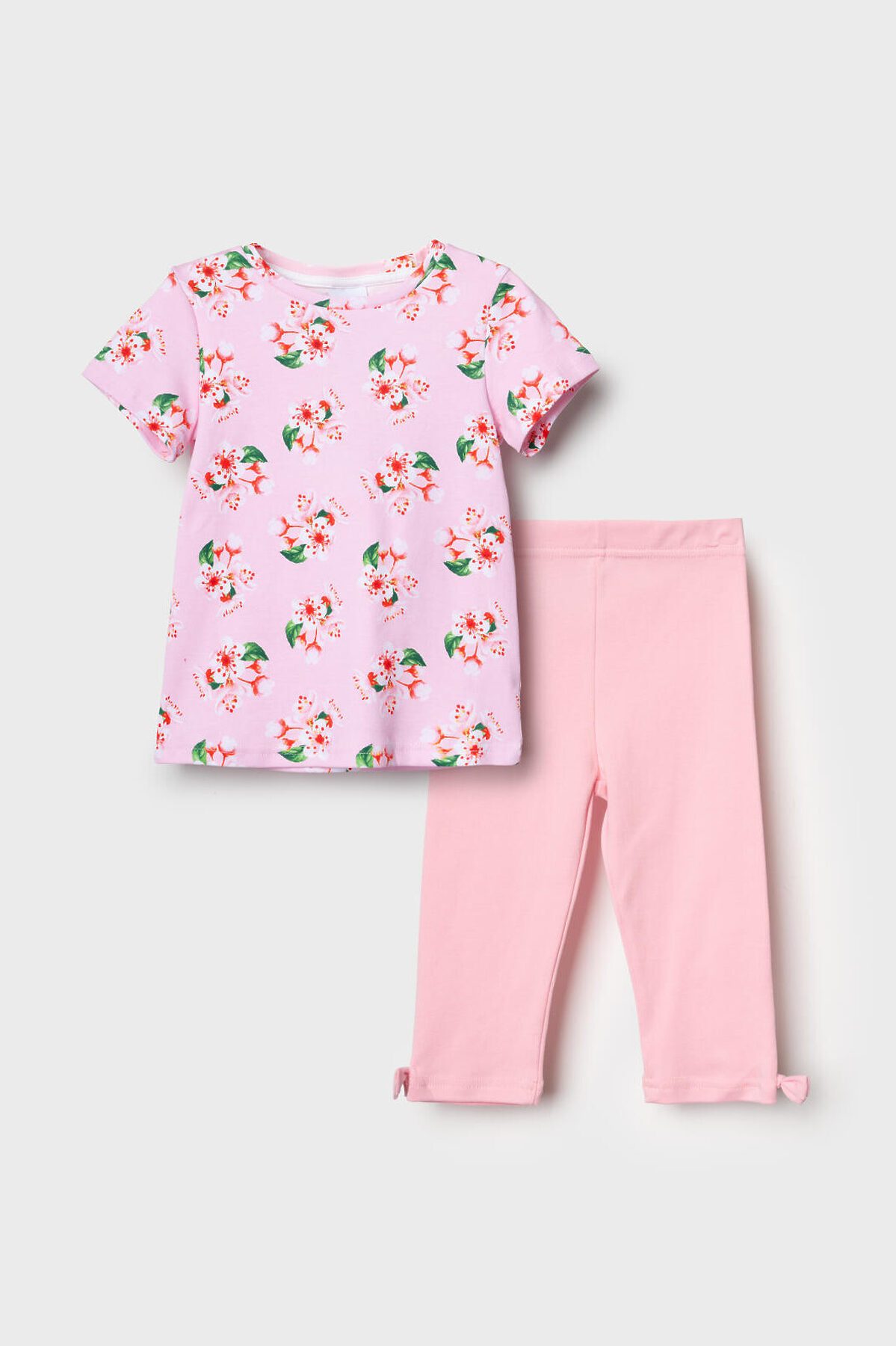 Детский комплект для девочки. Состоит из футболки прямого кроя, с коротким рукавом и укороченных легинсов. Футболка из хлопкового трикотажа интерлок, с нежным цветочным принтом. Легинсы выполнены из однотонного хлопкового трикотажа, хорошо тянутся и комфортно сидят по фигуре. Пояс с резинкой обеспечивает удобную посадку. Украшены рюшами из сетки и декоративным бантом.