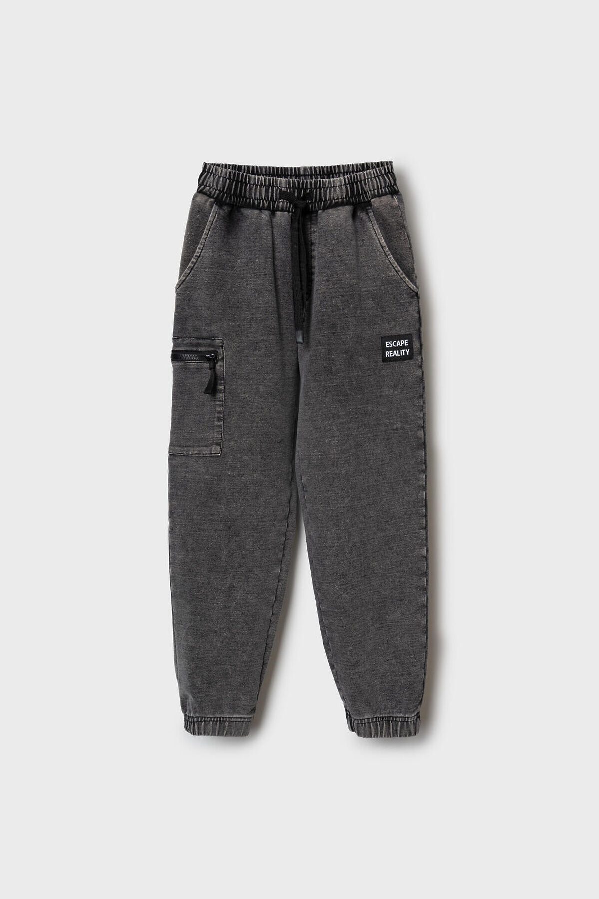 Брюки-джоггеры для мальчика подростка. Выполнены из хлопкового трикотажа по виду похожего деним. Модель свободного кроя со средней посадкой на талии. Пояс выполнен на резинке, дополнительно регулируется шнурком. По бокам — удобные карманы, накладной карман-карго. В нижней части брючин предусмотрены резинки для лучшей фиксации. Брюки украшены лейблом с прорезиненным принтом.