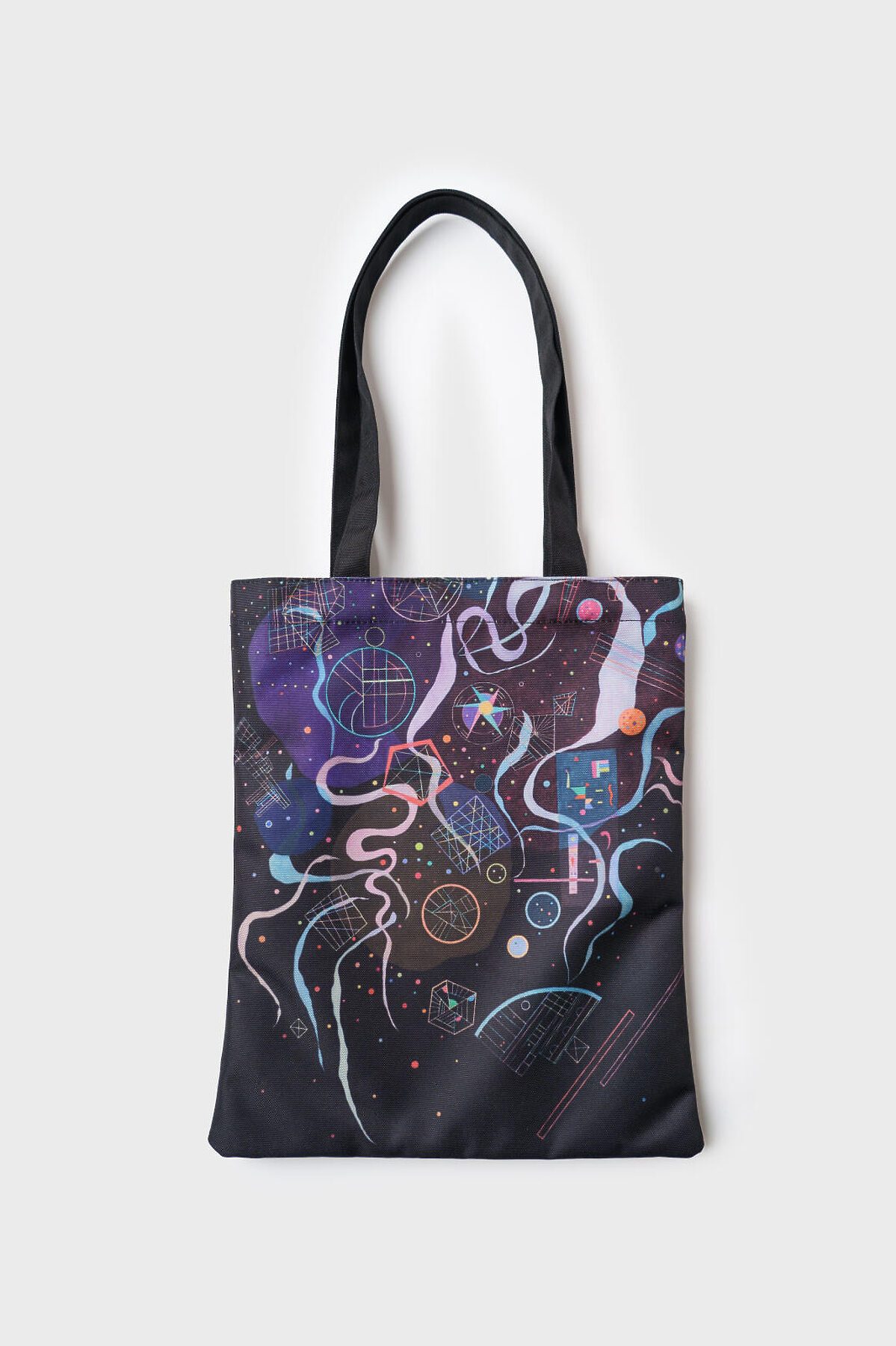 Легкая, вместительная и удобная сумка-шопер для девочки-подростка из коллаборации с Третьяковской галереей. Принт - фрагмент картины Василия Кандинского, Движение, 1935. Она не занимает много места, если ее сложить и носить с собой и использовать при необходимости. Параметры сумки: высота - 39 см (без ручек), ширина -33см, глубина - 1 см