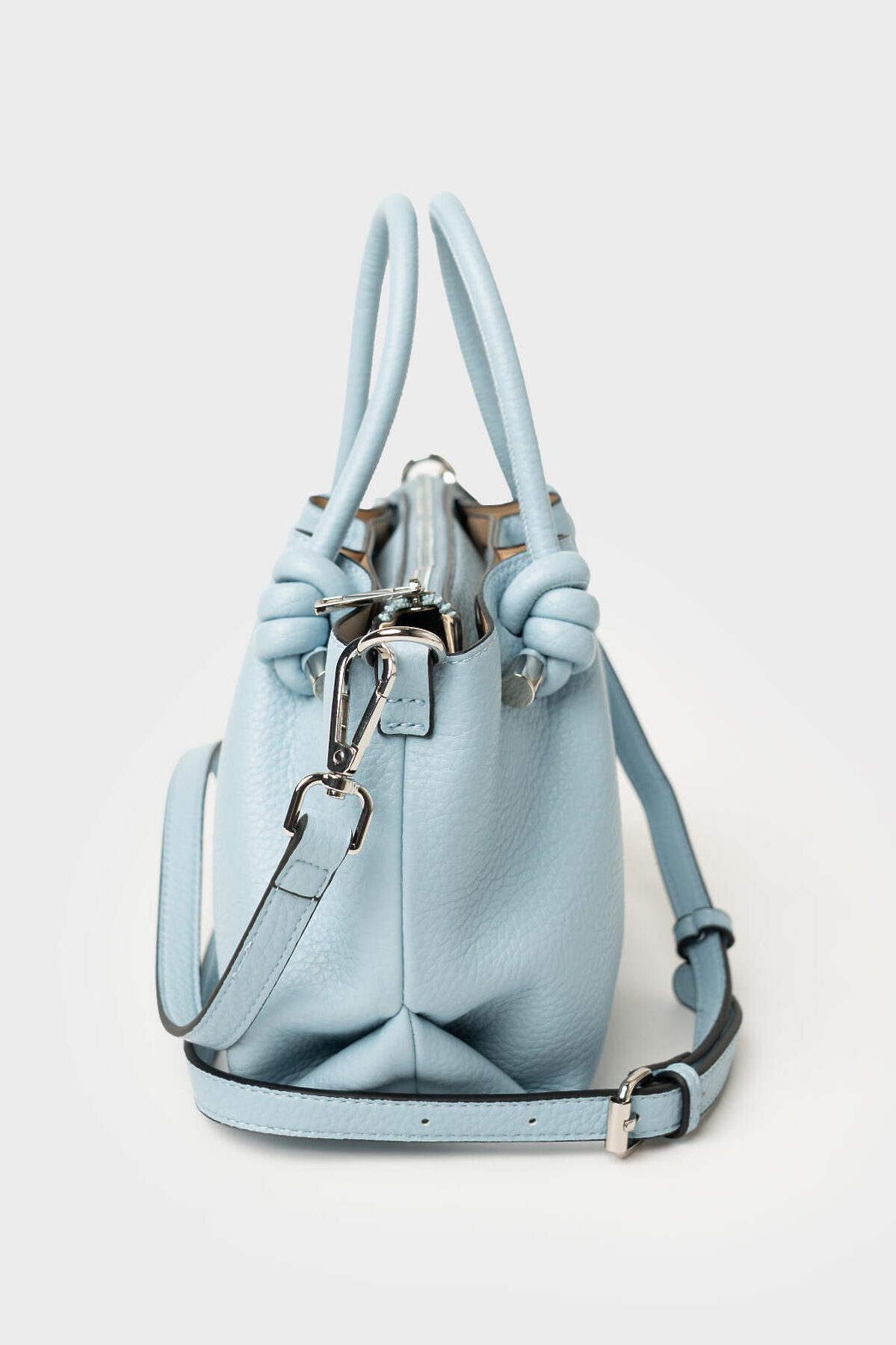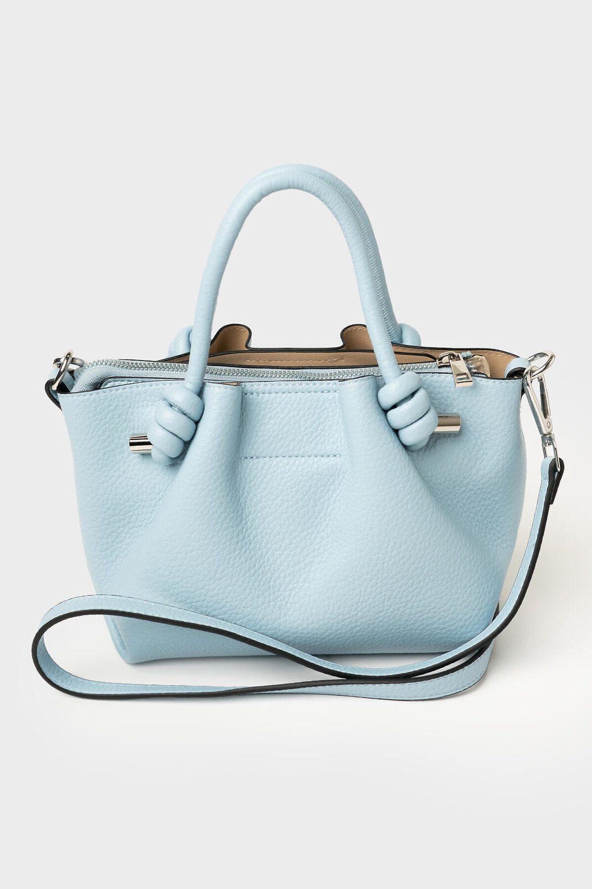 Небольшая женская сумка кросс-боди. Сумка выполнена из мягкой тисненной кожи трендового голубого цвета. Сумка имеет одно основное отделение на молнии и два дополнительных отделения на кнопках. Внутри есть два кармана, один из них на молнии. Сумка имеет регулируемый плечевой ремень. Параметры сумки: высота - 18 см, ширина - 23 см, глубина - 11 см. В подарок идет брендированный пыльник.