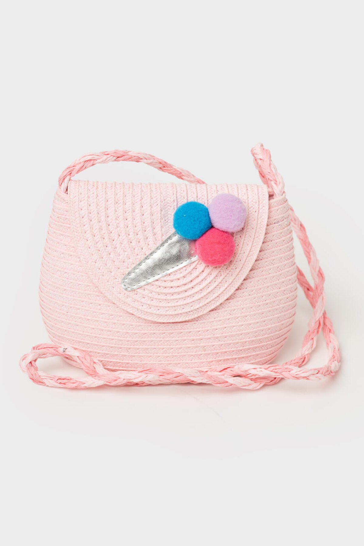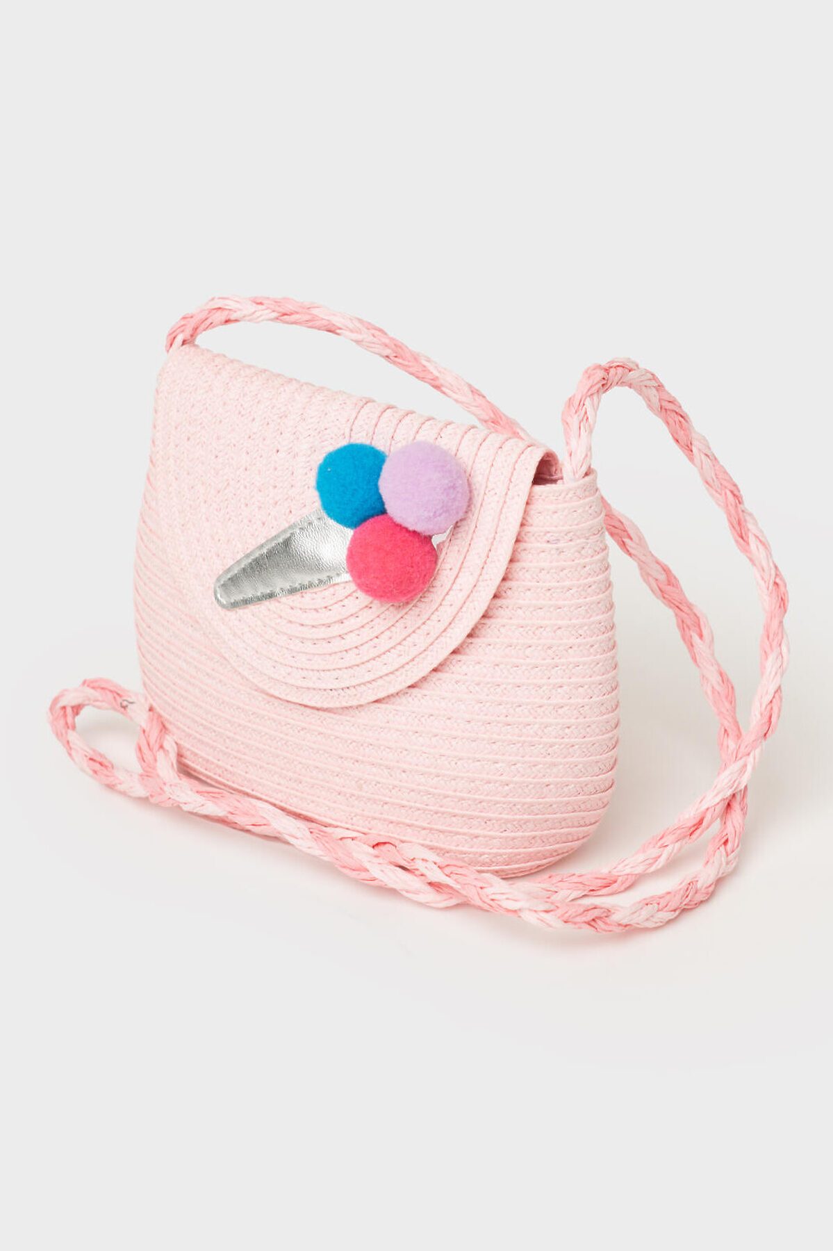 Пляжная сумка кросс-боди для девочки. Маленькая сумочка из искусственной рафии декорирована объемной аппликацией мороженое. Сумка имеет одно отеделение, которое закрывается наклапан с кнопкой. Параметры сумки: высота - 12 см, ширина - 18 см, глубина - 7 см