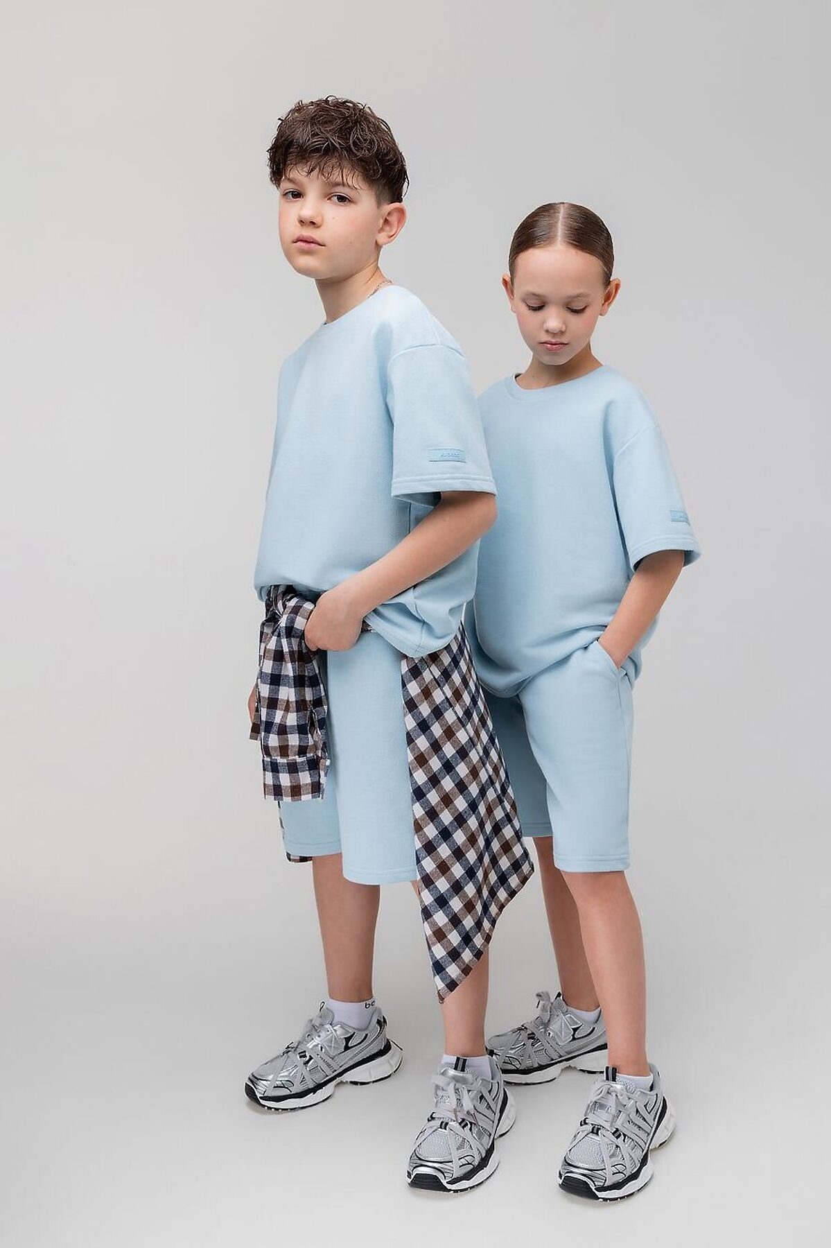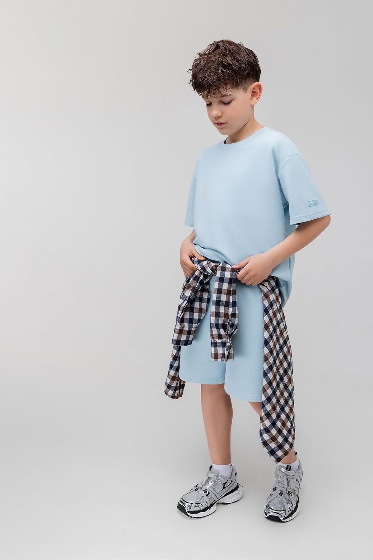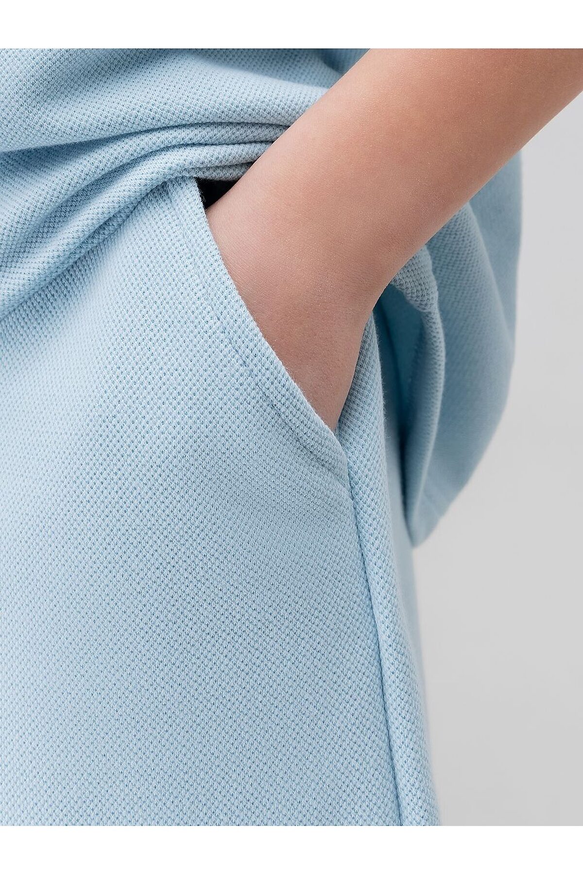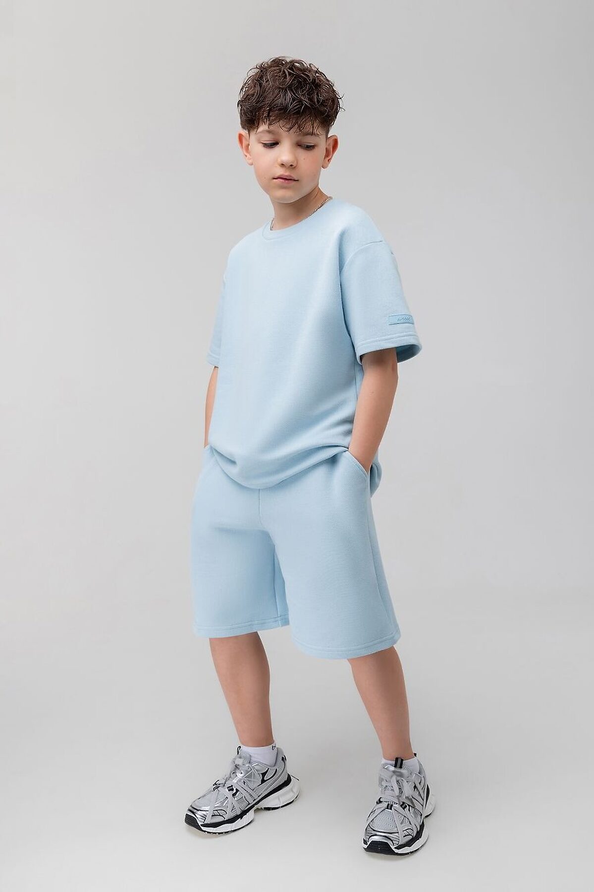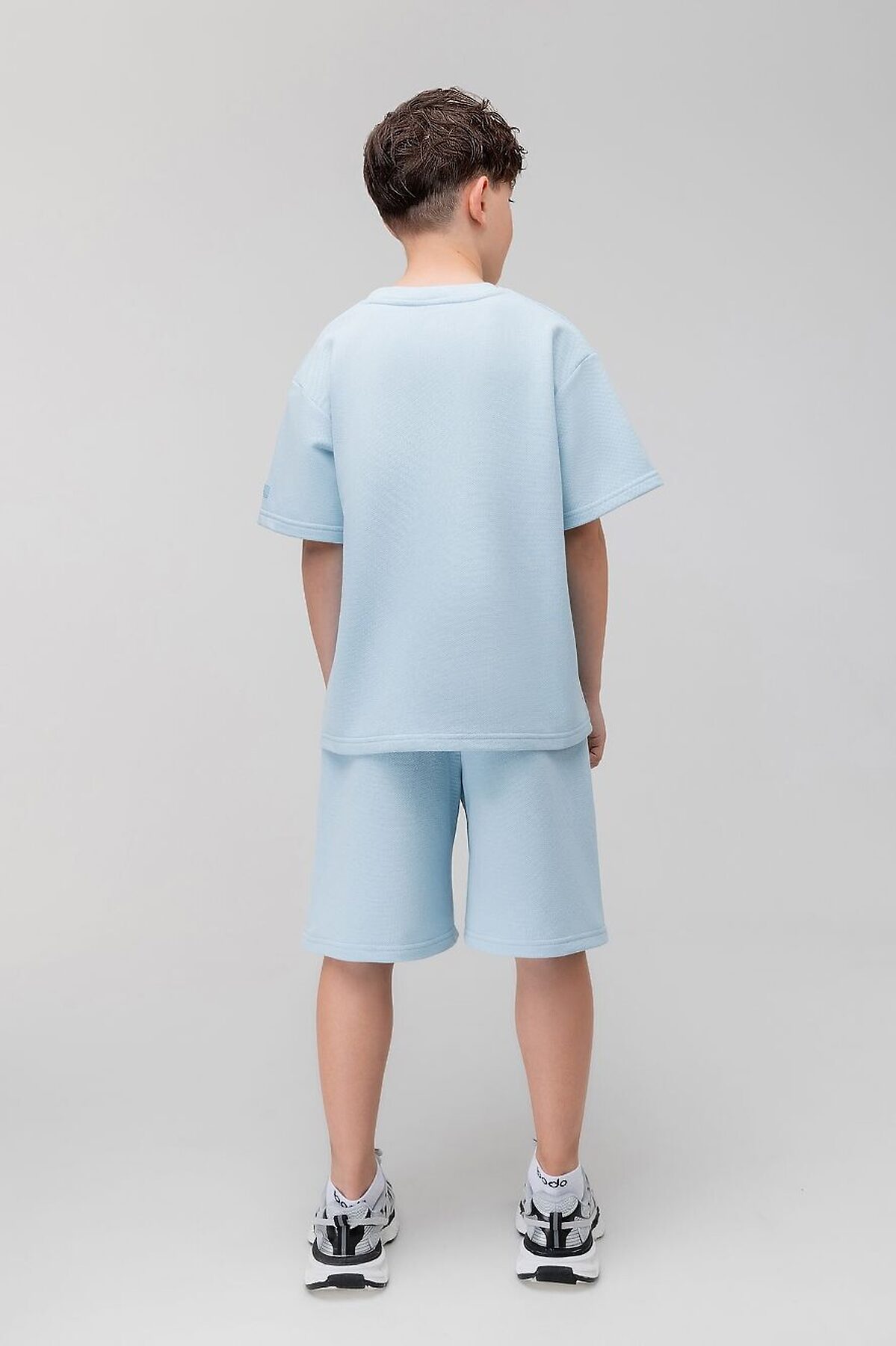 Костюм из ткани пике: футболка и шорты. Футболка свободного силуэта с коротким рукавом. Горловина футболки округлой формы. Низ изделия прямой. Шорты прямые, свободные на поясе с внутренней резинкой. Шорты с боковыми карманами.