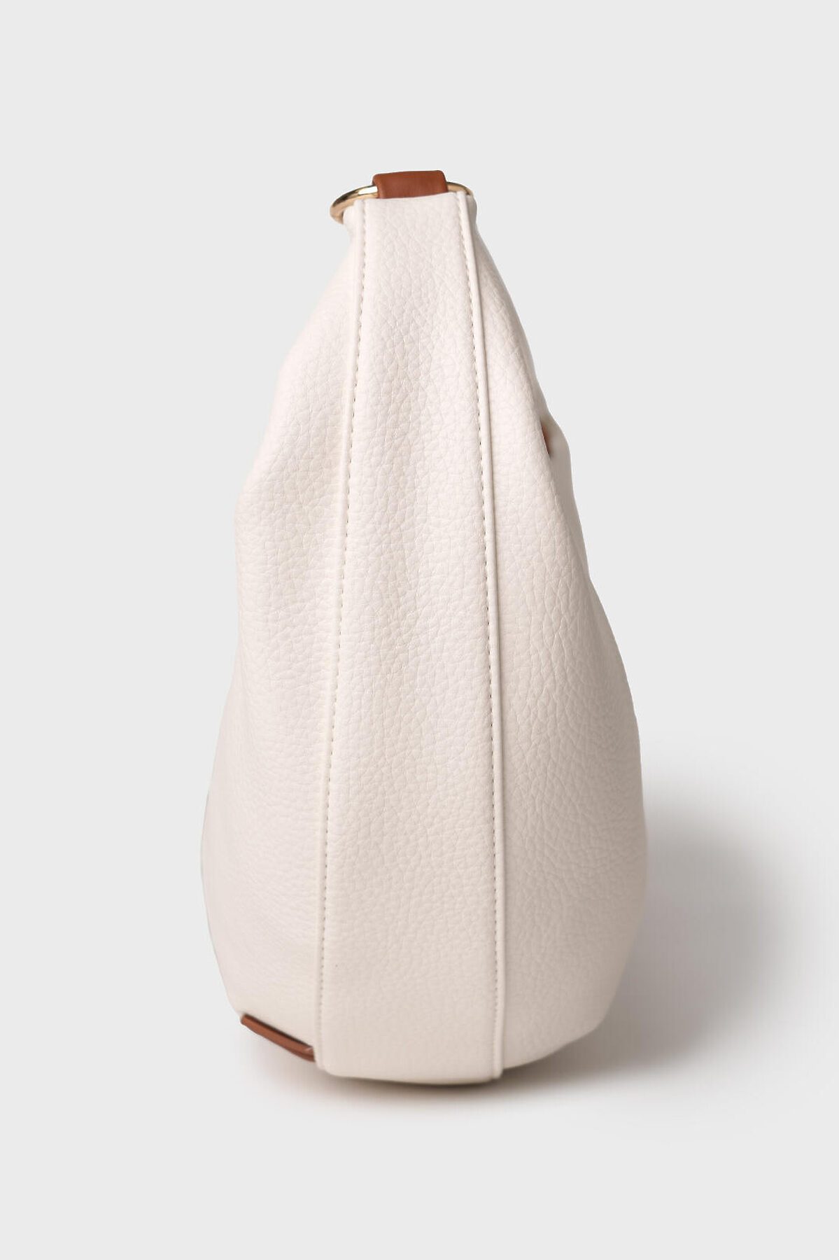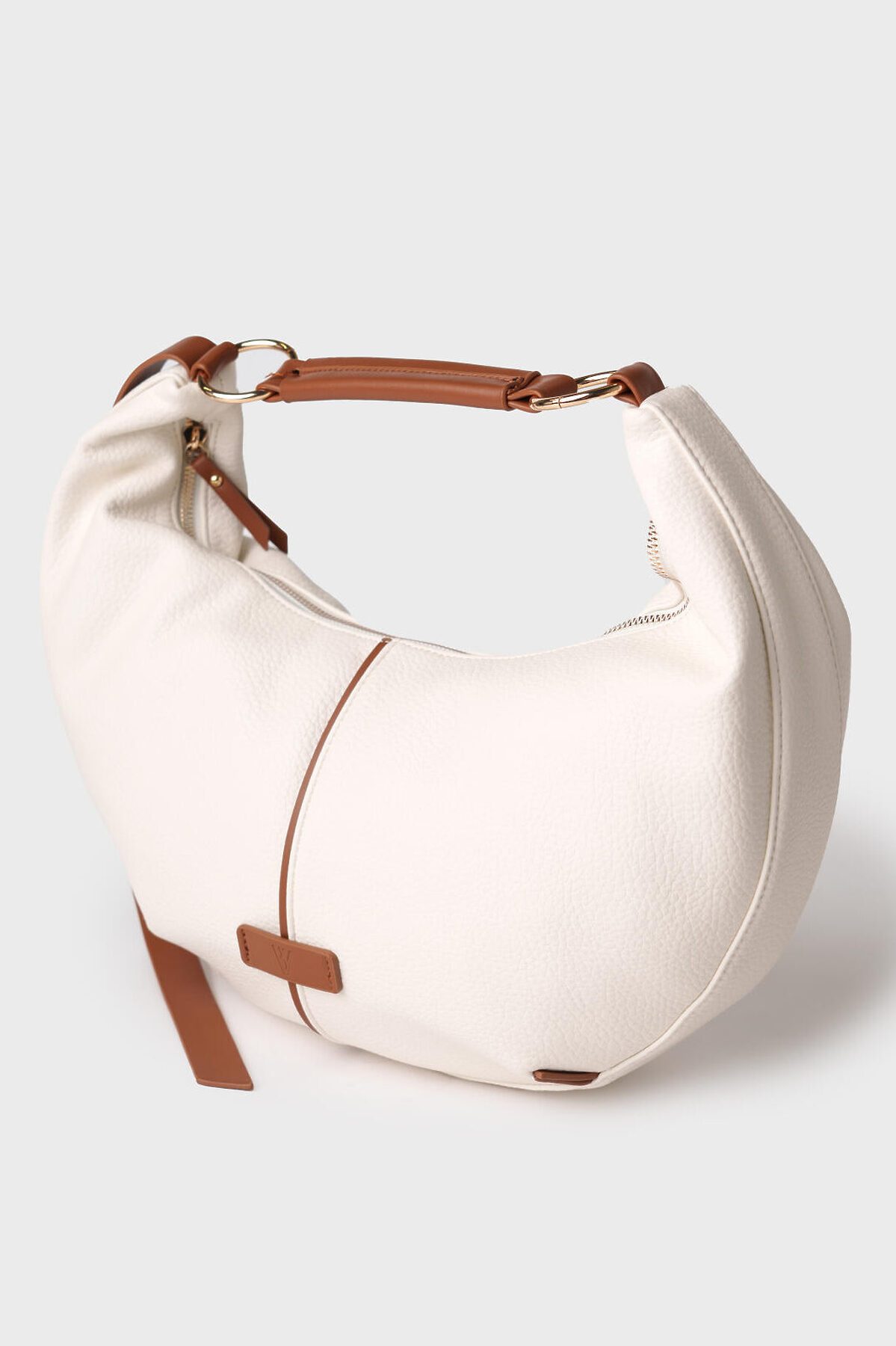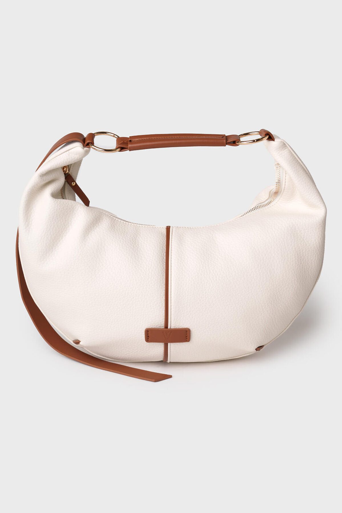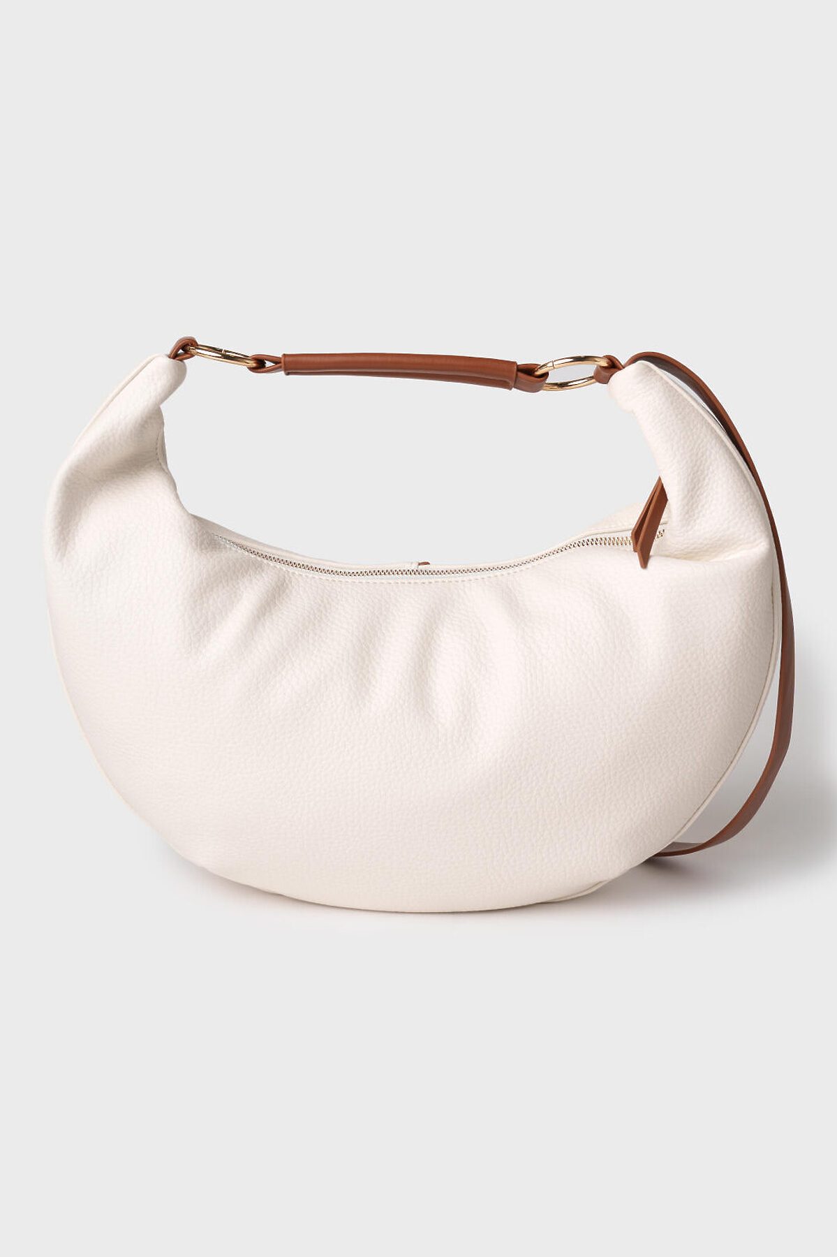 Женская сумка трендовой формы "луна". Сумка выполнена из мягкой искусственной кожи молочного цвета с отделкой ремнями карамельного цвета. Сумку можно носить на плече. Сумка имеет одно отделение на молнии. Внутри есть три кармана: два открытых и один на молнии. Параметры сумки: высота - 30 см, ширина - 44 см, глубина - 6 см. В подарок идет брендированный пыльник.