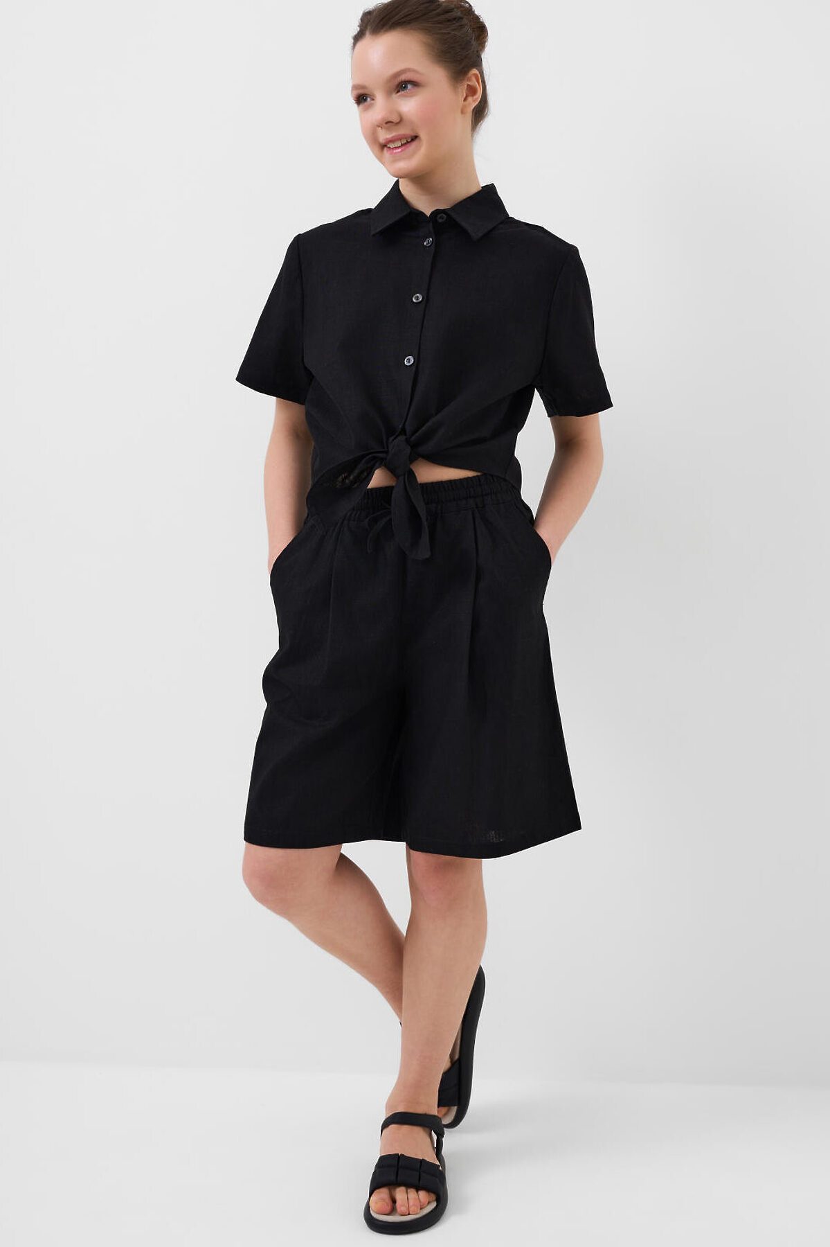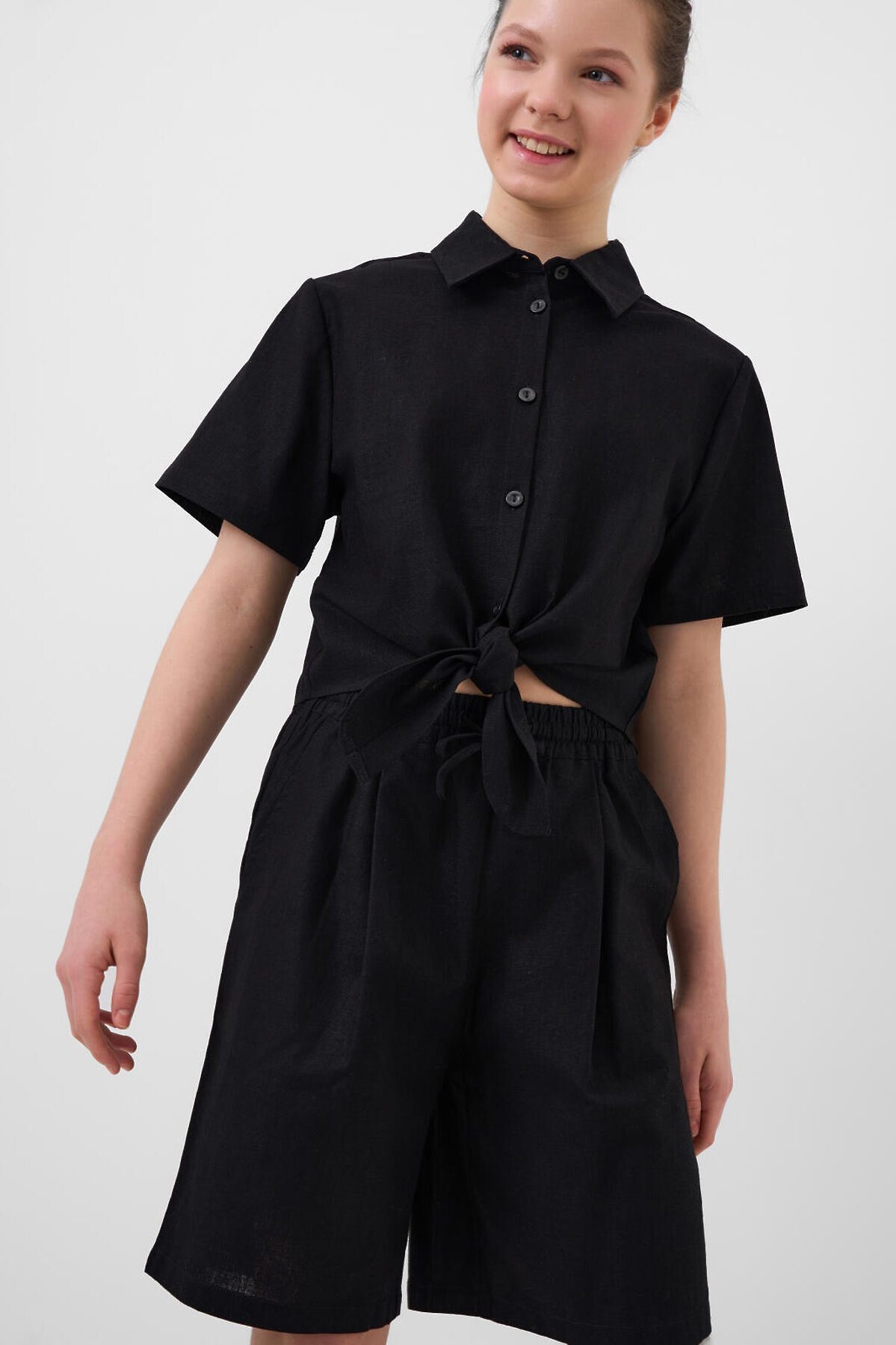 Легкий льняной костюм для девочки подростка. Рубашка прямого кроя с коротким рукавом и застежкой на пуговицы. Классический воротник, укороченная длина с завязками на талии. Свободные шорты на резинке со шнурком для регулировки. Удобные боковые карманы.