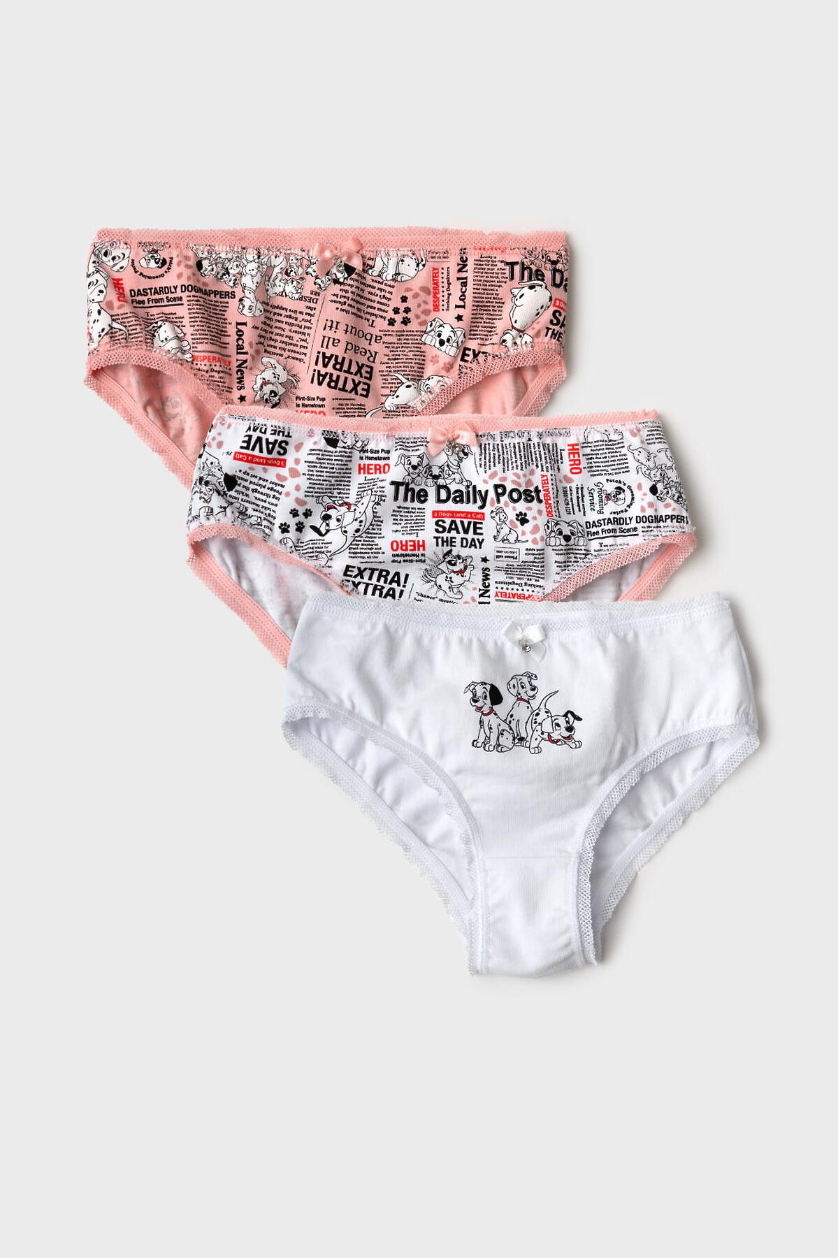 Набор из трех детских трусов-брифов для девочки. Изделия выполнены из мягкого, хлопкового эластичного трикотажа, с широкой резинкой по поясу и окантовкой по вырезам для ног. Принт с любимыми героями мультфильма "101 далматинец". Внутри предусмотрена ластовица.