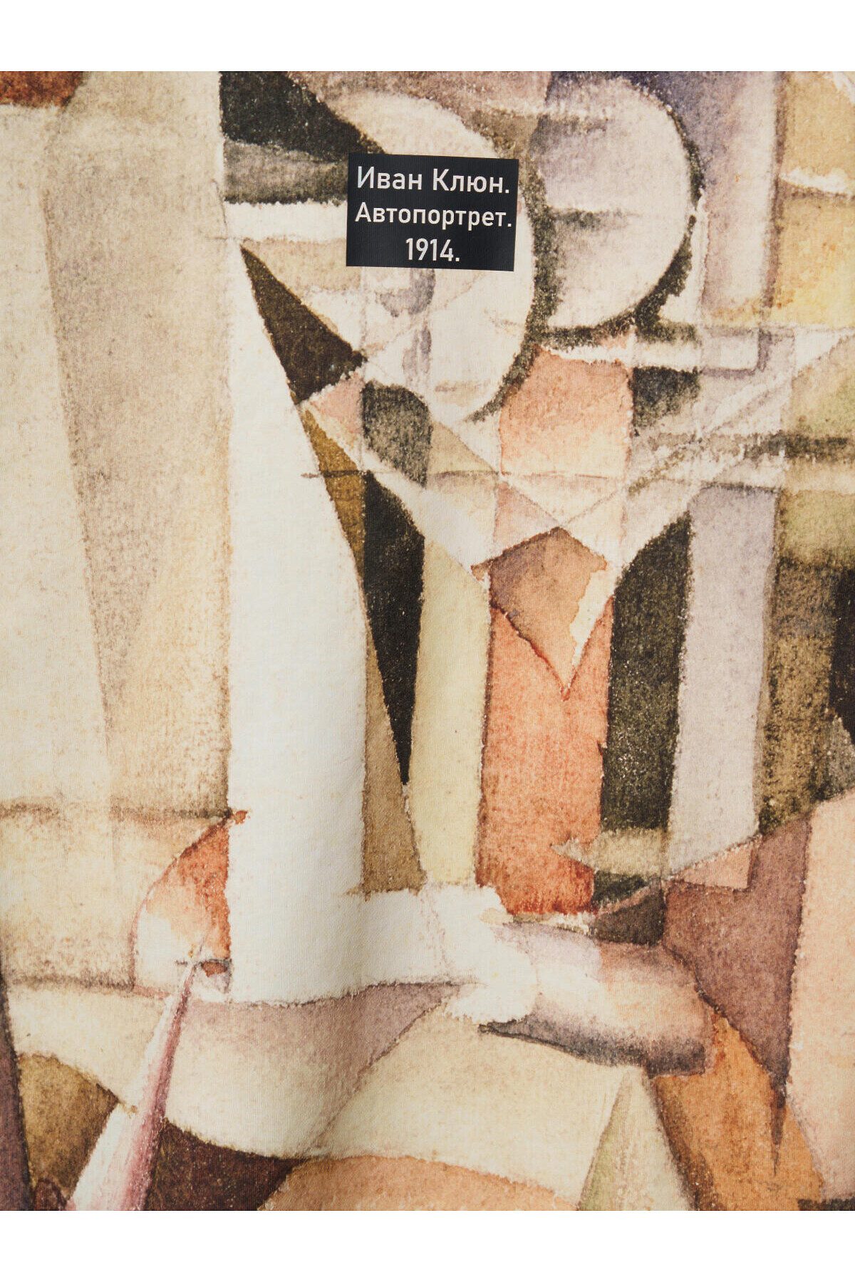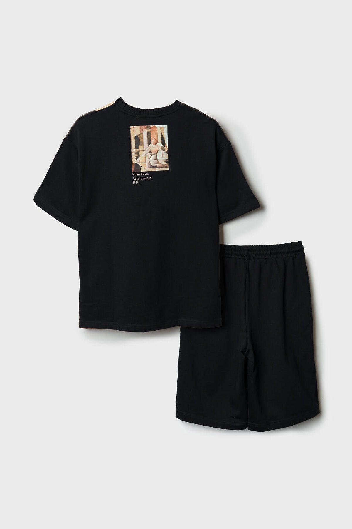 Костюм для мальчика подростка. Состоит из футболки и шорт. Выполнен из хлопкового трикотажа. Футболка свободного кроя, средней длины, выполнена в черном цвете и украшена крупным художественным принтом спереди и небольшим принтом на спинке. На принте изображена репродукция художественного произведения Ивана Клюна «Автопортрет», 1914 год. Шорты свободные, хорошо сидят на талии благодаря эластичному поясу со шнурком для регулировки. По бокам расположены вместительные накладные карманы. Можно составить family look cо взрослым вариантом аналогичного дизайна.