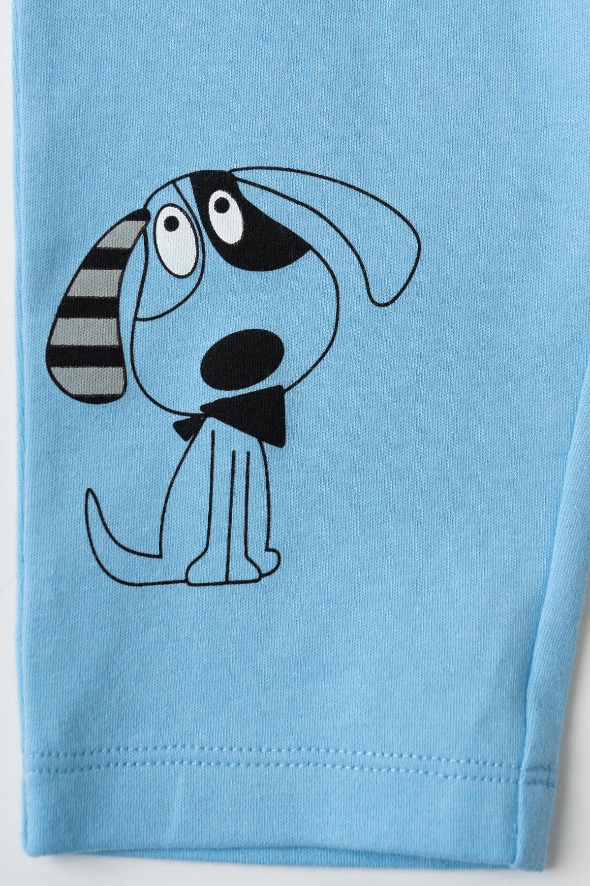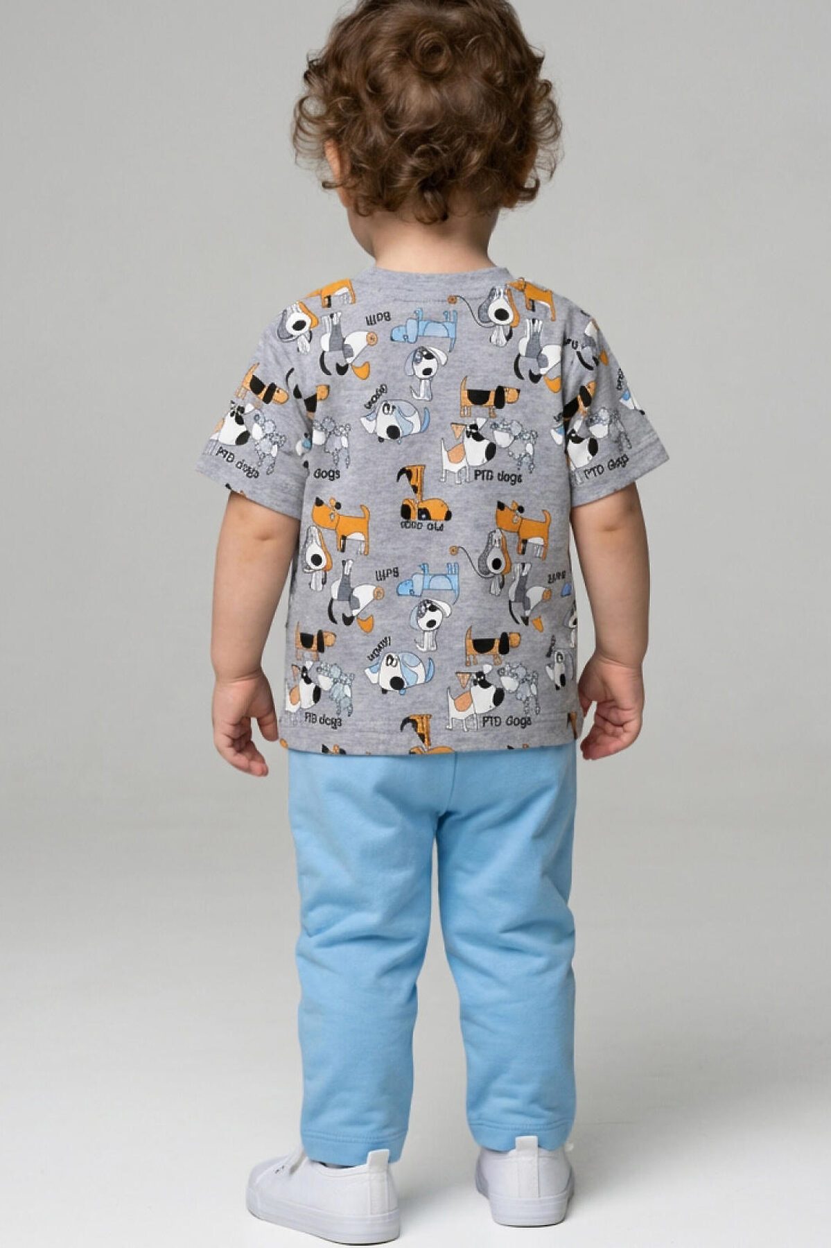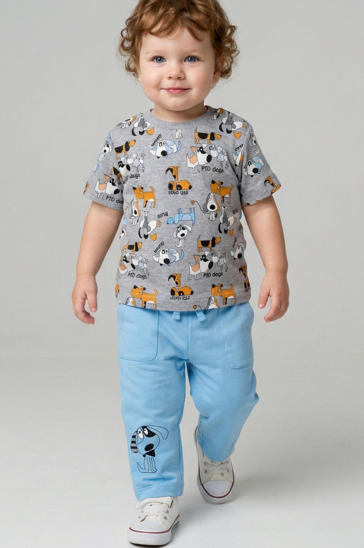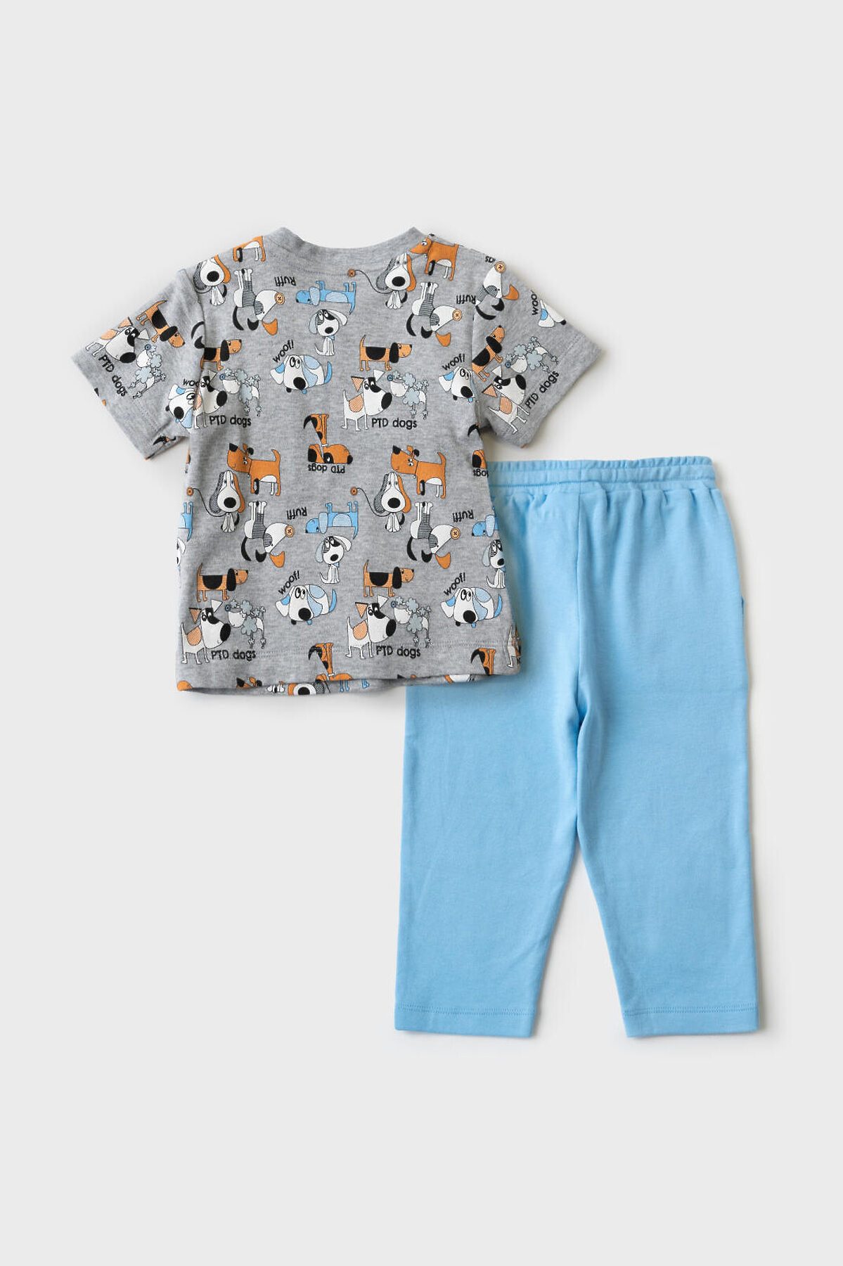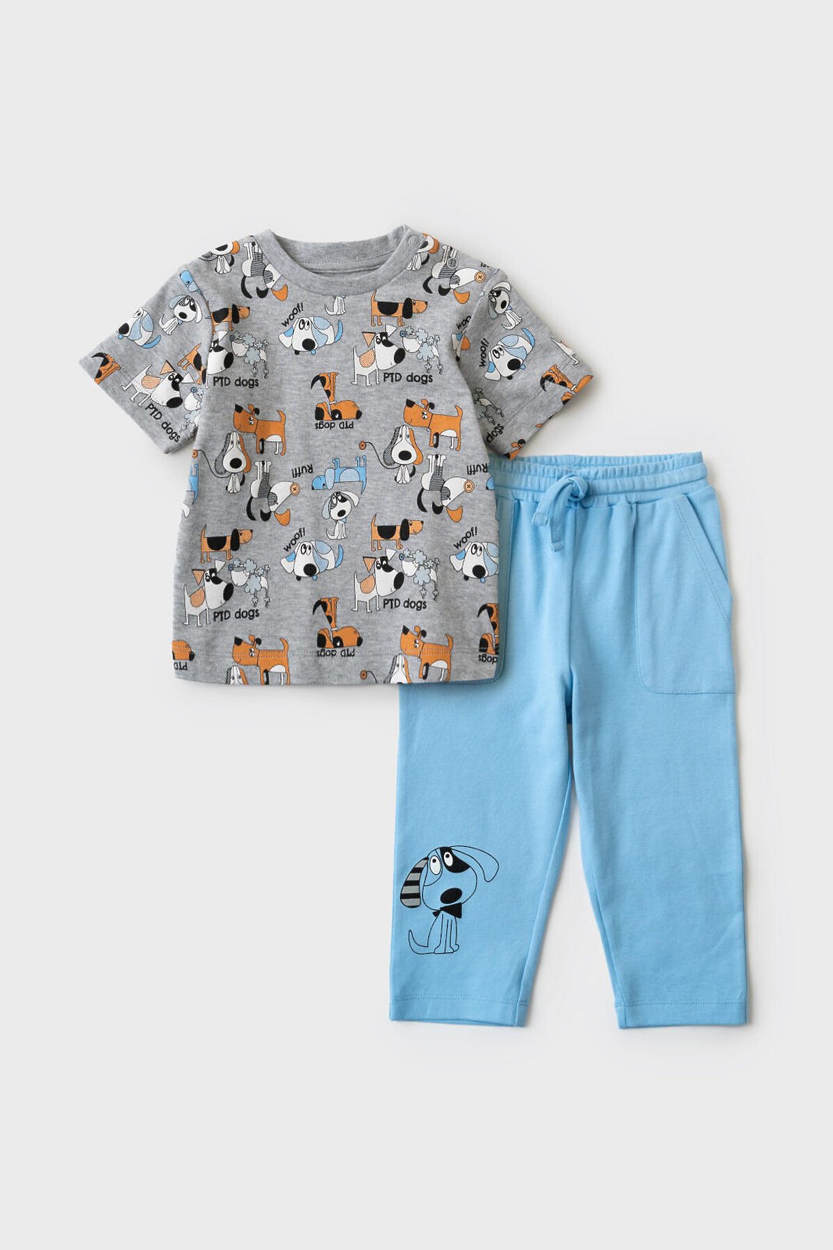 Детский костюм для мальчика. Состоит из футболки с коротким рукавом и брюк на резинке. Футболка прямого кроя с милыми принтами. Кнопки на плече для удобного переодевания. Брюки выполнены из хлопкового трикотажа, с комфортной посадкой, пояс на резинке дополнен шнурком. Удобные боковые карманы.