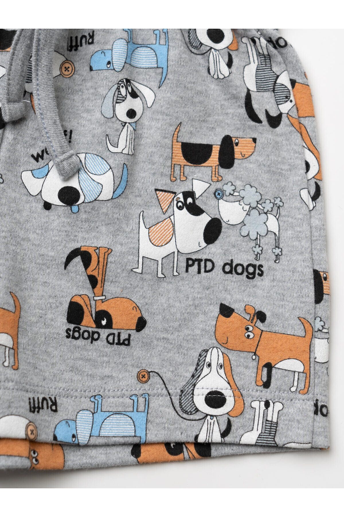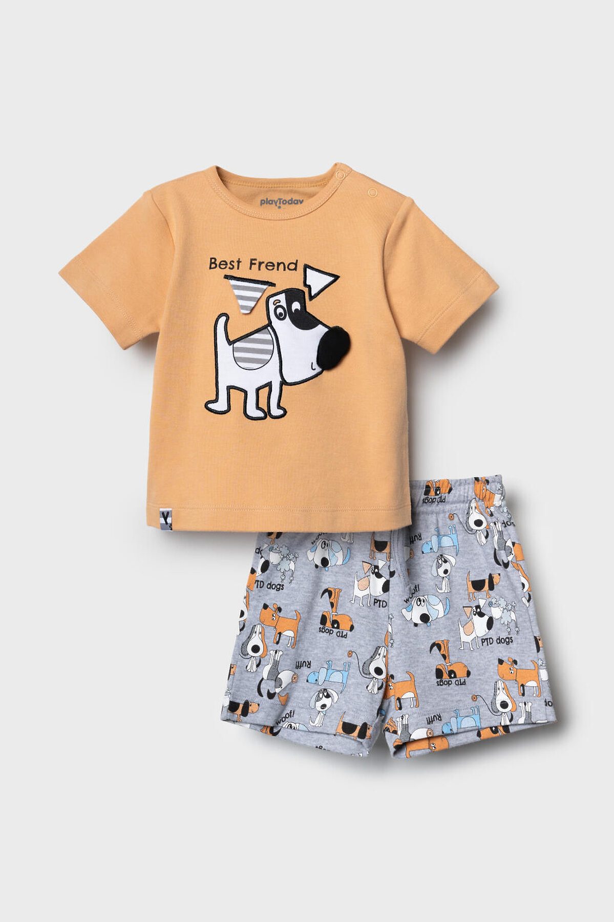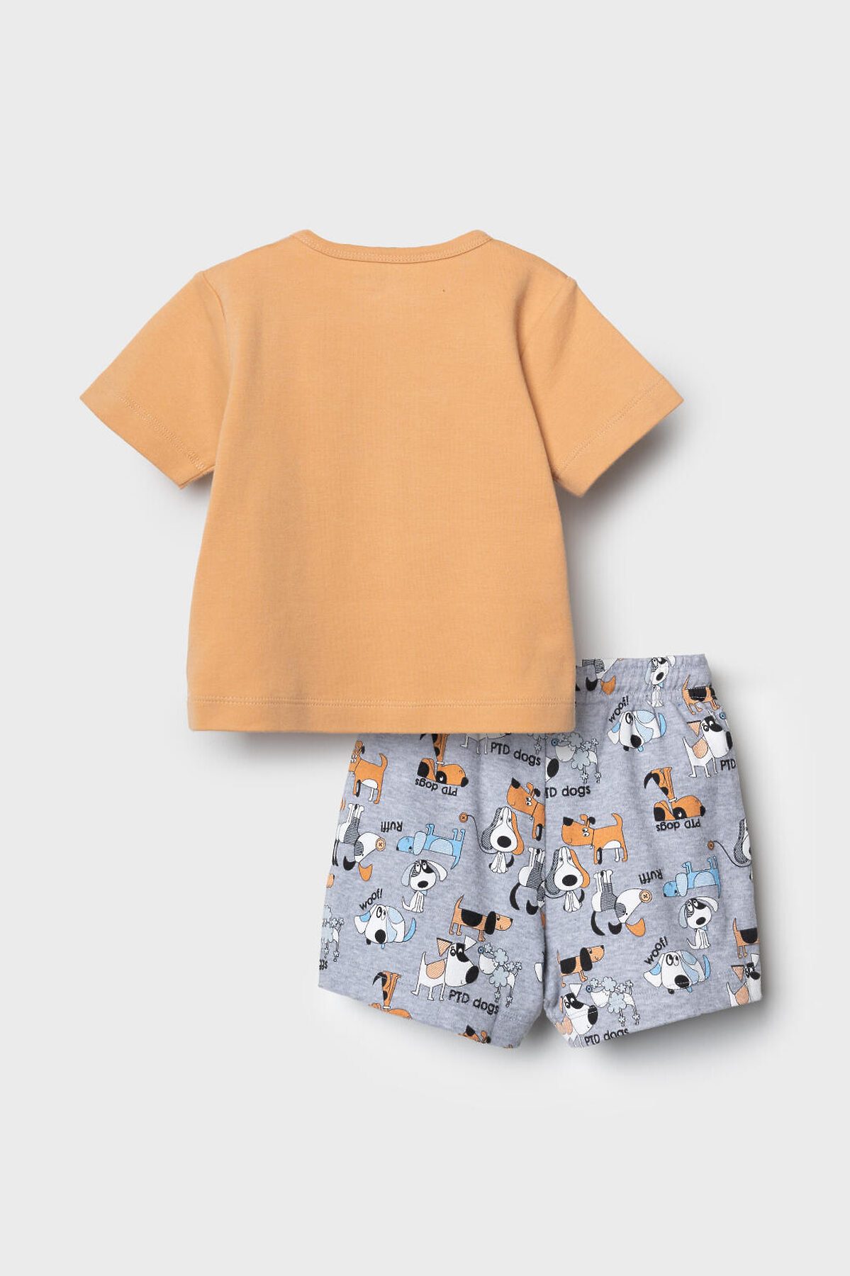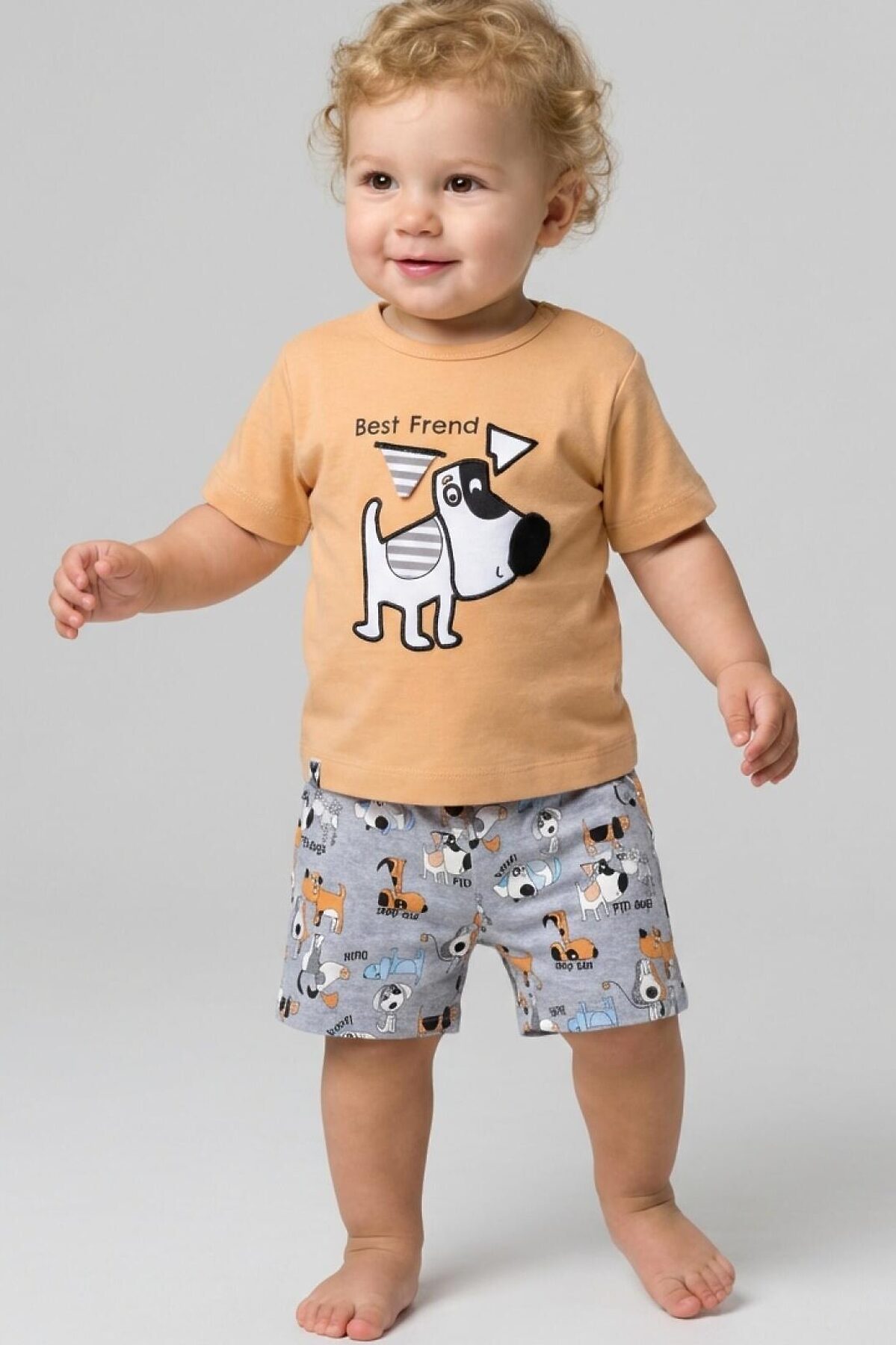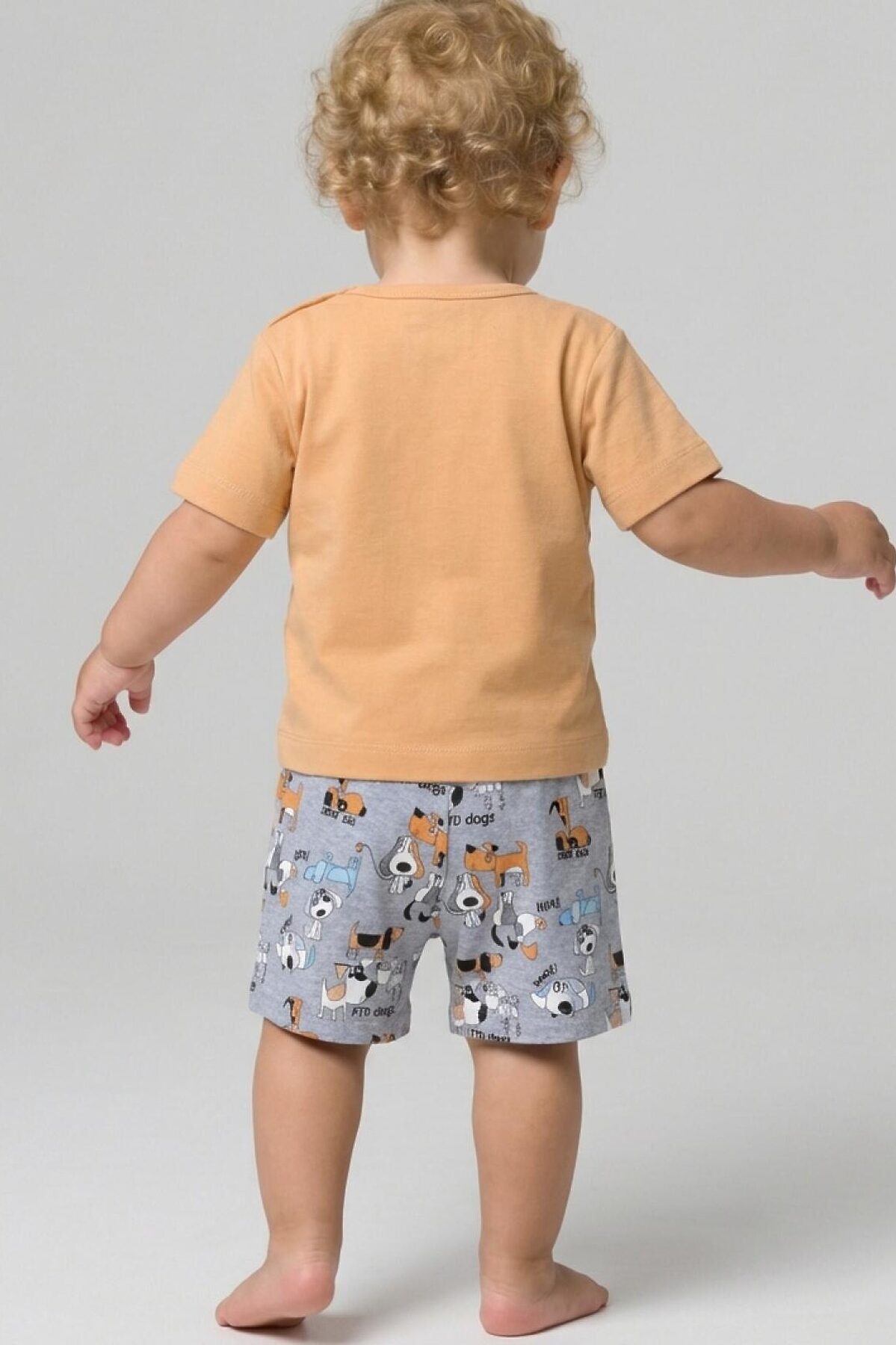 Детский костюм для мальчика. Состоит из футболки и шорт. Выполнен из хлопкового трикотажа. Футболка прямого кроя, с коротким рукавом. На плече застежка на кнопки для удобного переодевания. Яркий принт с милыми собаками. Шорты свободные, с эластичным поясом и шнурком для регулировки посадки.