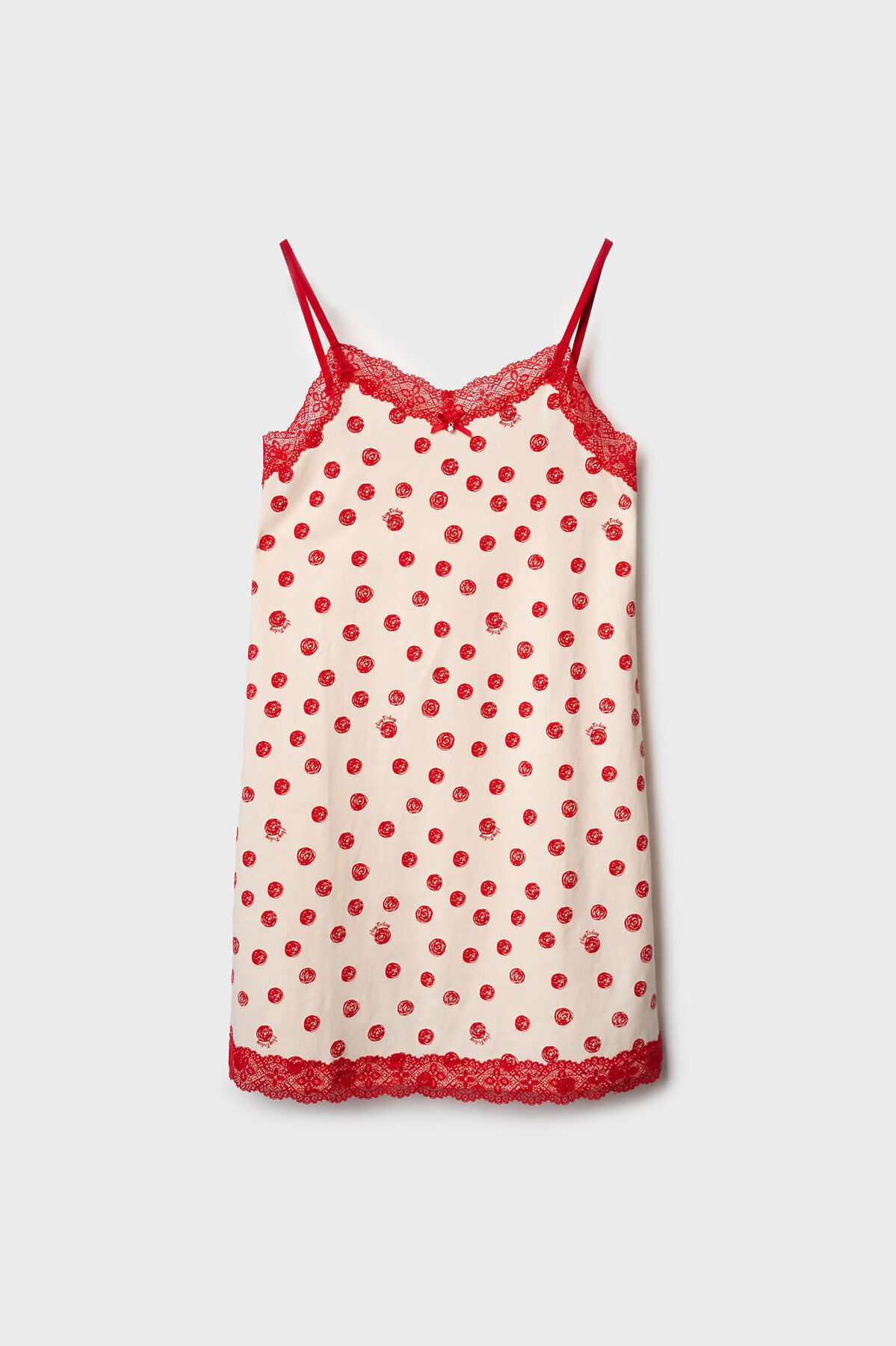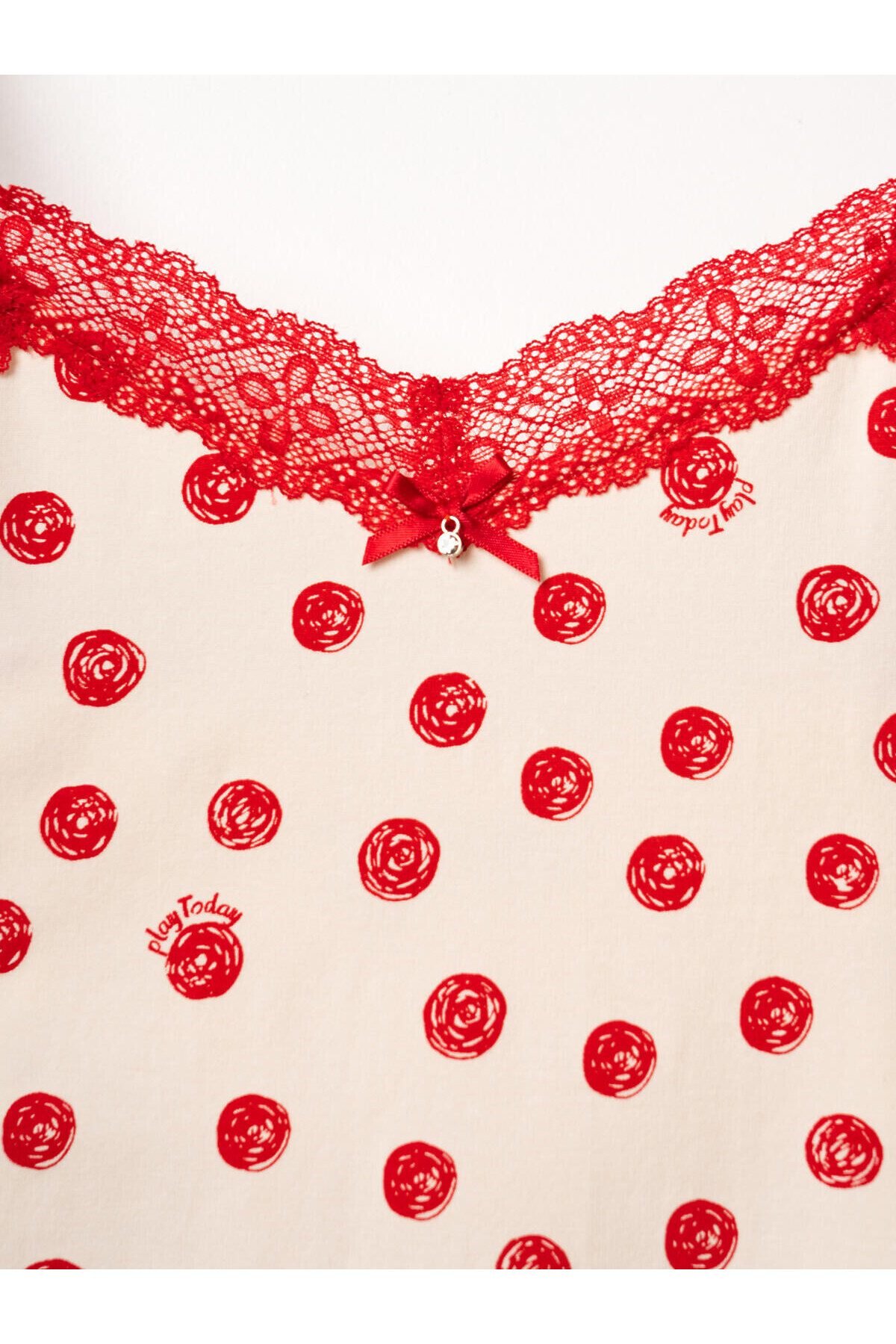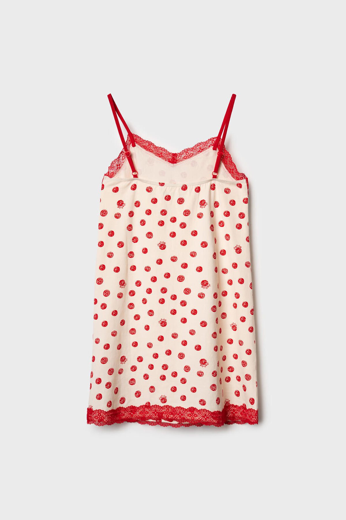 Ночная сорочка для девочки подростка. Выполнена из мягкого хлопкового трикотажа с добавлением эластана, за счёт чего она тянется и комфортно сидит. Модель на тонких регулируемых бретельках и украшена кружевом по вырезу и внизу. Спереди — аккуратный бантик. Ткань украшена весёлым принтом в виде красных горошин и клубничек на молочном фоне.