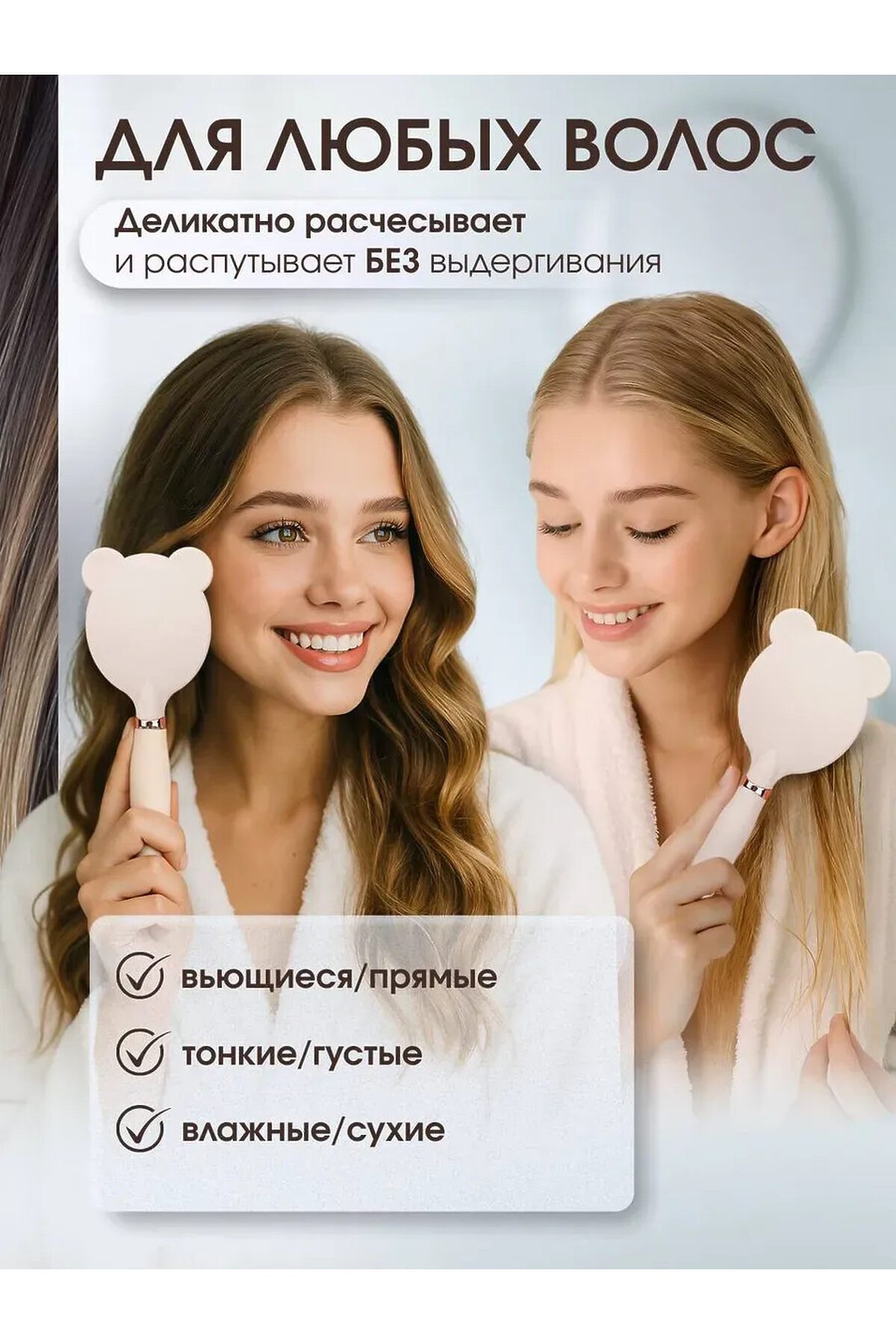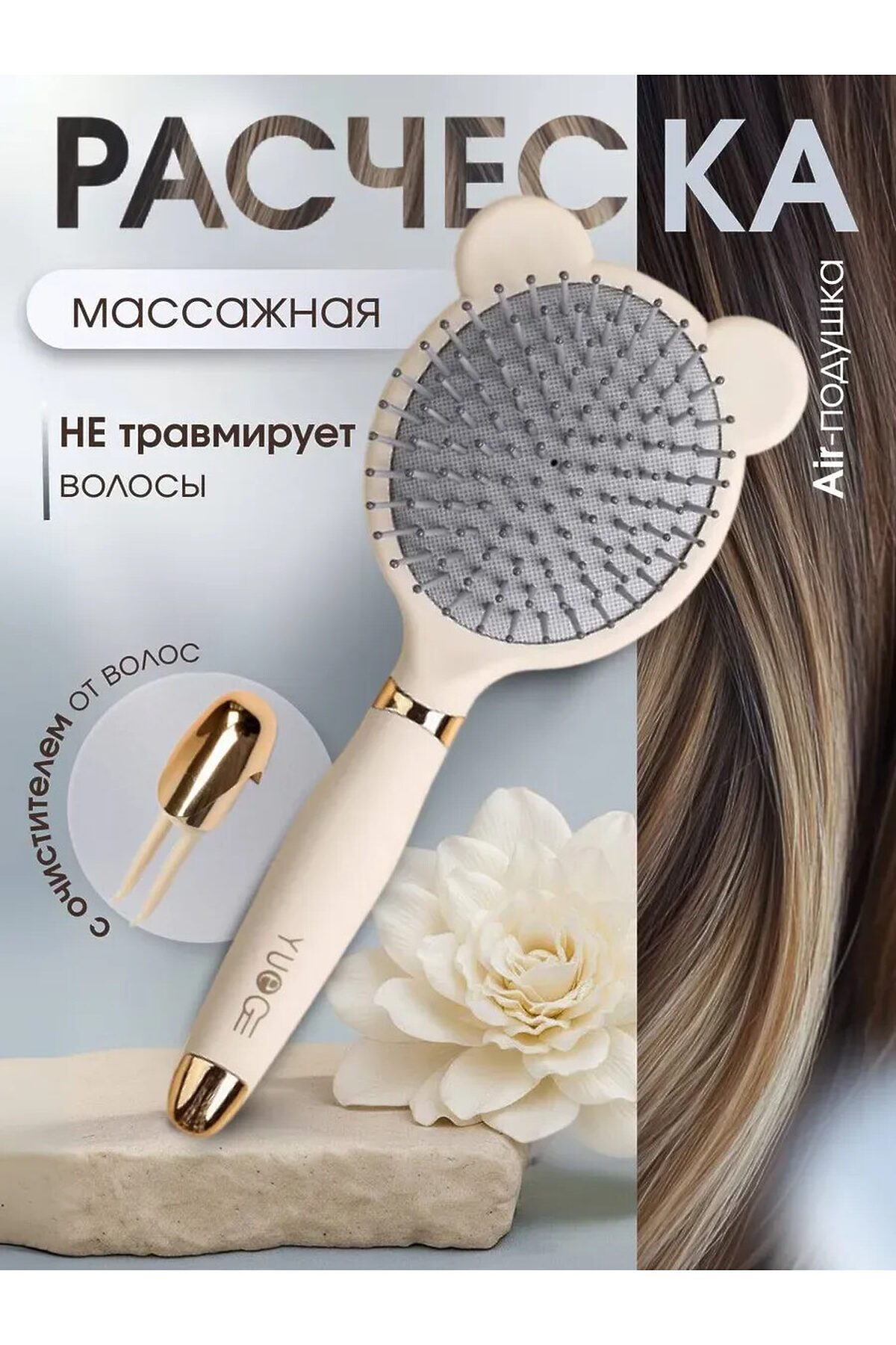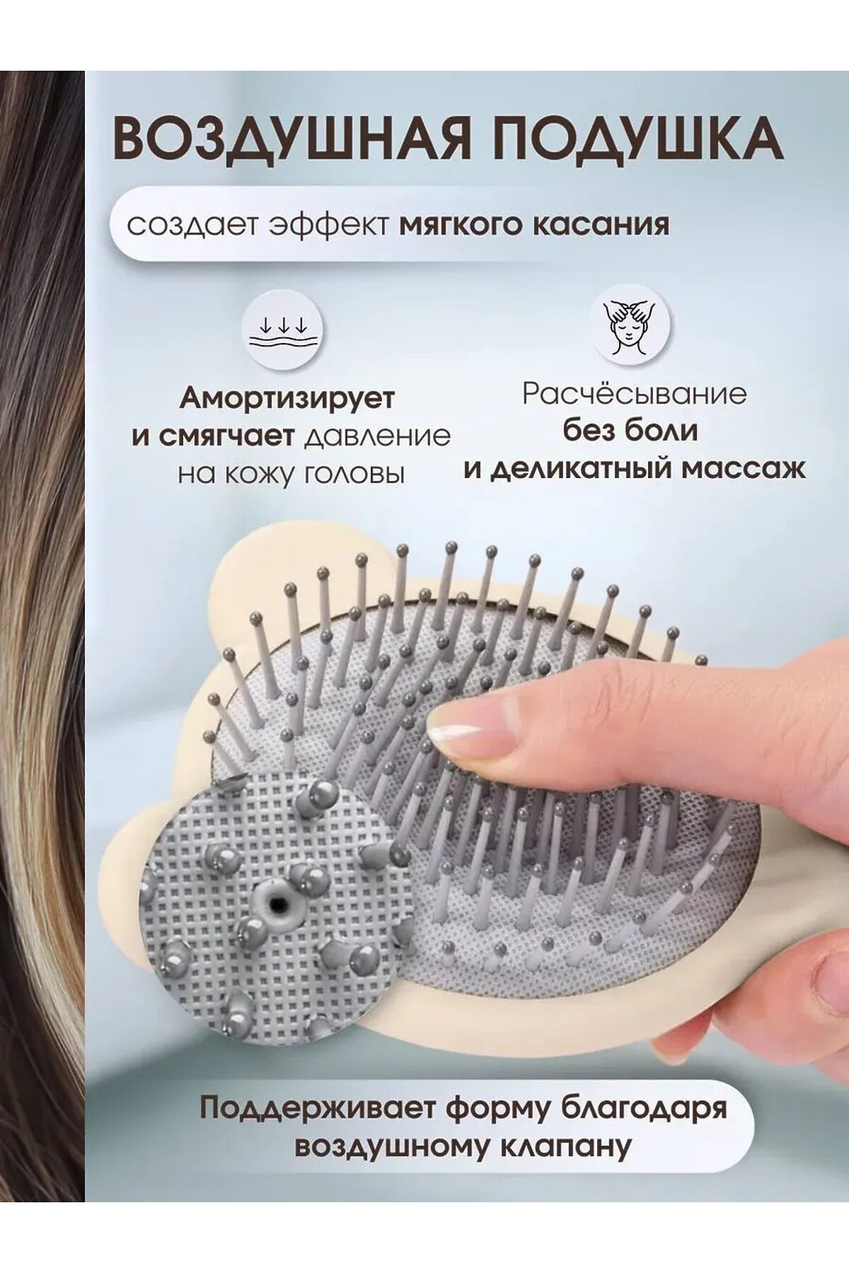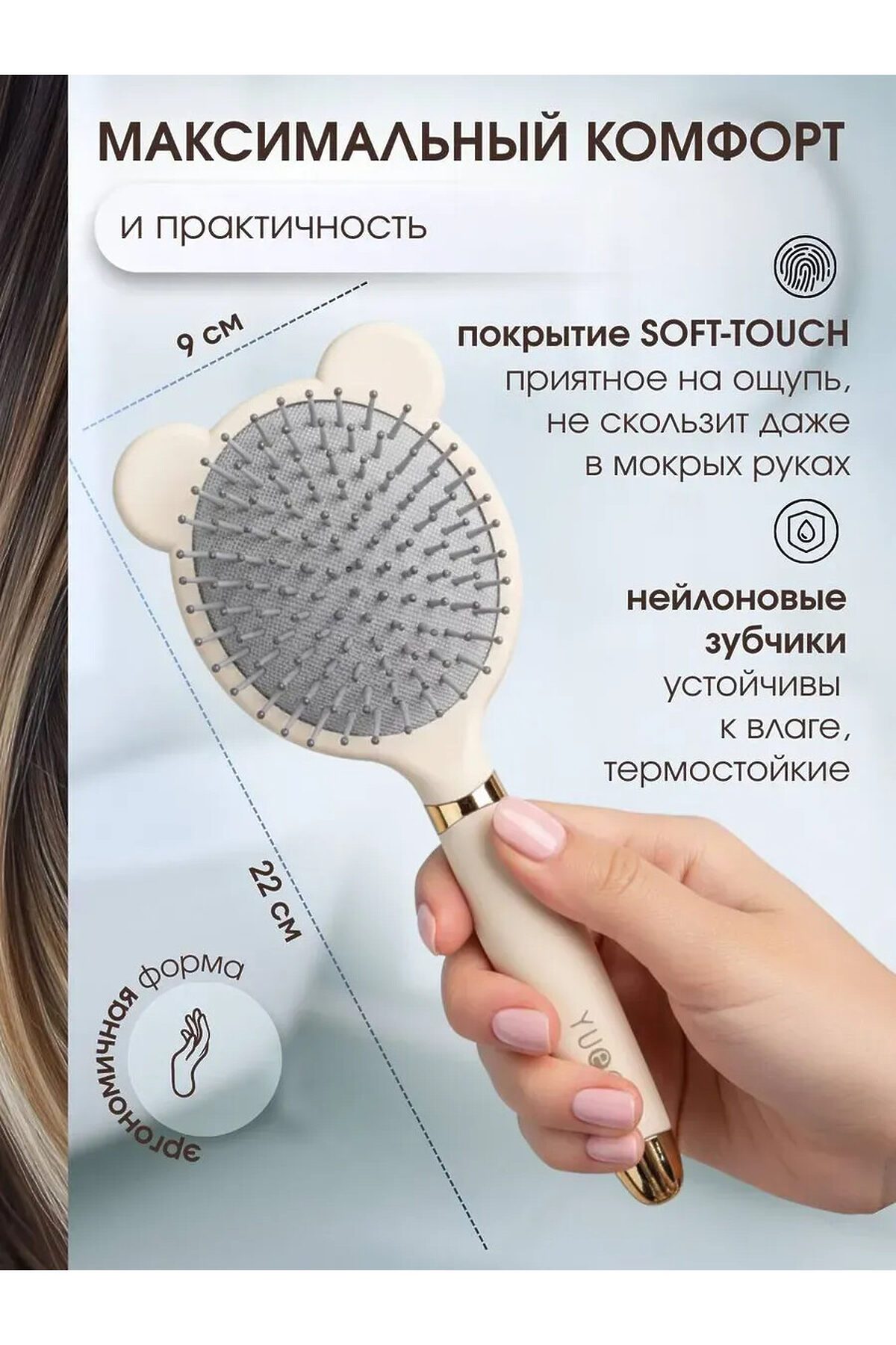 Эргономичная расческа для женщин. Подходит для бережного ухода за волосами. Массажная основа мягко воздействует на кожу головы. Пластиковый корпус устойчив к деформации. Профессиональный выбор для ежедневного применения. Комфортный захват. Легкий вес. Массажка совместима с различными типами волос. Подходит для женщин всех возрастов.