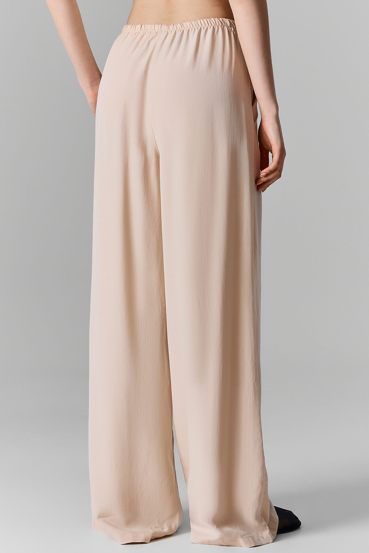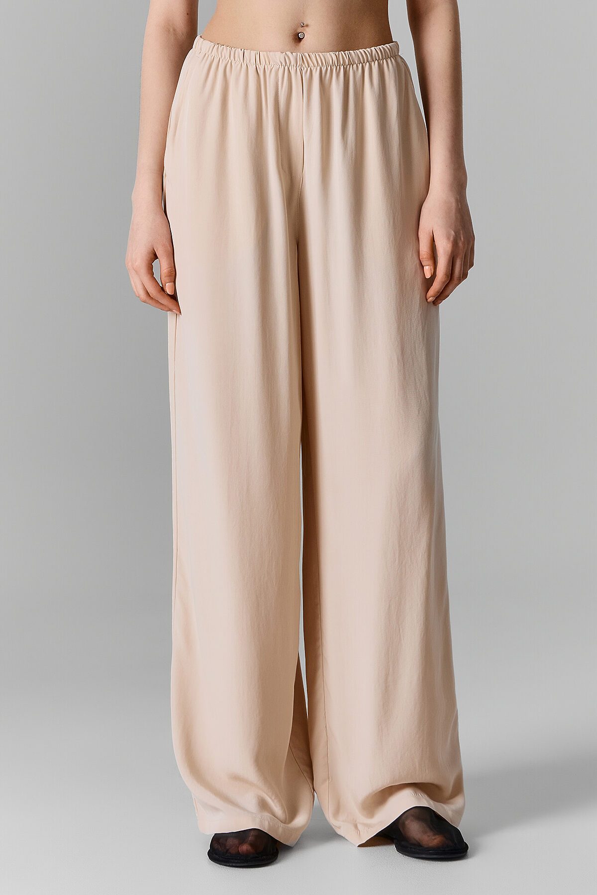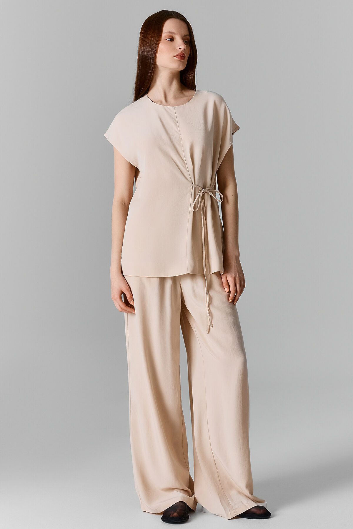 Брюки прямые свободные, посадка средняя. Пояс цельнокроеный с эластичной тесьмой внутри (20мм 20RV). С внутренней стороны пояса пробиты петли и втянут шнур-бейка из основного полотна. На деталях переда обработаны карманы-хулиганы. Подкладка карман из основного полотна. На правой детали переда имитация гульфика. Нижние срезы обработаны швом вподгибку с закрытым срезом.