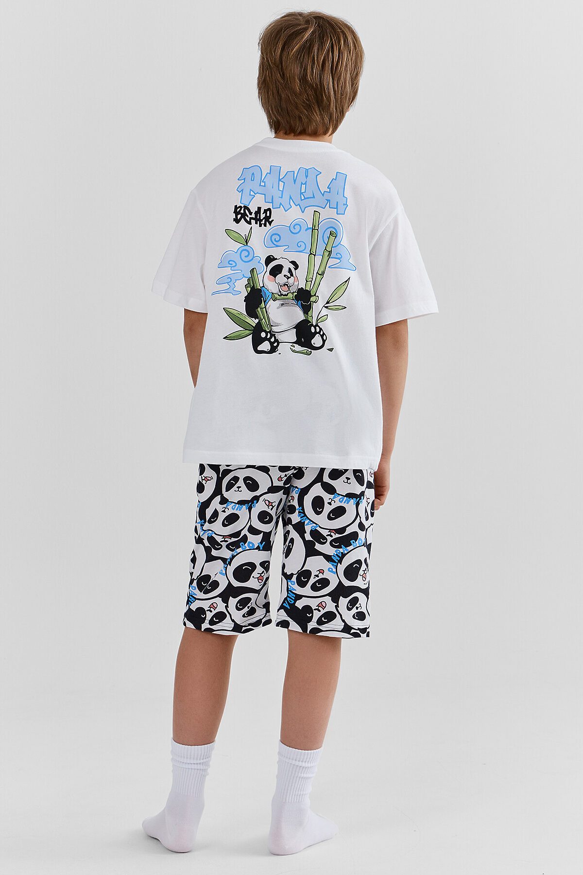 Этот домашний комплект для мальчиков — удобный и практичный выбор для отдыха и сна. Футболка свободного силуэта обеспечивает комфортную посадку. Круглая горловина с обтачкой из рибаны добавляет мягкости и эластичности, обеспечивая удобство при носке. Свободные рукава и слегка спущенная линия плеча создают расслабленный силуэт, а обработка низа рукавов и футболки швом в подгибку делает изделие аккуратным и долговечным. Шорты ниже колена свободного силуэта и с высокой посадкой на талии обеспечивают максимальное удобство, создавая ощущение свободы движений. Эластичный пояс мягко фиксирует изделие, а обработка низа шорт швом в подгибку делает модель надежной и устойчивой к износу. Этот комплект из натурального хлопка идеально подходит для домашних образов, сочетая комфорт, практичность и стиль!