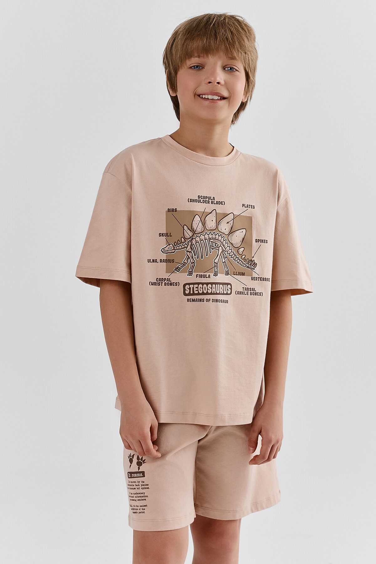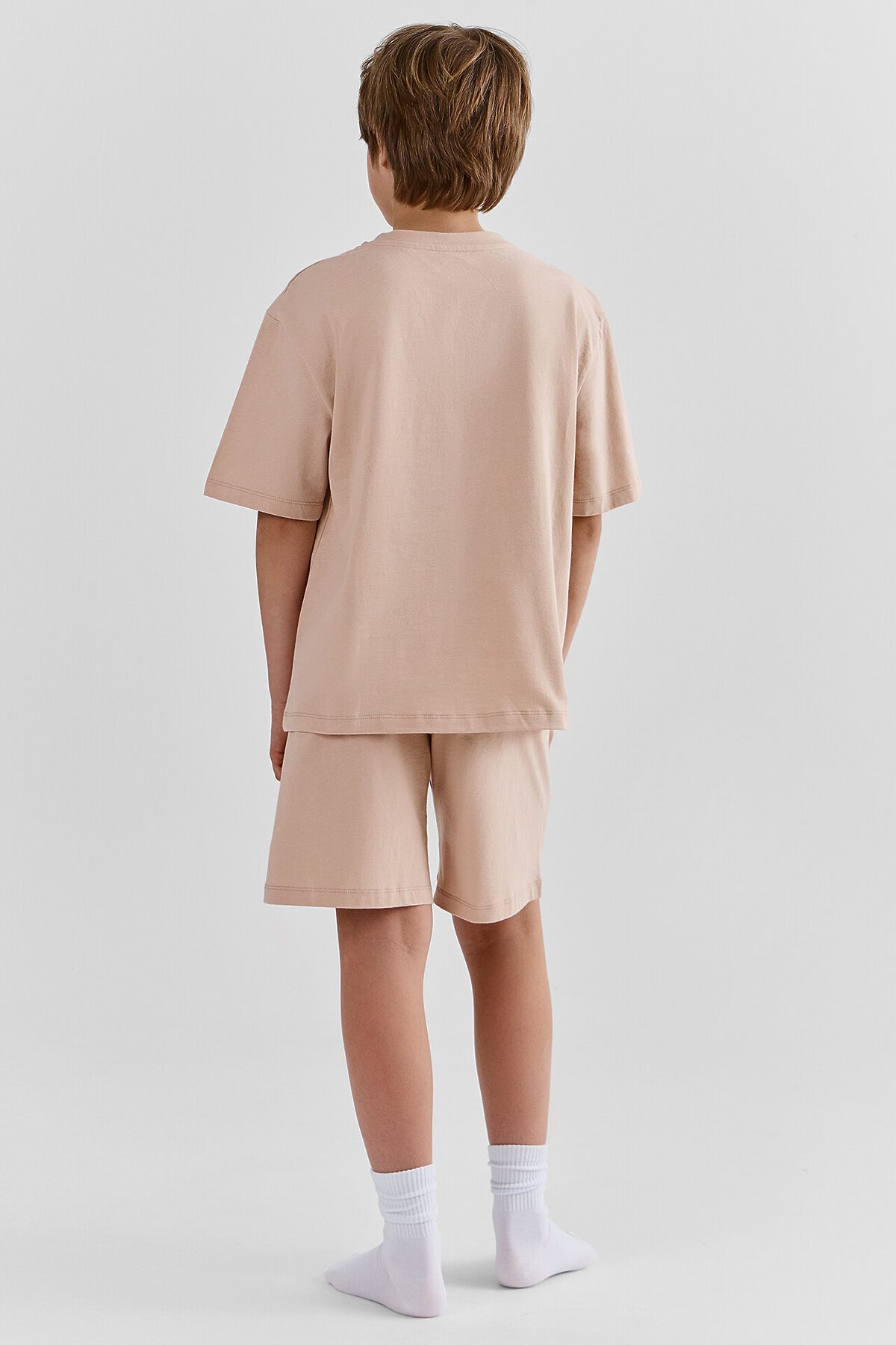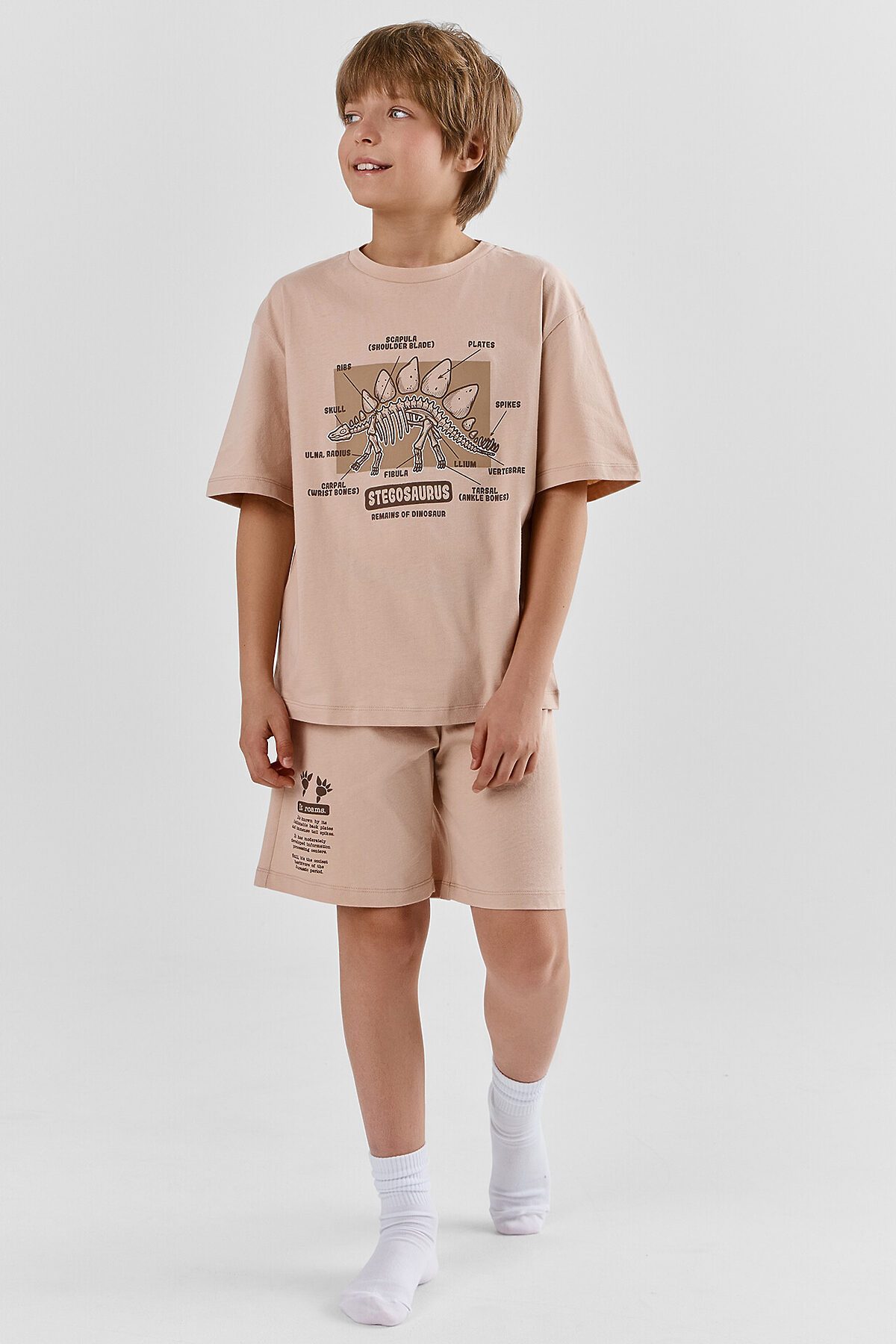 Комплект для мальчиков состоит из джемпера и шортов, прошиты из основного полотна. Горловина круглой формы из основного полотна. Рукава короткие, втачные, линия плеча спущена. Шорты свободные, прямые. Верхний срез шортов обработан эластичной жаккардовой тесьмой JT1-20. Низ джемпера, рукавов и брюк обработаны на 2-х игольной плоскошовной машине швом в подгибку