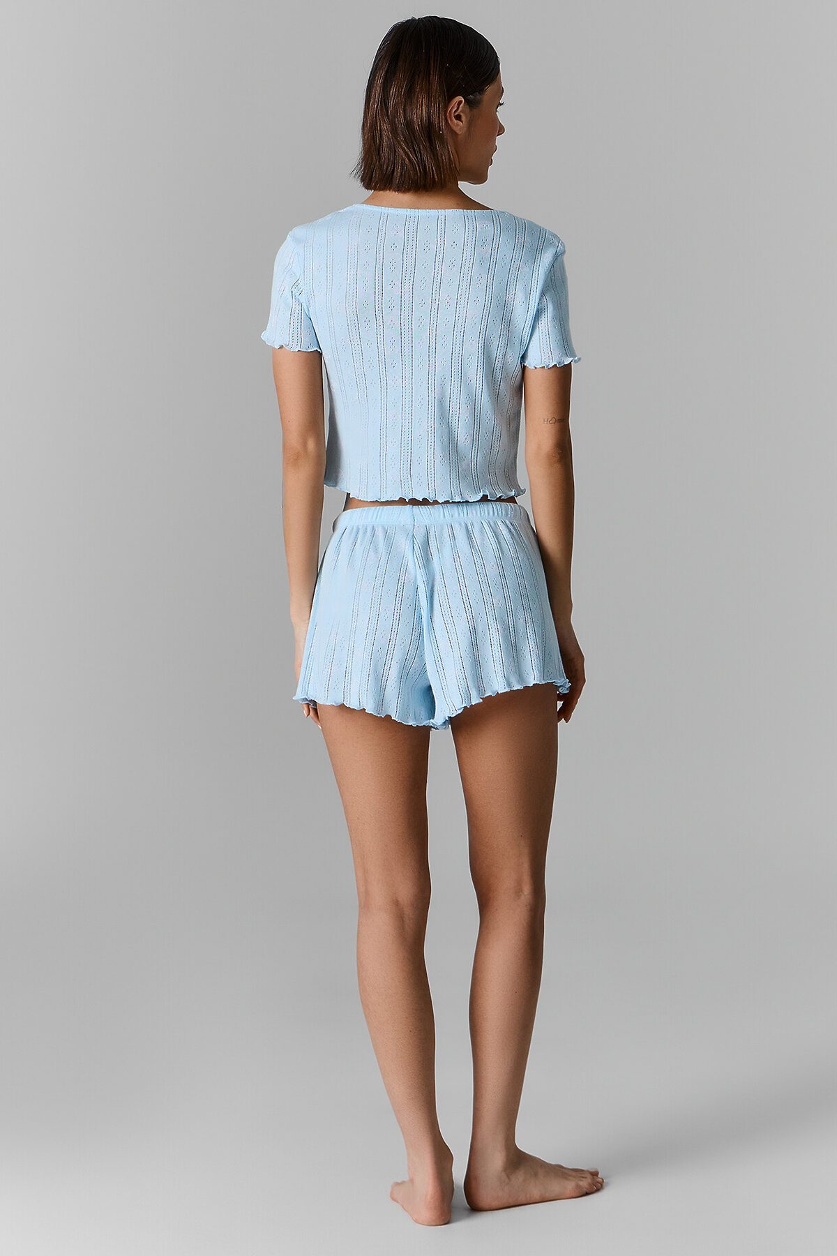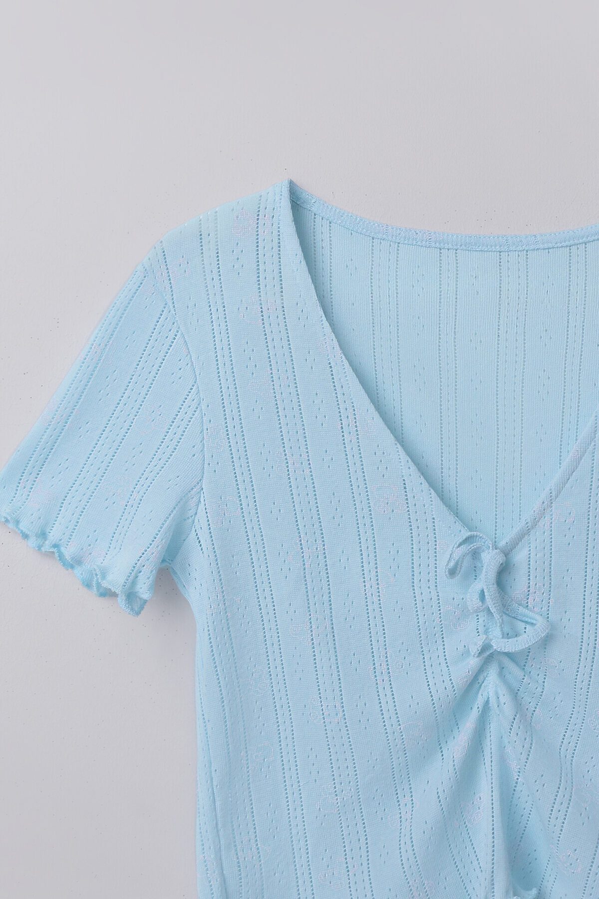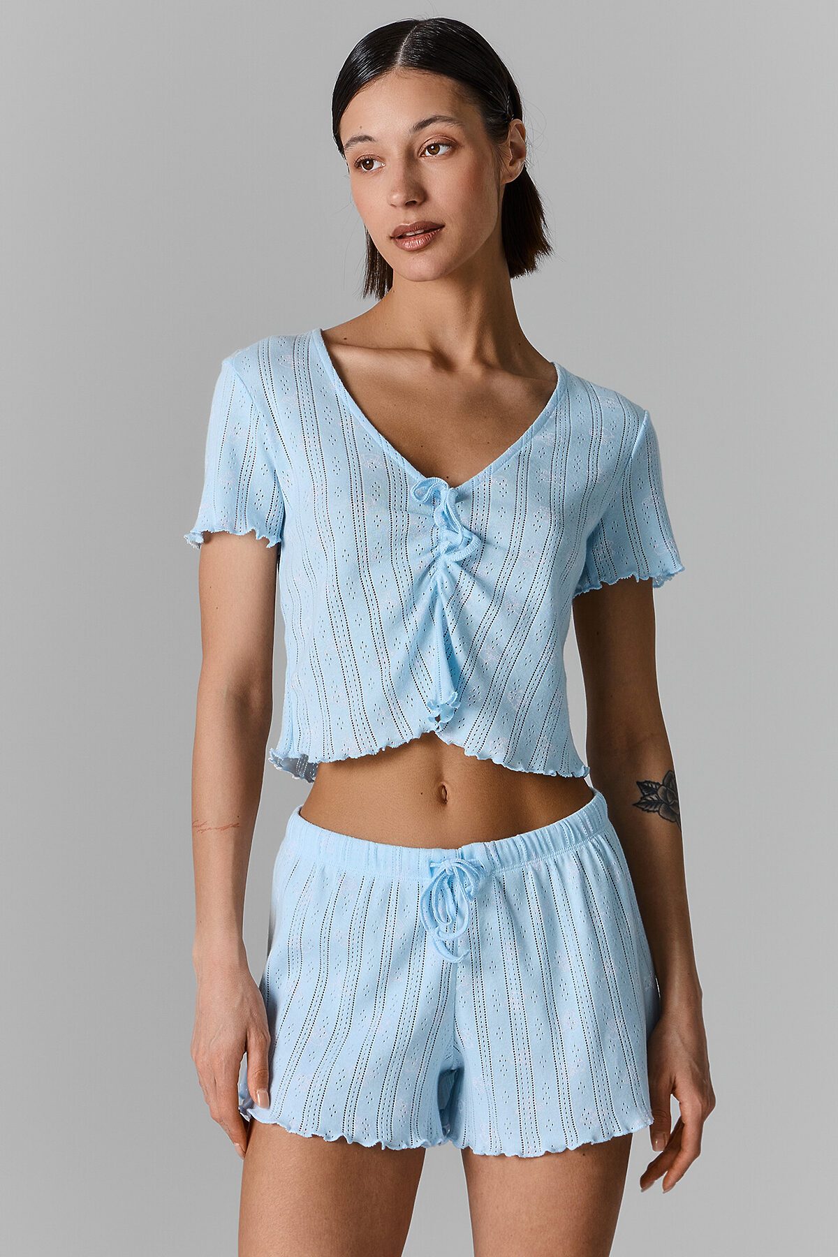 Топ прилегающего силуэта. Перед и спинка цельнокроеные. На груди сборка, внутри жилка WT4-6, притачен бантик из основного полотна. Горловина V-образной формы, края обработаны в «чистый край». Рукава короткие, втачные. Низ топа и рукавов обработан на микрооверлоке. Шорты свободного силуэта, короткие. Пояс цельнокроеный, с втаченой эластичной тесьмой 30 RV. По центру пояса пробиты петли, протянута бейка из основного полотна. Низ шорт обработан на микрооверлоке.