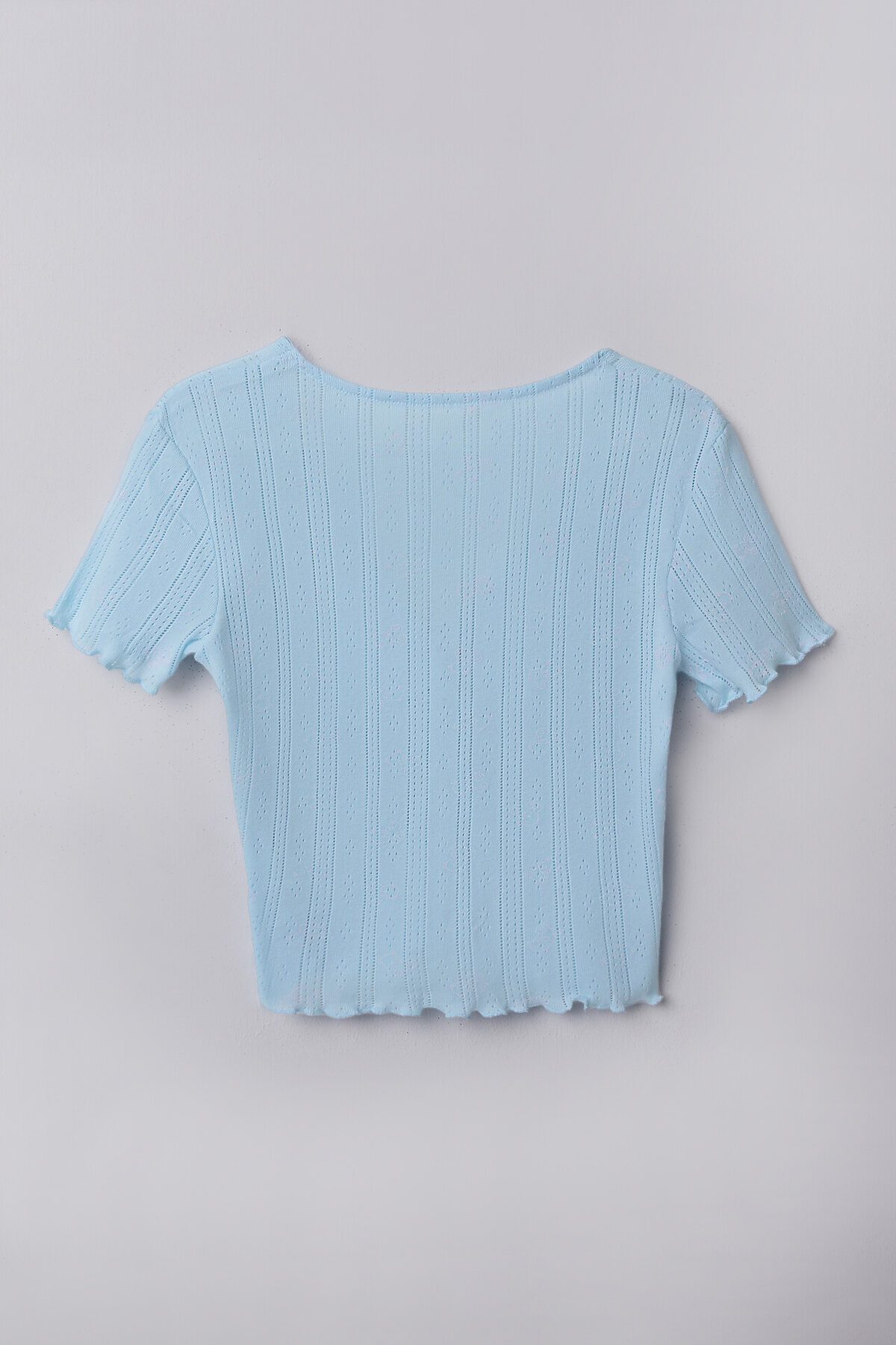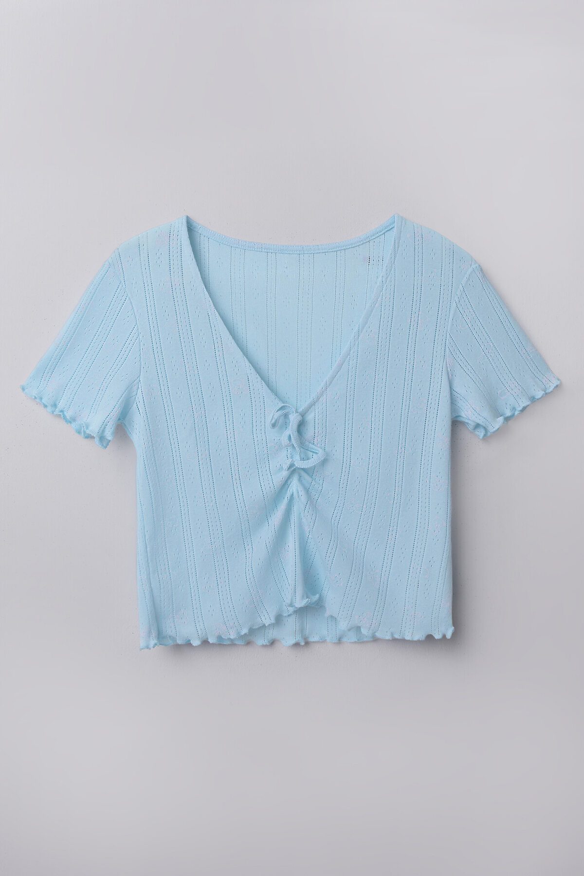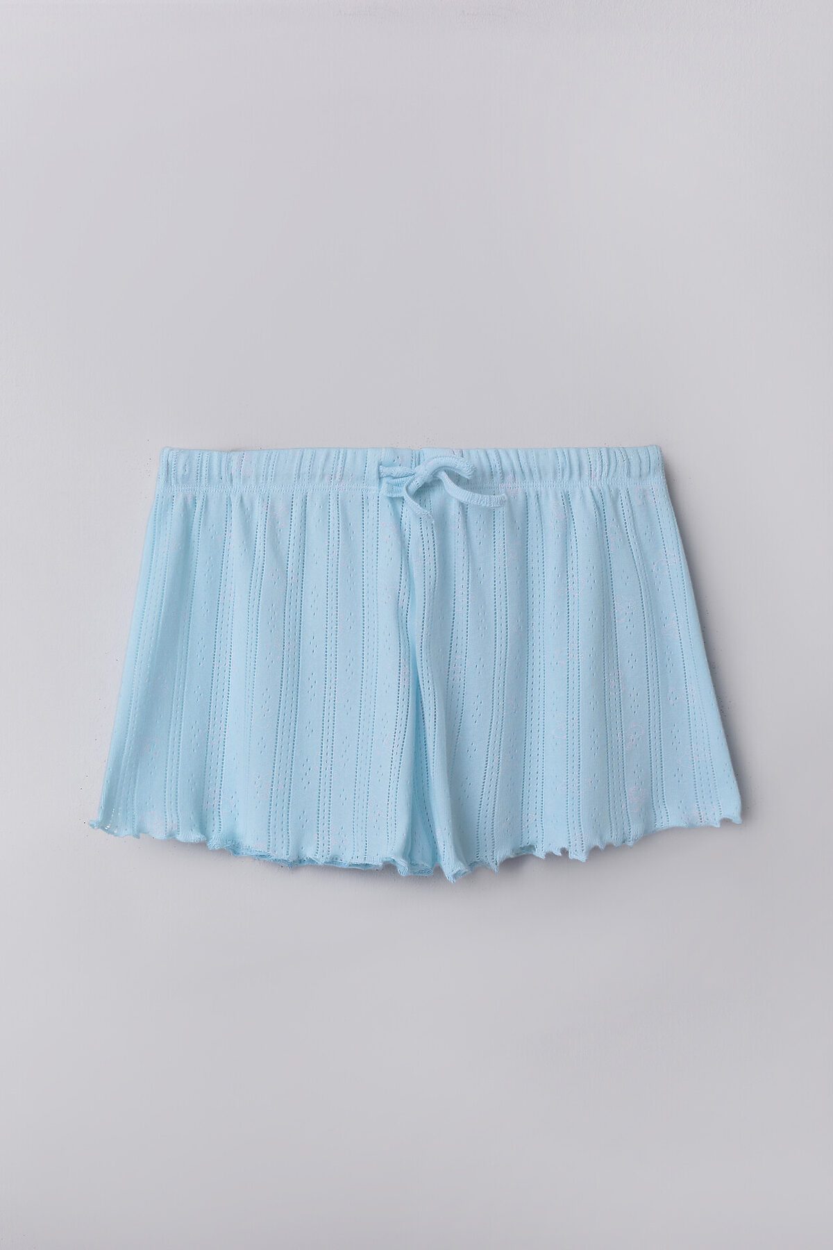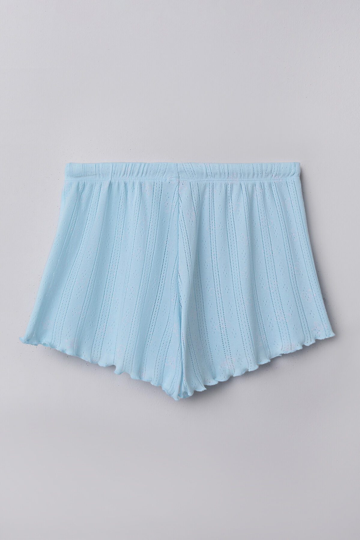Топ прилегающего силуэта. Перед и спинка цельнокроеные. На груди сборка, внутри жилка WT4-6, притачен бантик из основного полотна. Горловина V-образной формы, края обработаны в «чистый край». Рукава короткие, втачные. Низ топа и рукавов обработан на микрооверлоке. Шорты свободного силуэта, короткие. Пояс цельнокроеный, с втаченой эластичной тесьмой 30 RV. По центру пояса пробиты петли, протянута бейка из основного полотна. Низ шорт обработан на микрооверлоке.