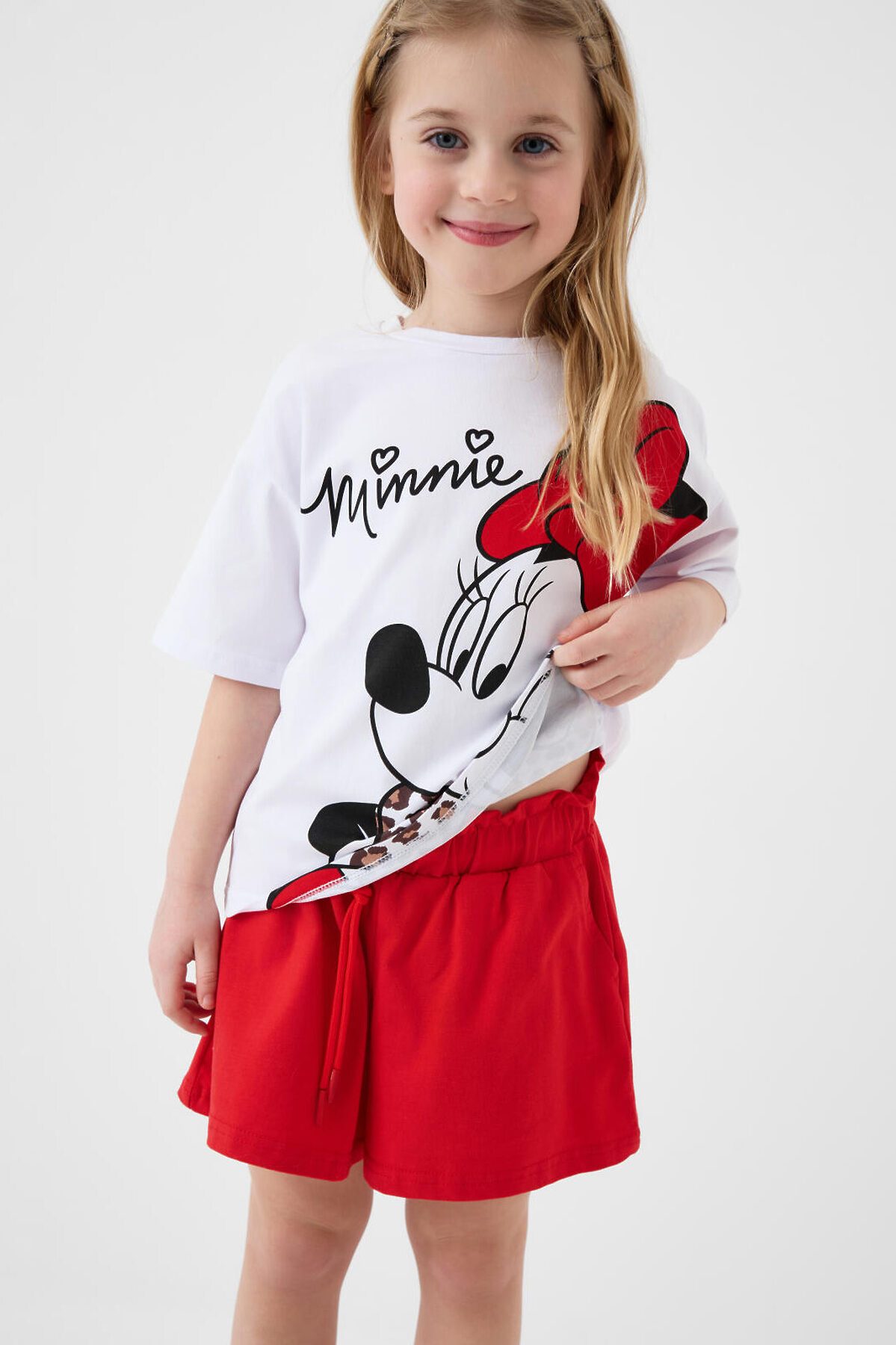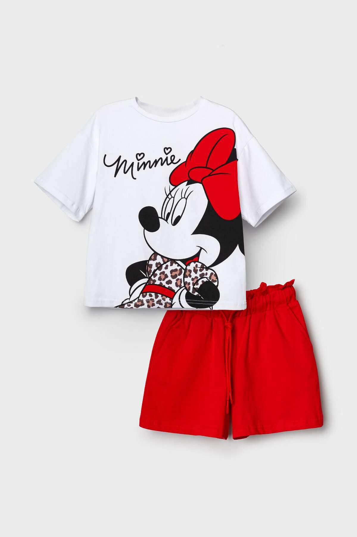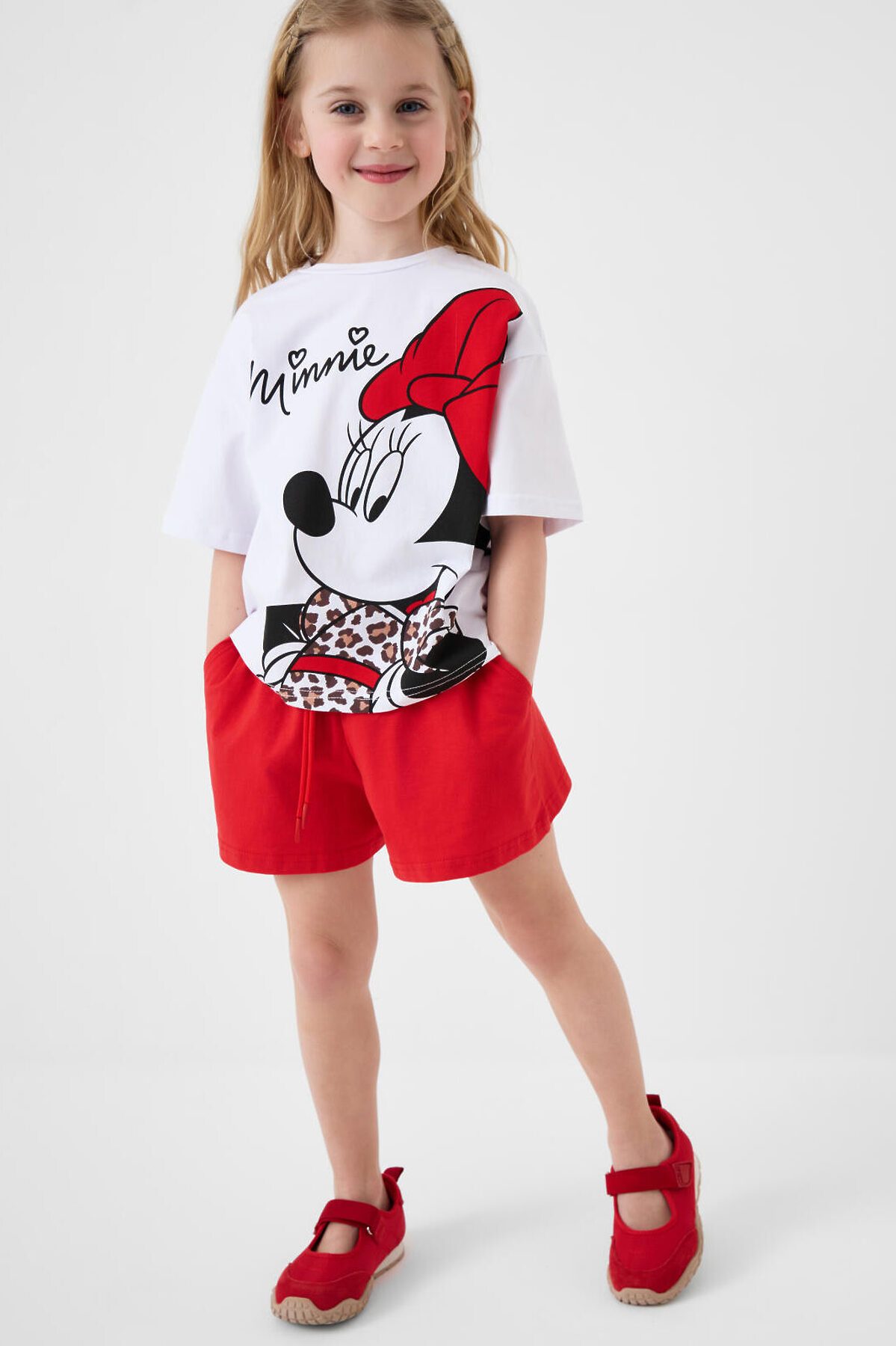 Детский костюм для девочки. Состоит из футболки с коротким рукавом и шорт. Выполнен из хлопкового трикотажа. Футболка оверсайз, с красочным принтом Минни Маус. Шорты свободные, хорошо сидят на талии благодаря эластичному поясу и регулирующему шнурку. Удобные боковые карманы.