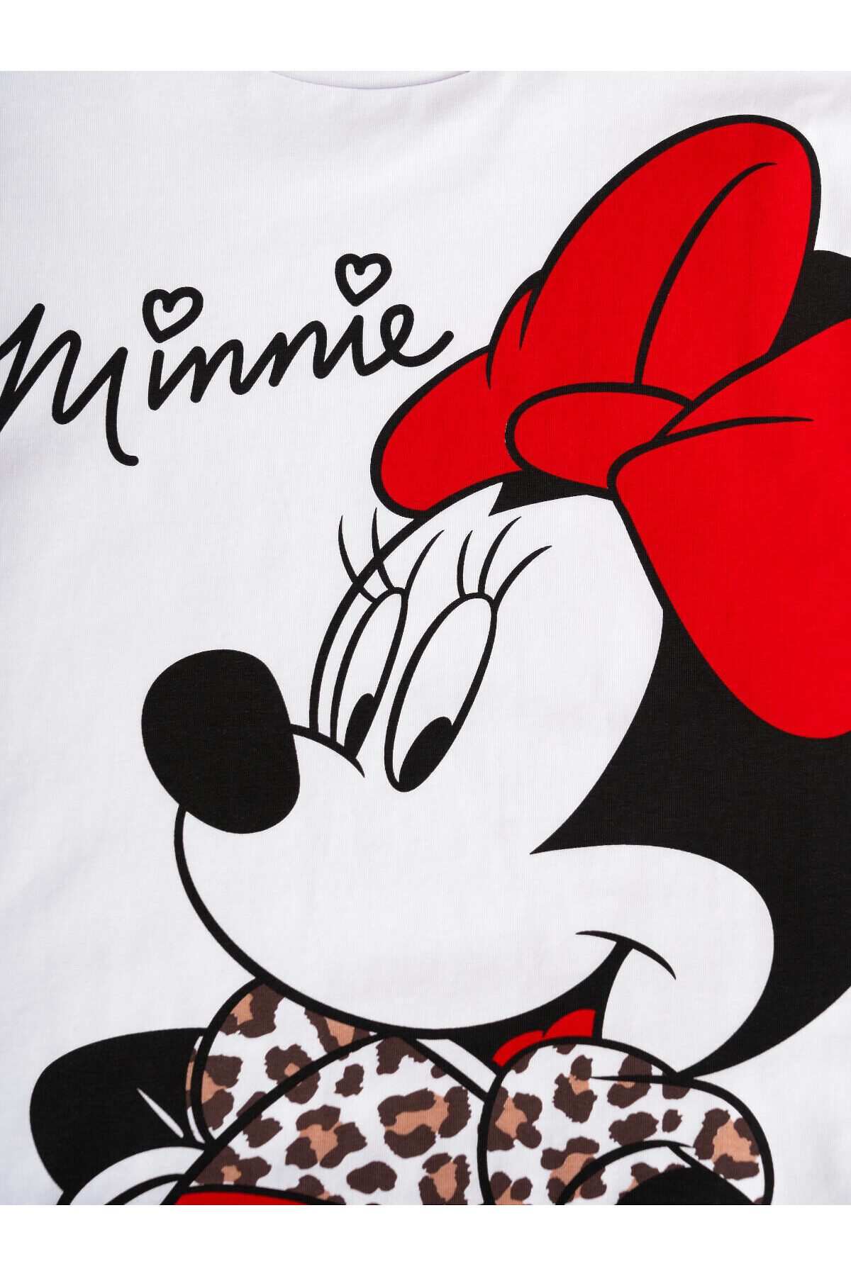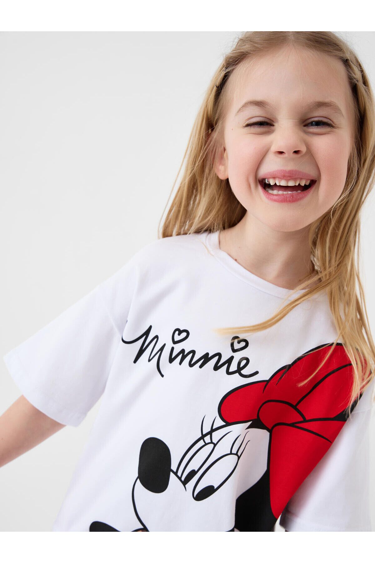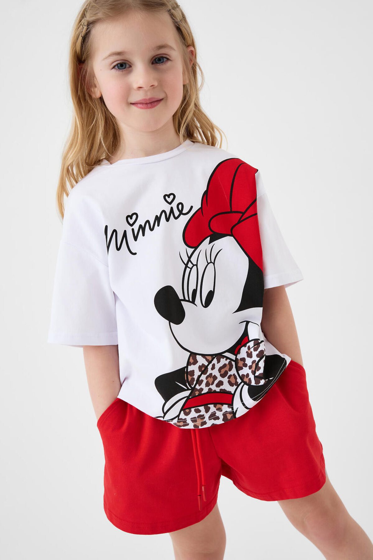 Детский костюм для девочки. Состоит из футболки с коротким рукавом и шорт. Выполнен из хлопкового трикотажа. Футболка оверсайз, с красочным принтом Минни Маус. Шорты свободные, хорошо сидят на талии благодаря эластичному поясу и регулирующему шнурку. Удобные боковые карманы.