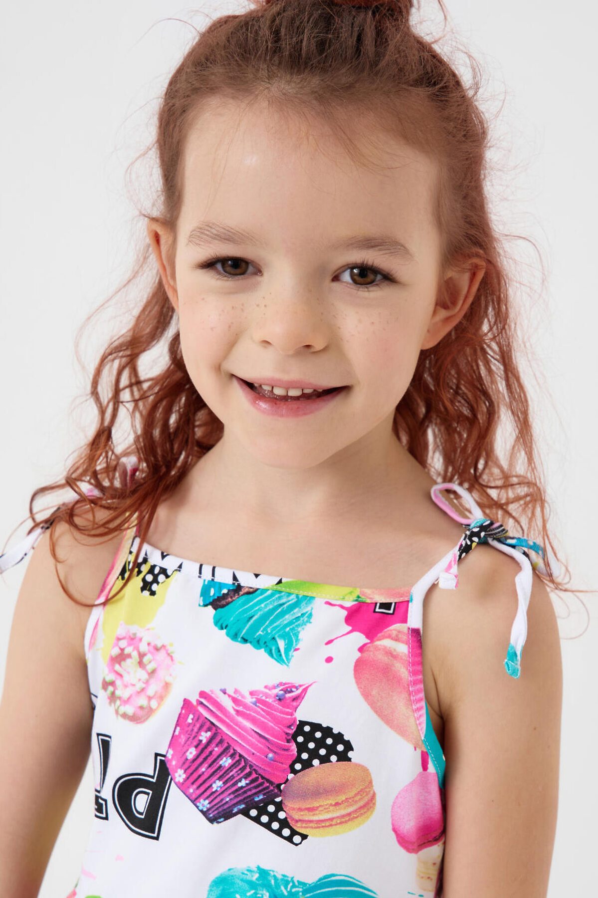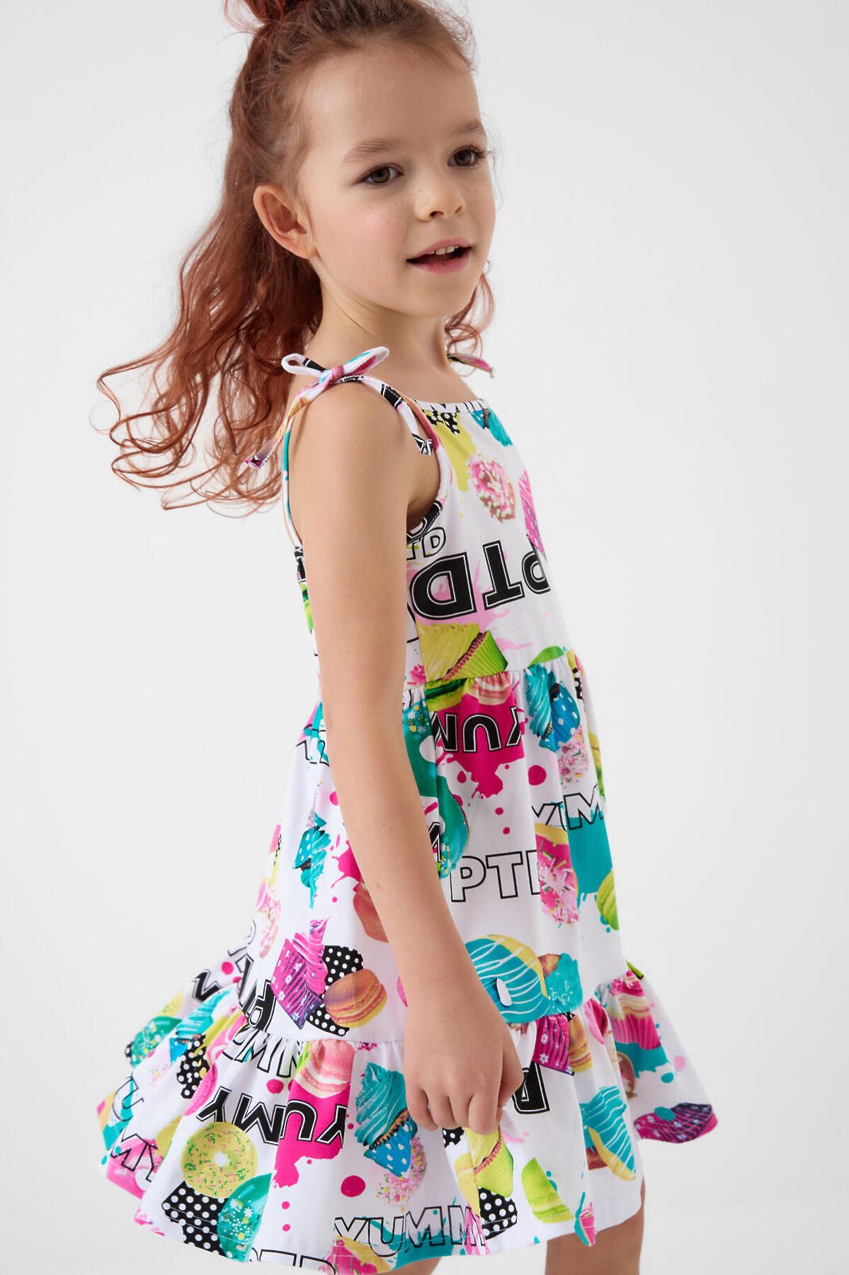 Яркий летний детский сарафан для девочки. Модель из мягкого хлопкового трикотажа джерси. Платье средней длины - чуть выше колена, с прямым силуэтом и широкой юбкой, создающей эффект лёгкости и объёма. Удобные тонкие бретельки завязываются на плечах в бантики. Основной акцент в дизайне — сочный многоцветный принт с десертами и сладостями: капкейки, конфеты, леденцы и надписи.