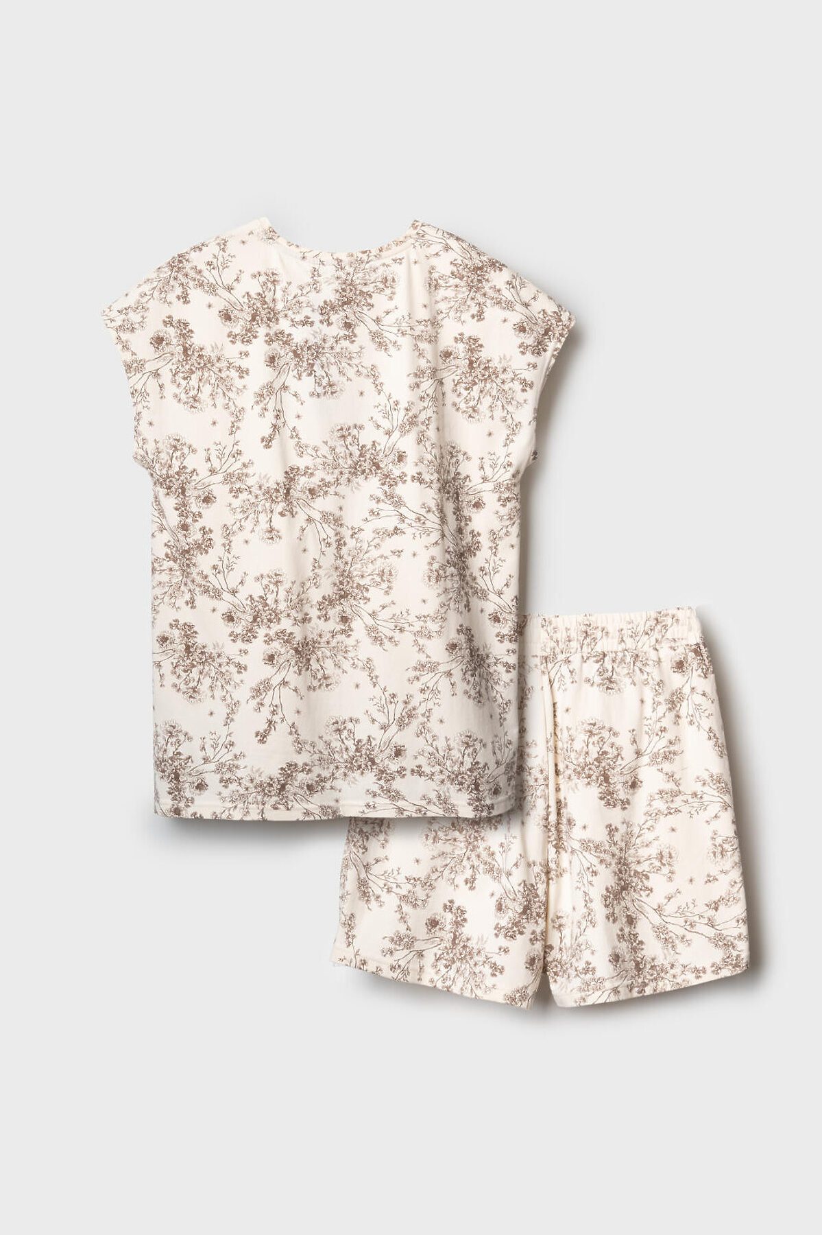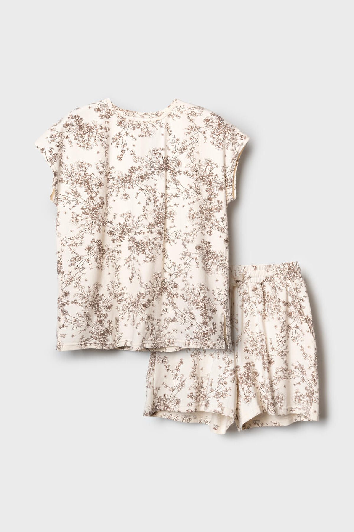 Женская пижама. Комплект из хлопкового трикотажа состоит из футболки с короткими рукавами и свободных шорт. Футболка прямого кроя, с круглым вырезом. Шорты на широкой резинке с регулирующим шнурком. Удобные боковые карманы.