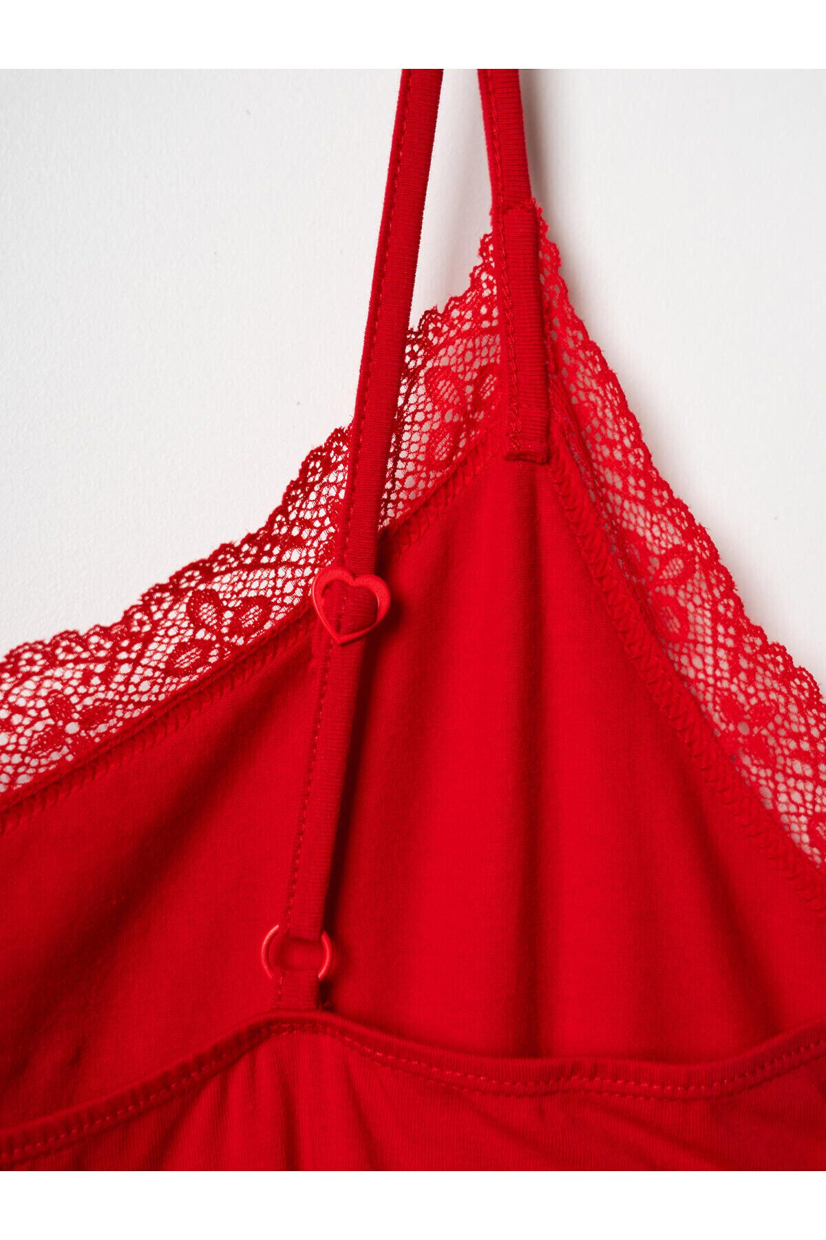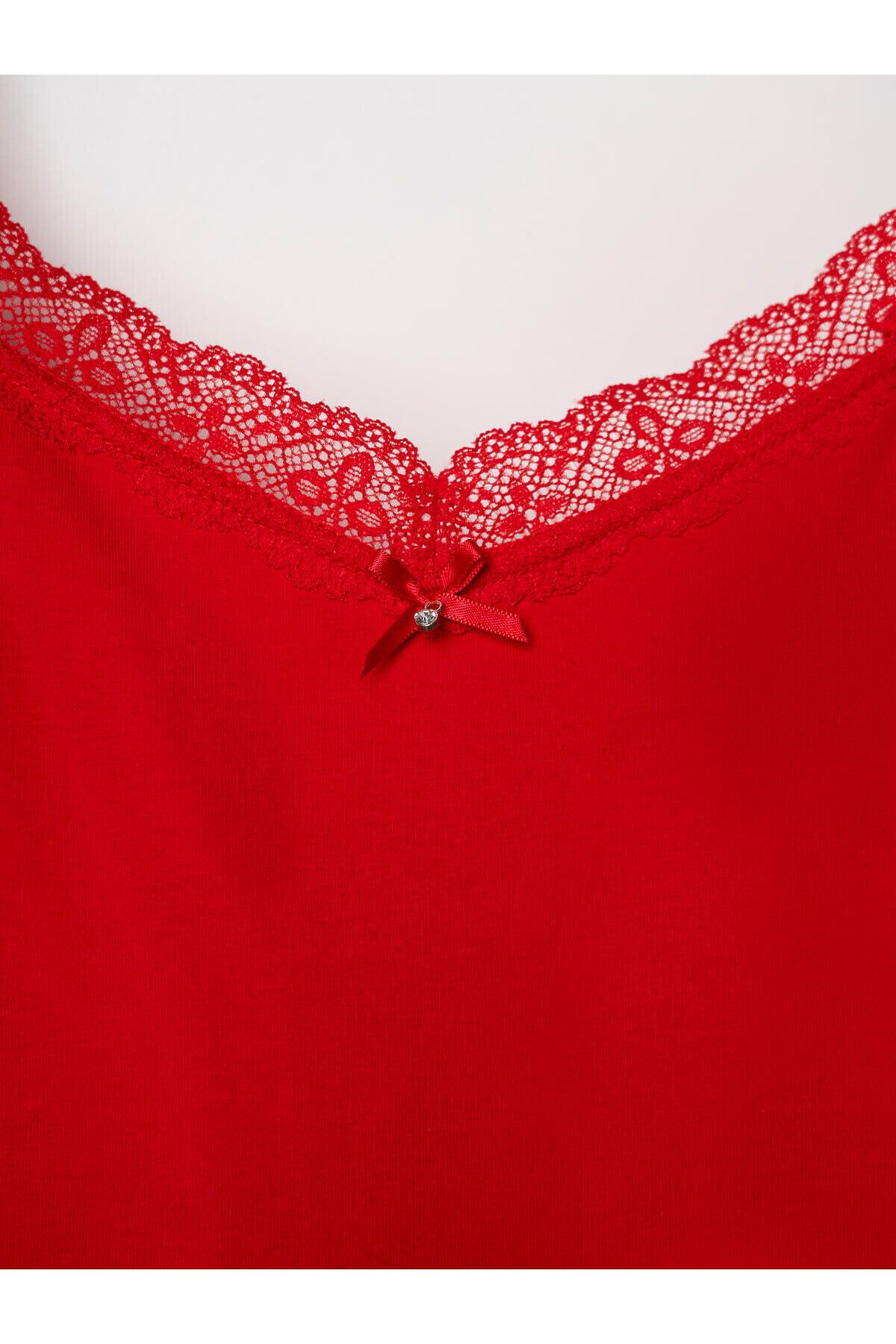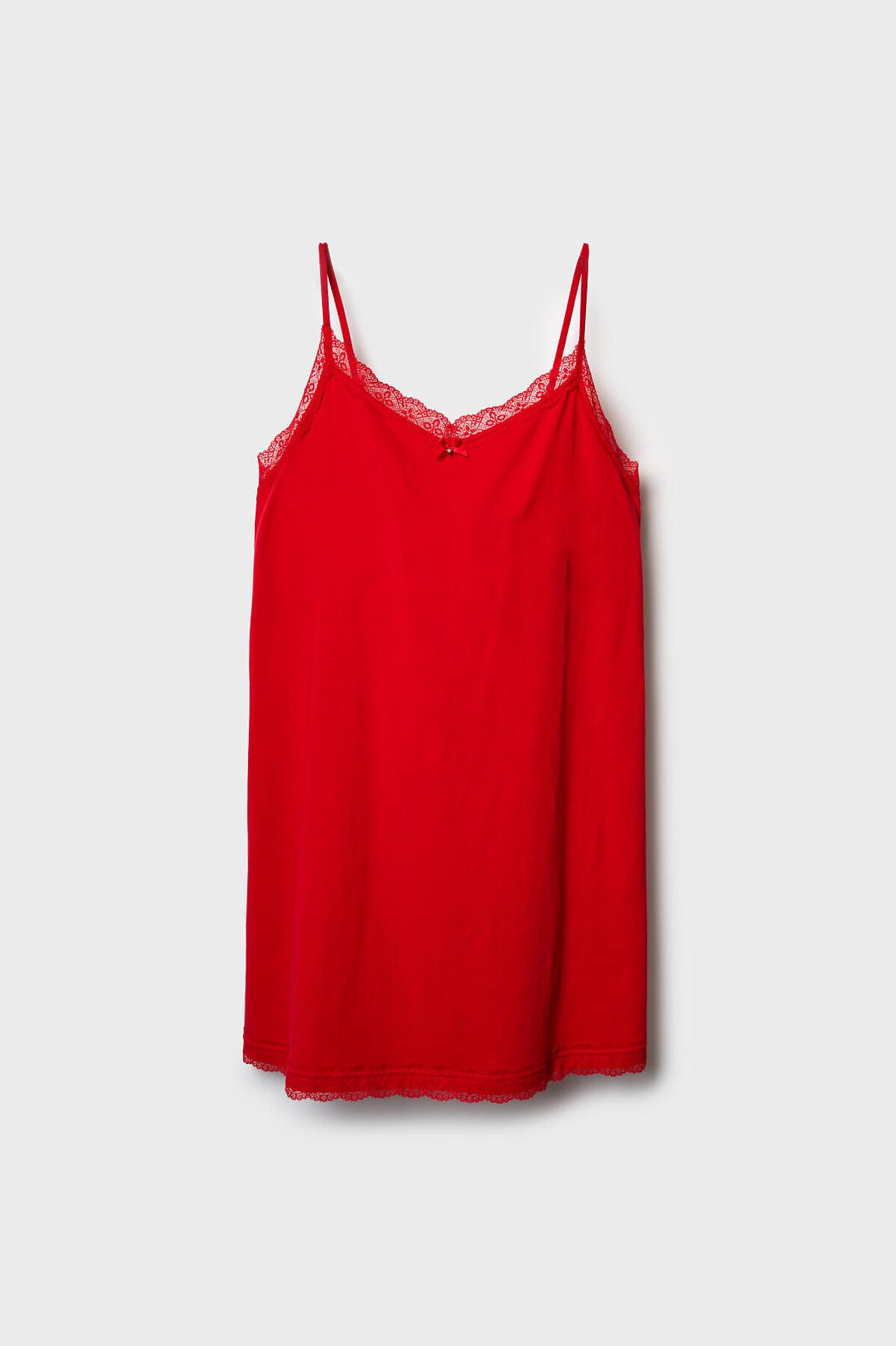 Женская ночная сорочка свободного кроя на тонких регулируемых бретелях. Сорочка выполнена из мягкого хлопкового трикотажа с добавлением эластана, что делает её комфортной и эластичной. Передняя часть с V-образным вырезом с кружевной отделкой и небольшим бантиком. По низу изделия также проходит кружевная отделка. На спинке вшита эластичная тесьма, обеспечивающая хорошую посадку.