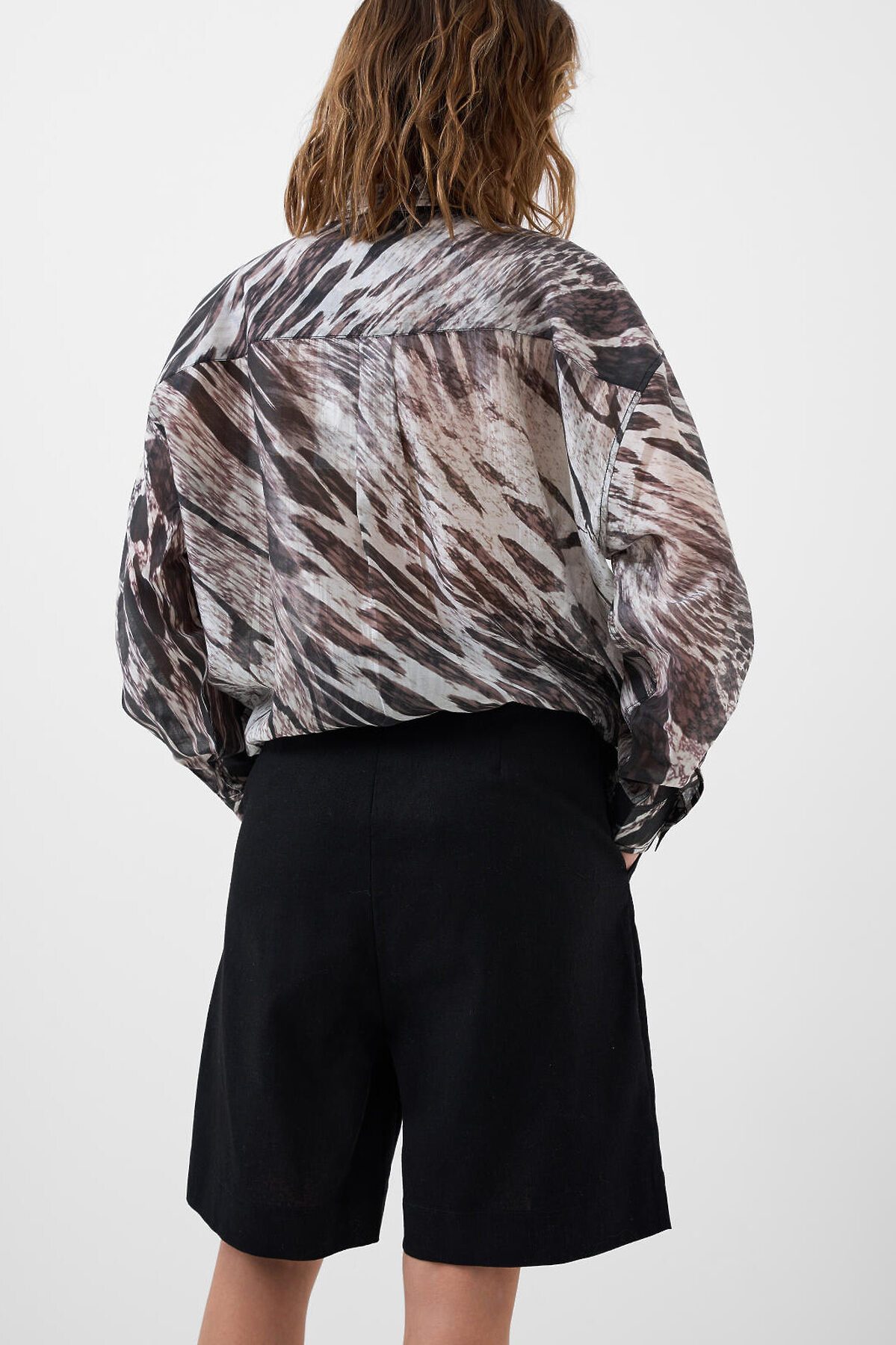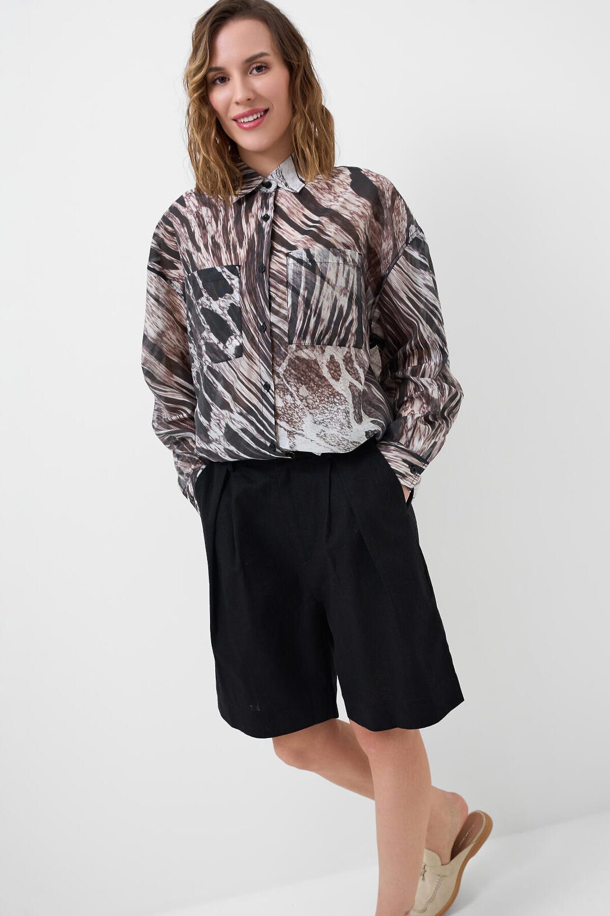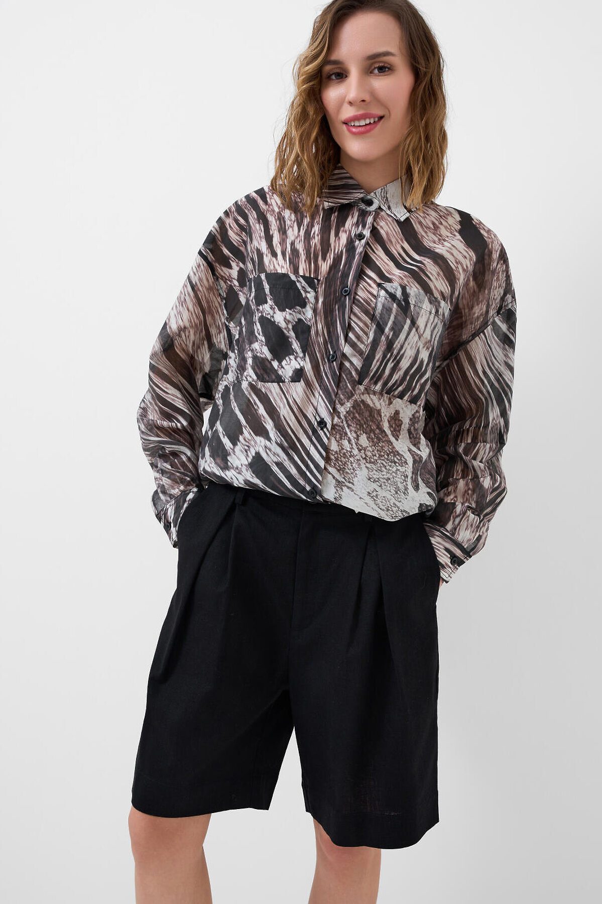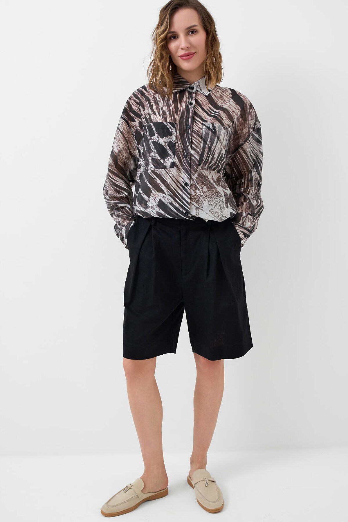 Классические женские льняные шорты. Модель средней длины, чуть выше колена. Комфортная посадка и прямой силуэт, который немного расширяется к низу. Шорты застёгиваются на молнию и пуговицу, и имеют боковые карманы. Пояс дополнен шлёвками для ремня.