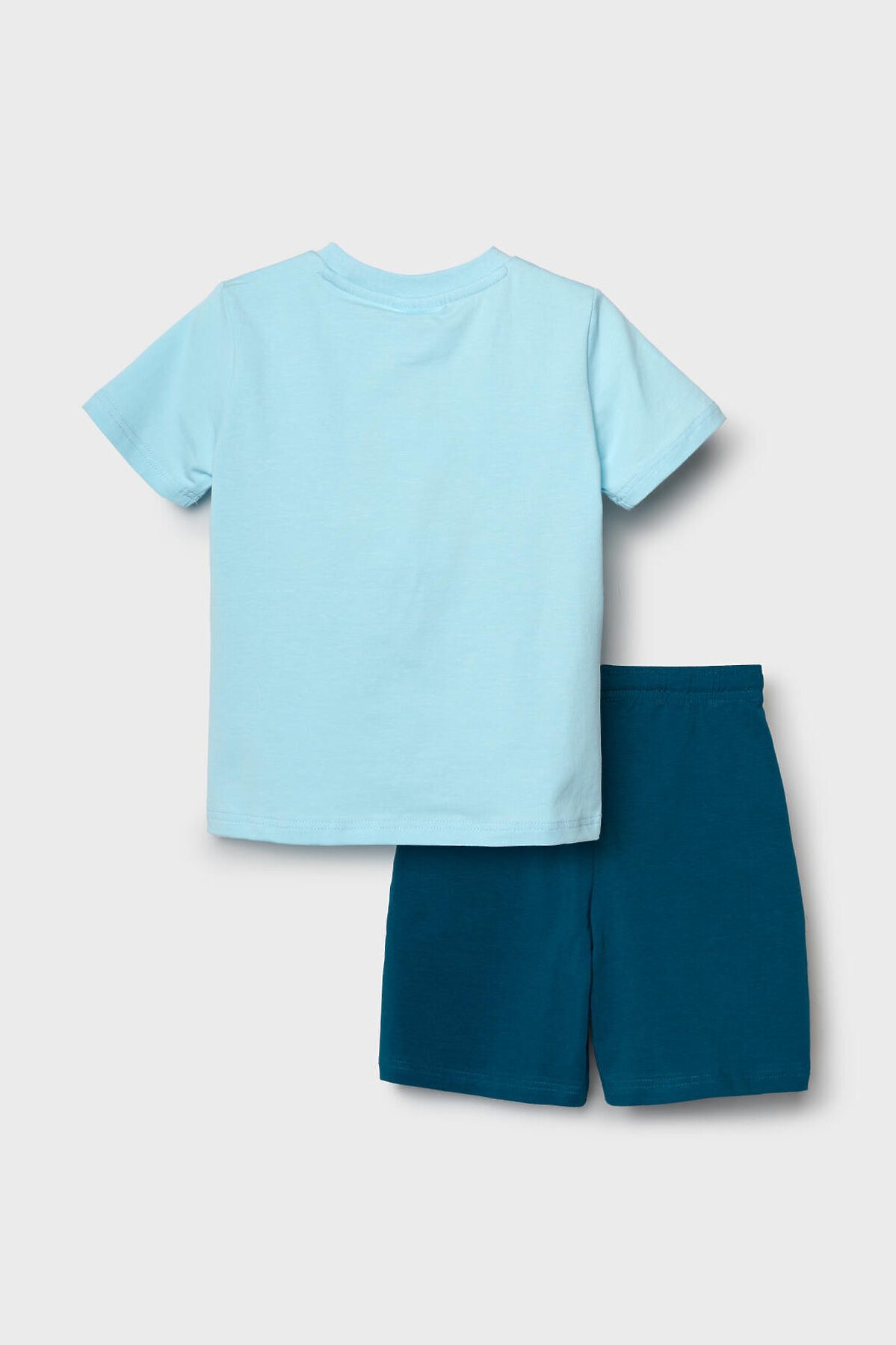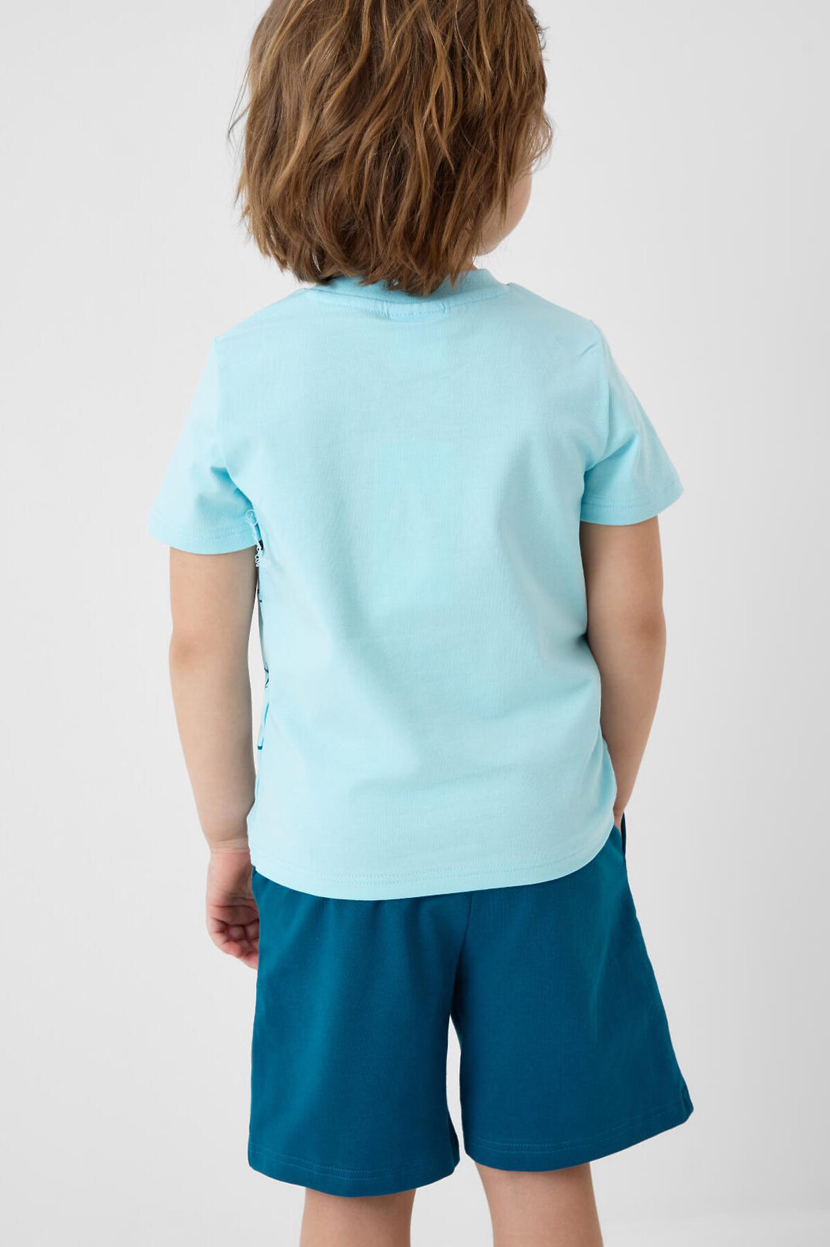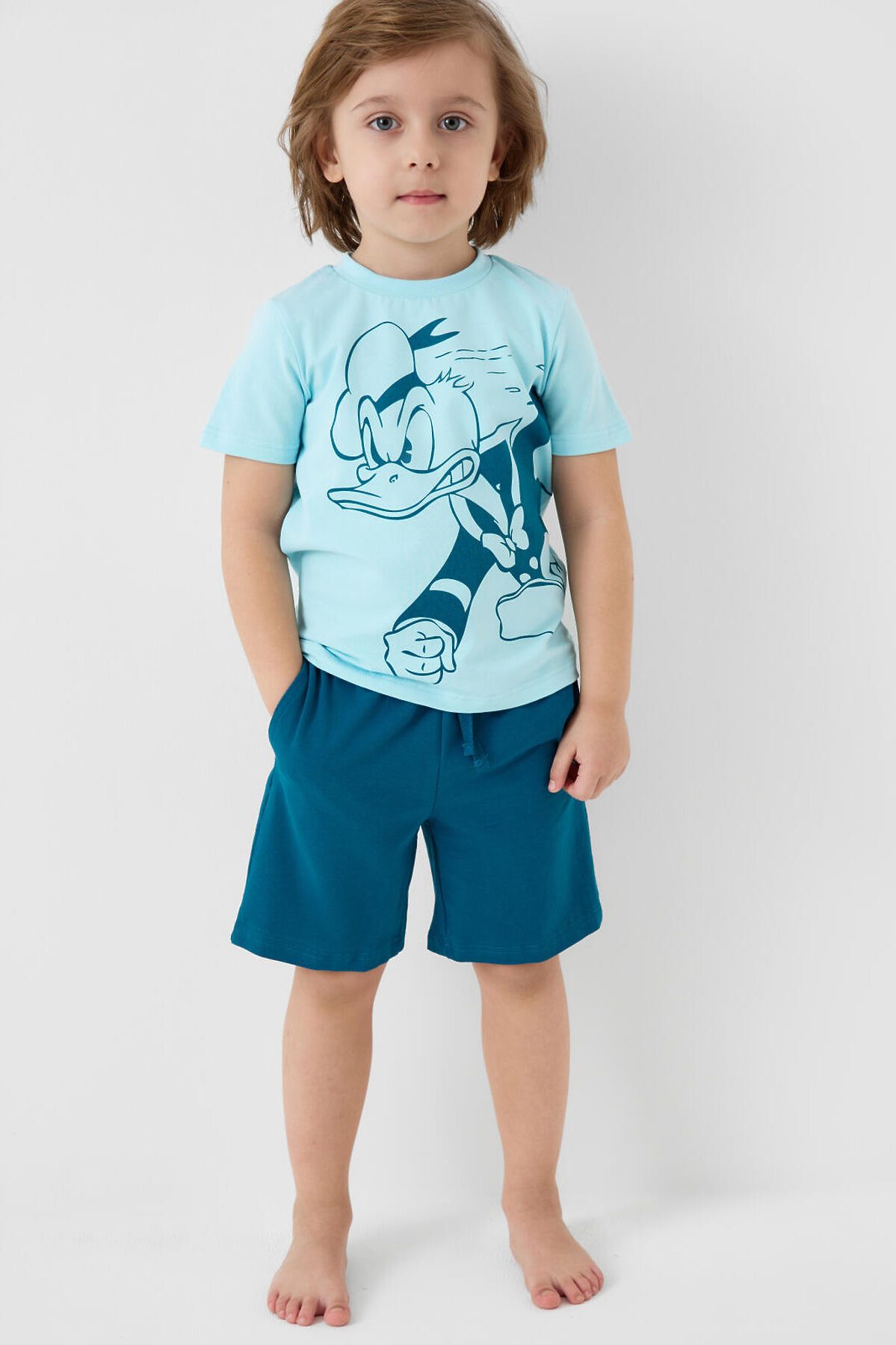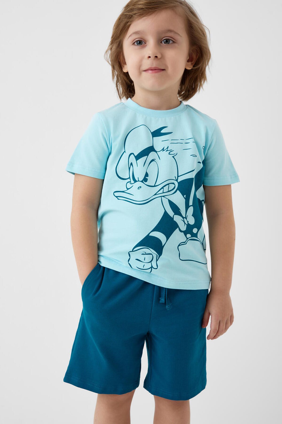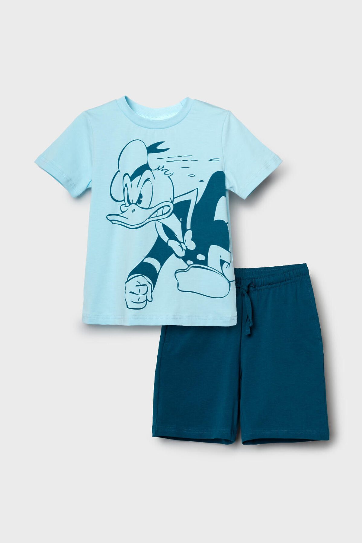 Пижама детская для мальчика. Комплект состоит из футболки, прямого кроя с короткими рукавами и шорт. На футболке яркий и крупный принт с Дональдом Даком. Шорты оснащены удобным эластичным поясом с шнурком для регулировки. Есть боковые карманы. Материал — мягкий и комфортный хлопковый трикотаж.
