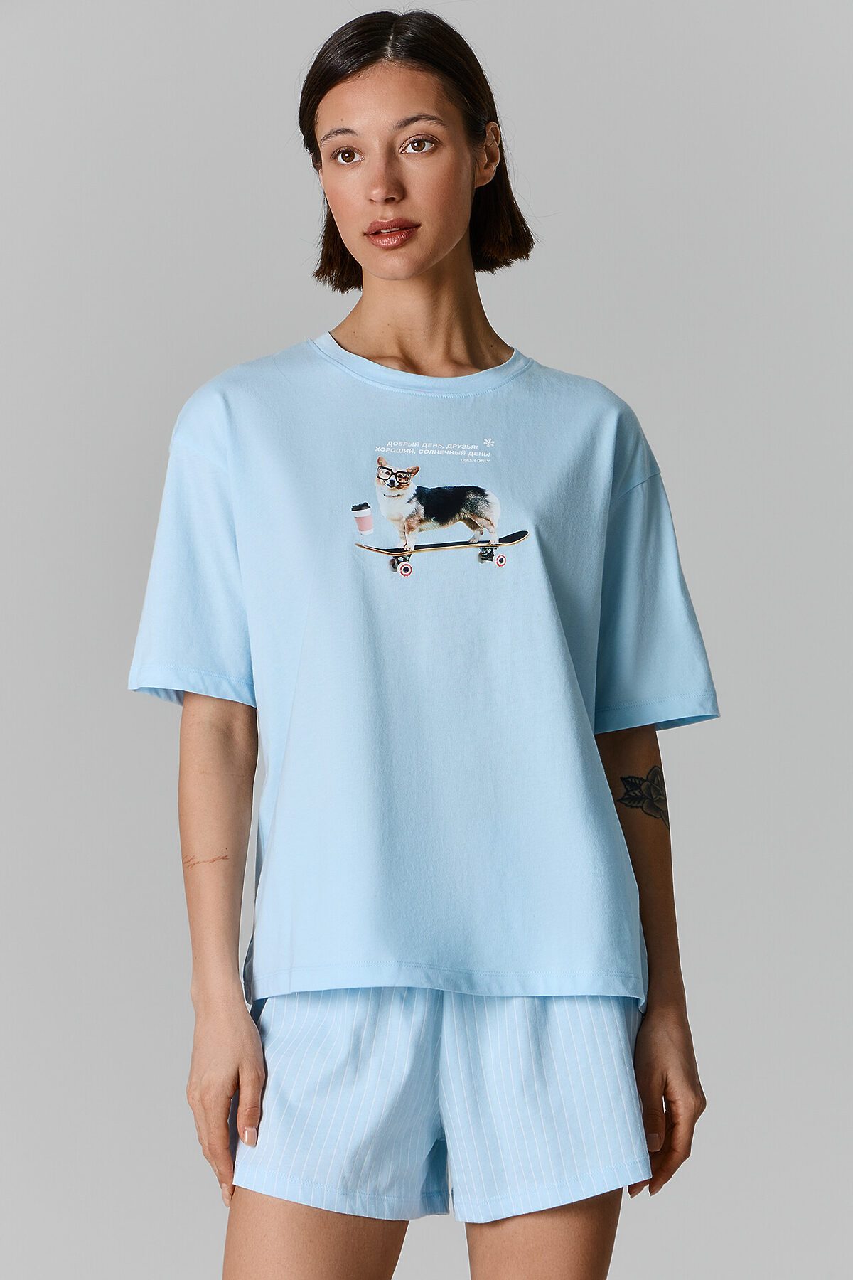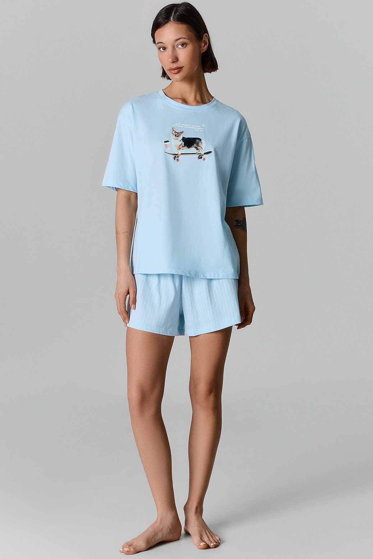 Домашний комплект для женщин — это пижама для комфортного сна и отдыха. Комплект из свободной футболки и коротких шортов из мягкого хлопка.