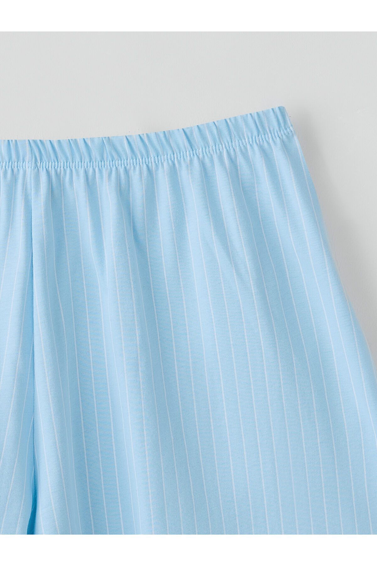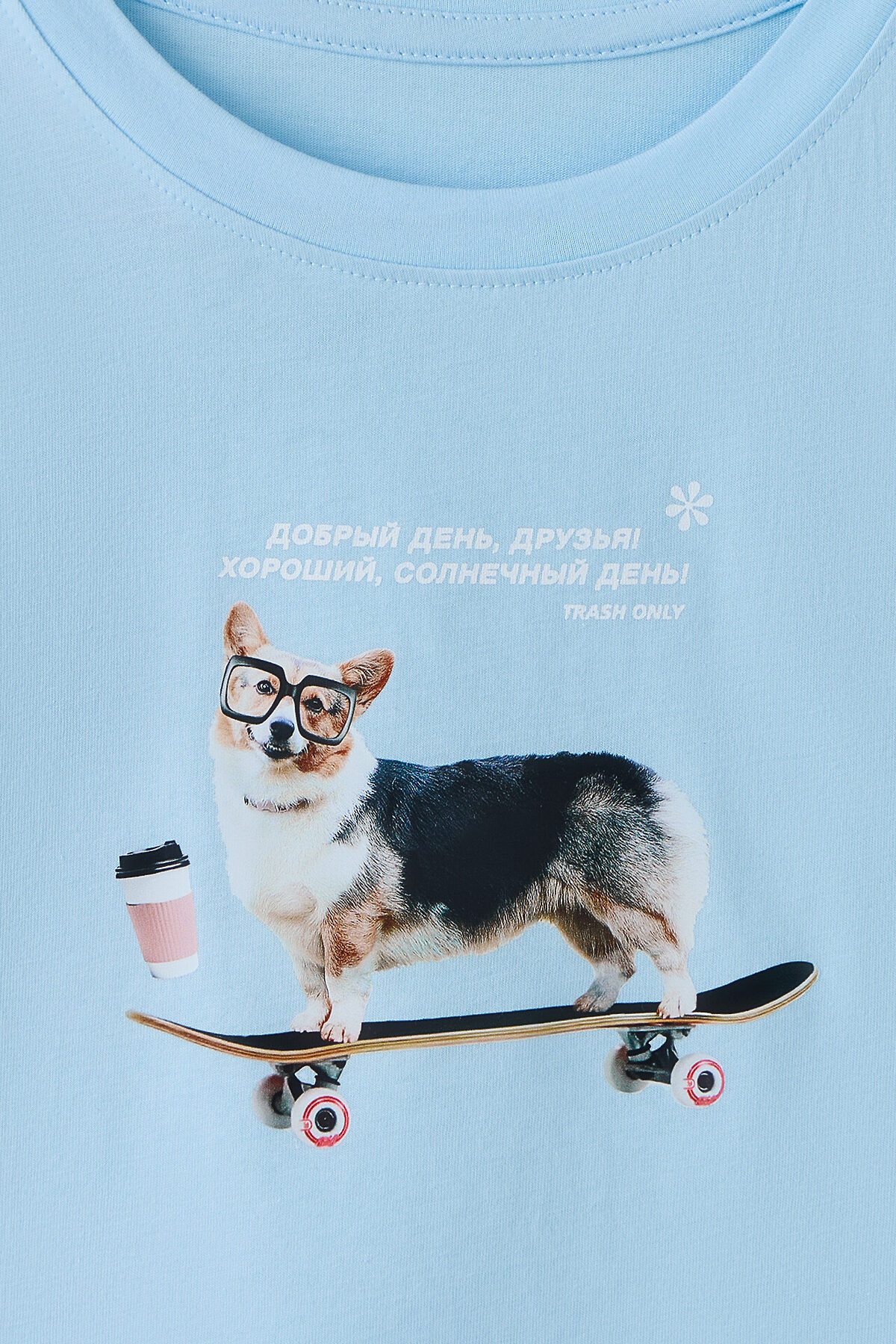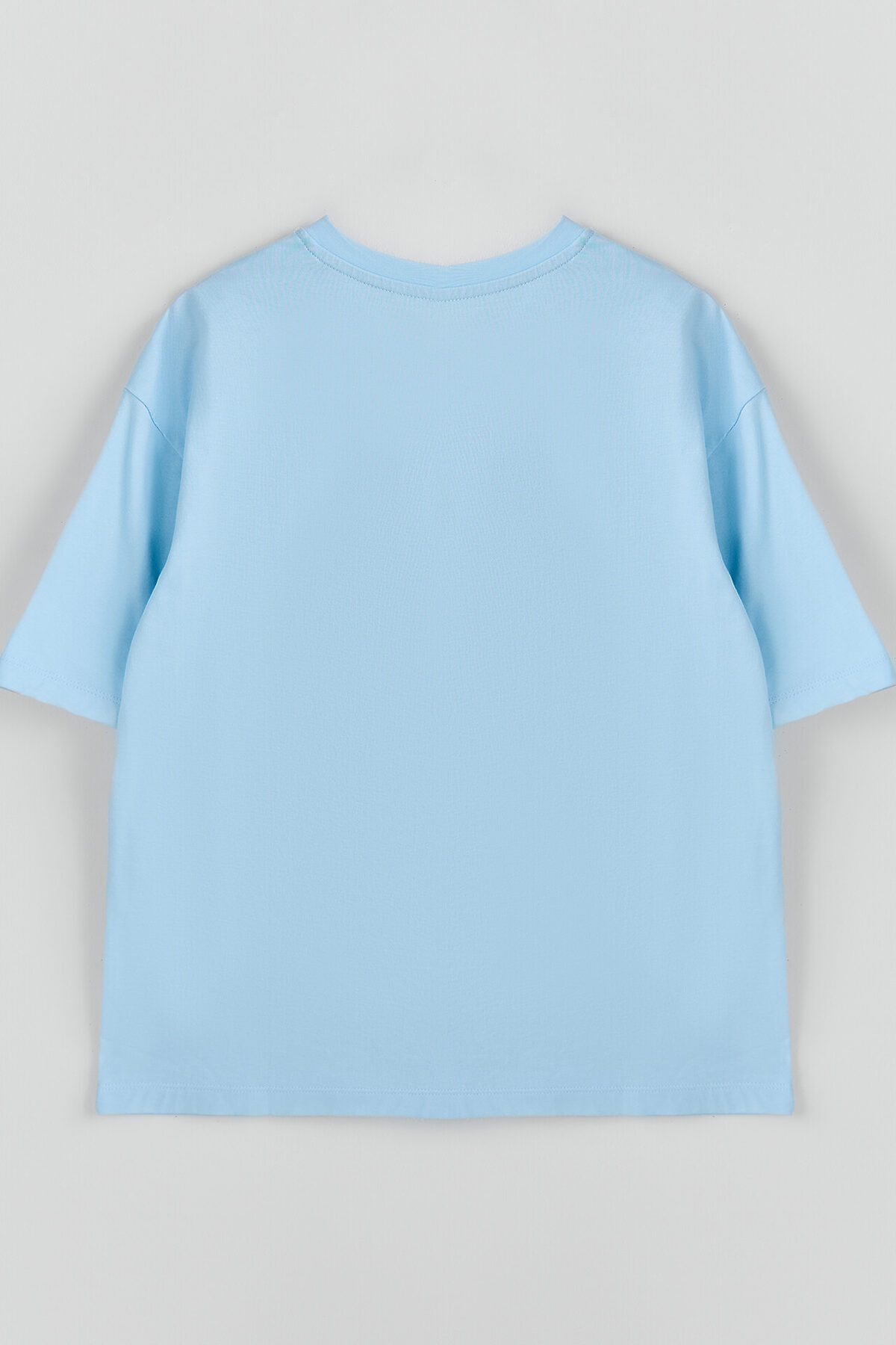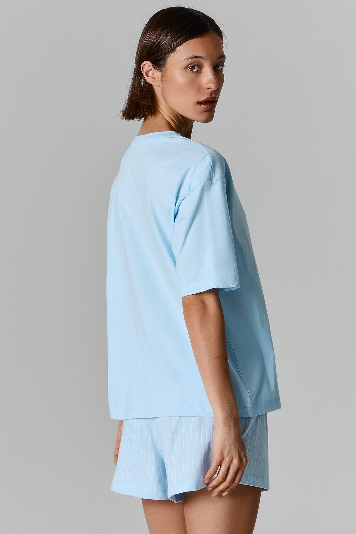 Комплект изготовлен из хлопка. Этот натуральный материал хорошо пропускает воздух, впитывает влагу и быстро сохнет, обеспечивая комфорт, особенно в тёплое время года. Нежный голубой цвет, романтичный принт и надпись создают лёгкое и мечтательное настроение.