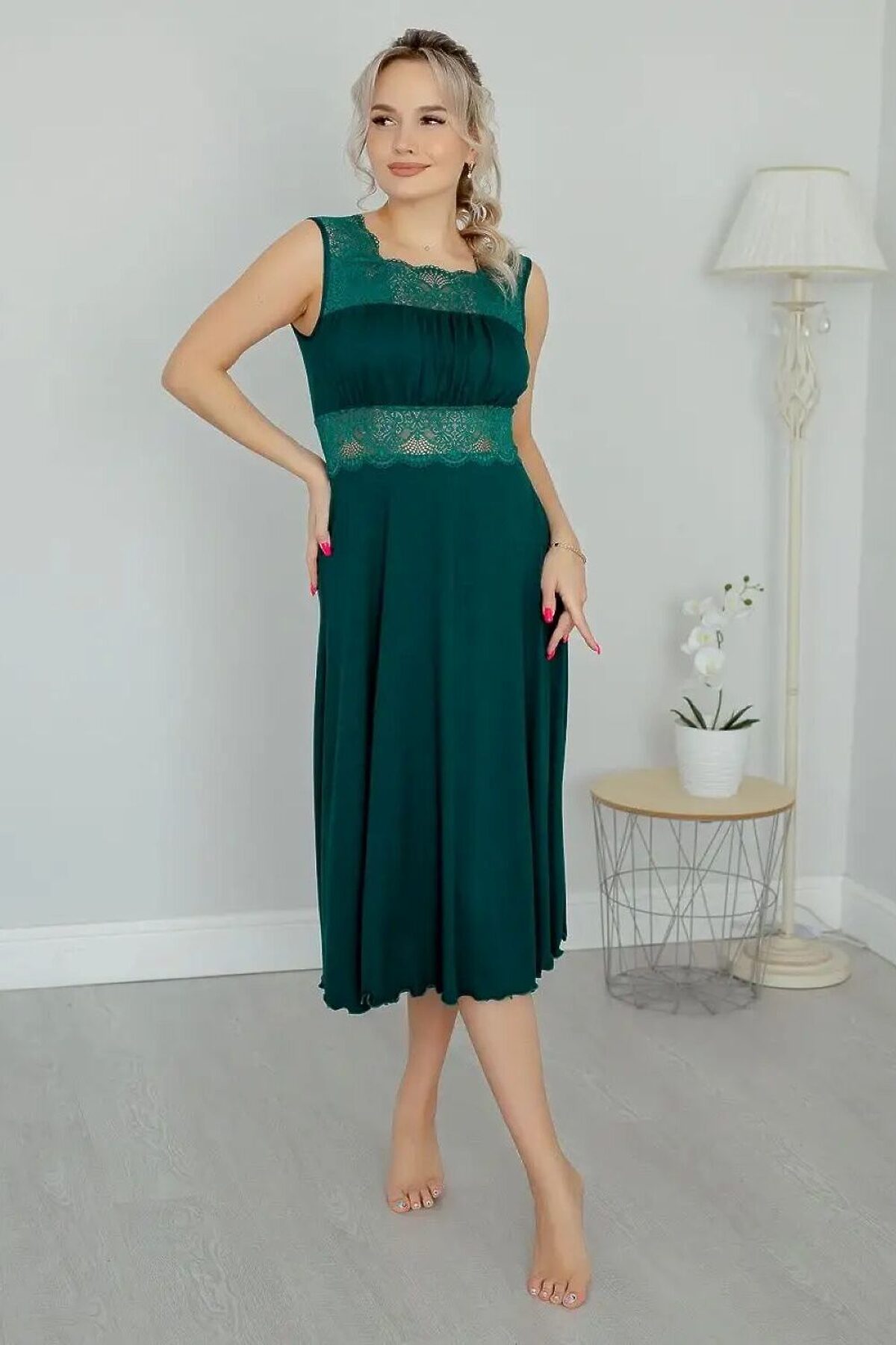 Ночная сорочка длинная прилегающего силуэта, расклешенная к низу от груди модная и стильная модель, выполненная из мягкой ткани и украшенная эластичным кружевом. Двойная кокетка с верхней задрапированной частью, удачно поддерживает грудь, создавая при этом приятное и комфортное ощущение. Верхние и нижние срезы кокеток и широкие бретели, выполненные из эластичного кружева, обеспечивают отличную посадку на плечах, не сковывают движения и мягко обхватывают тело. Ночнушка изготовлена из вискозной ткани, она мягкая и нежная для осязания, имеет малый вес, хорошо регулирует теплообмен, пропускает воздух, не электризуется, не вызывает раздражение кожи, удерживает цвет. Эта модель рубашки для сна больших размеров прилегающего силуэта является прекрасным выбором для женщин, которые хотят выглядеть красиво и чувствовать себя уютно и расслабленно дома. Она подходит для тех, кто ищет удобную и красивую ночную одежду. Данная модель подходит для девушек и женщин всех возрастов. Рубашка, благодарю крою подойдет для беременных и кормящих мам. Благодаря своей универсальности может использоваться как уютное домашнее платье. Стильное, современное и комфортное платье для дома, которое необходимо в любой сезон. Широкий размерный ряд: от маленьких до больших, сорочка сядет на любую фигуру. Подойдет на любой рост: для высоких, для невысоких и дам среднего роста. Подходящий вариант для каждого возраста. Приобретайте нашу одежду для дома и почувствуйте себя Королевой. Эффектная кружевная ночнушка станет отличным подарком. Ночнушка подойдет для походов в роддом. Сделайте выбор в пользу качественной и стильной одежды и наслаждайтесь приятным сном и отдыхом.
