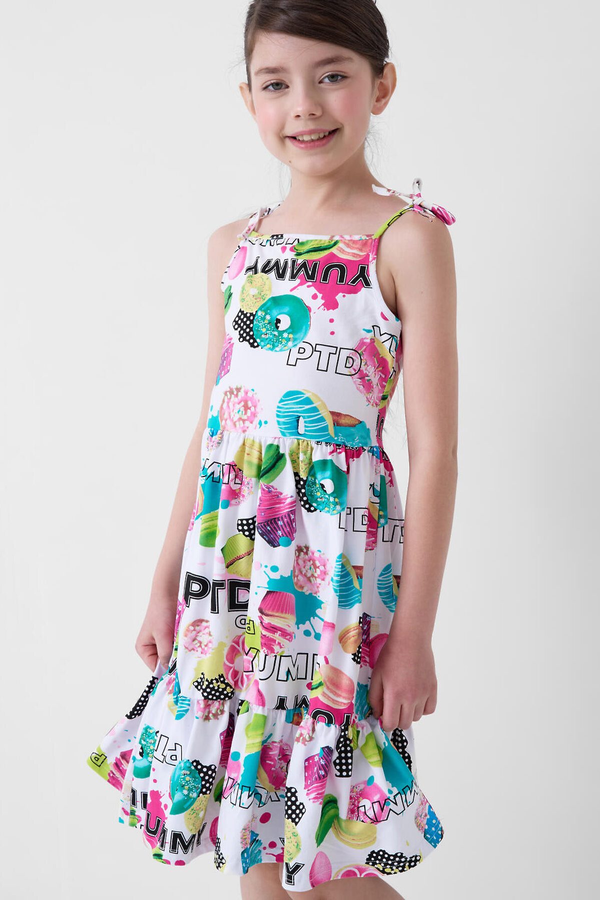 Летний сарафан для девочки подростка. Выполнен из мягкого хлопкового трикотажа джерси. Состоит из верха на тонких лямках, которые завязываются бантиками, и юбки с лёгкой сборкой. На ткани — красочный принт с изображениями пирожных, капкейков, макарунов и надписями, что делает модель весёлой и модной.