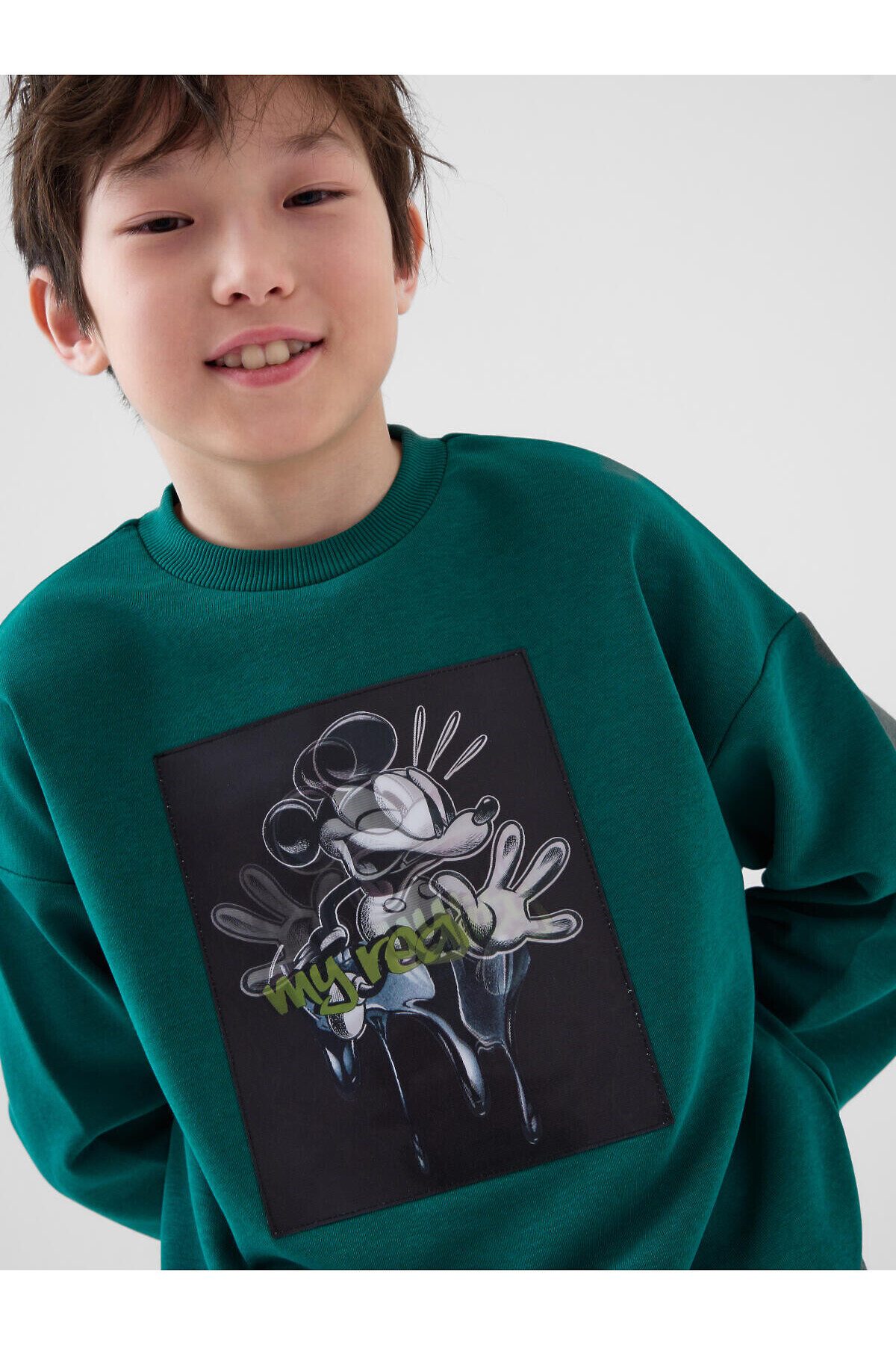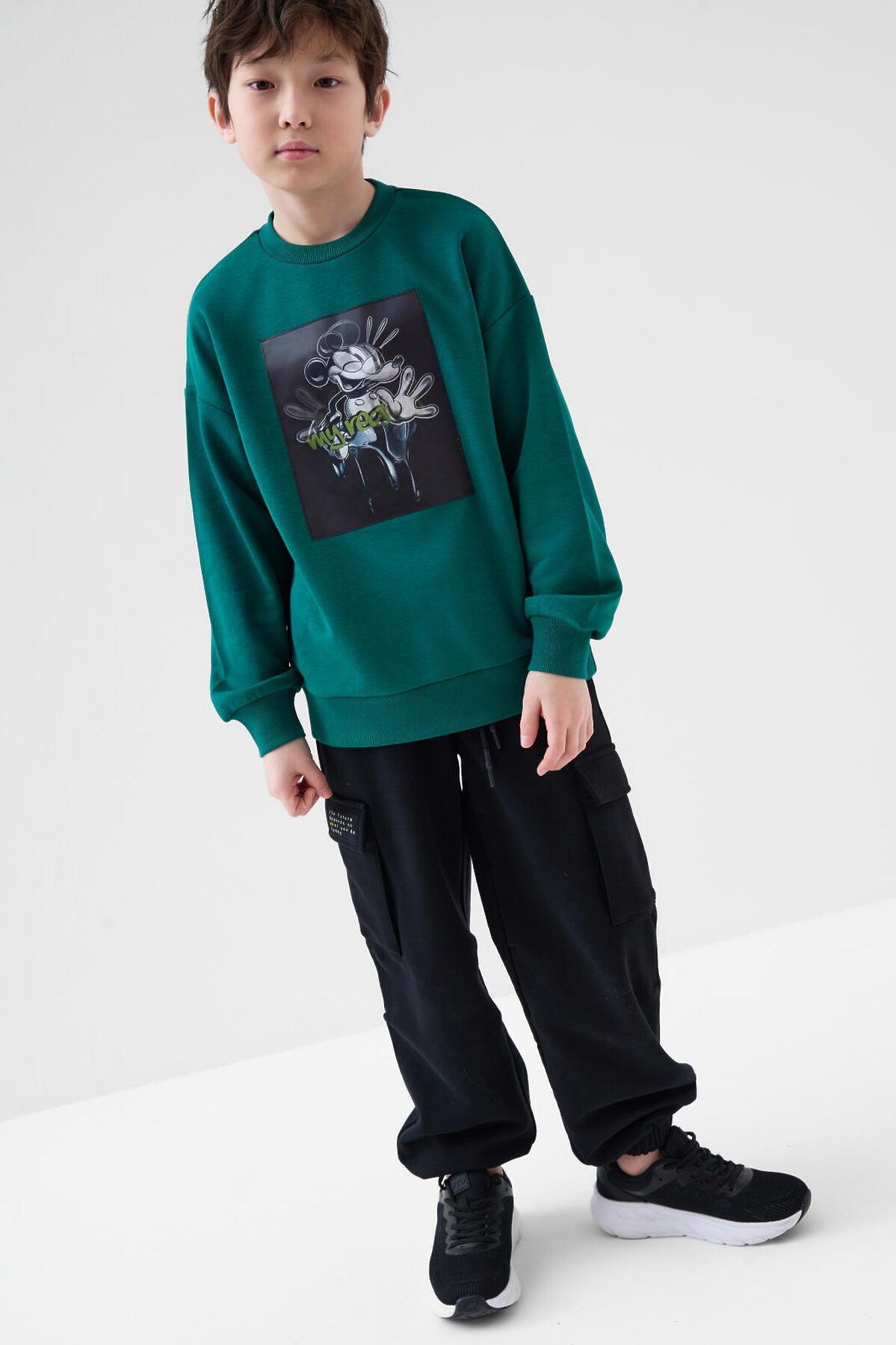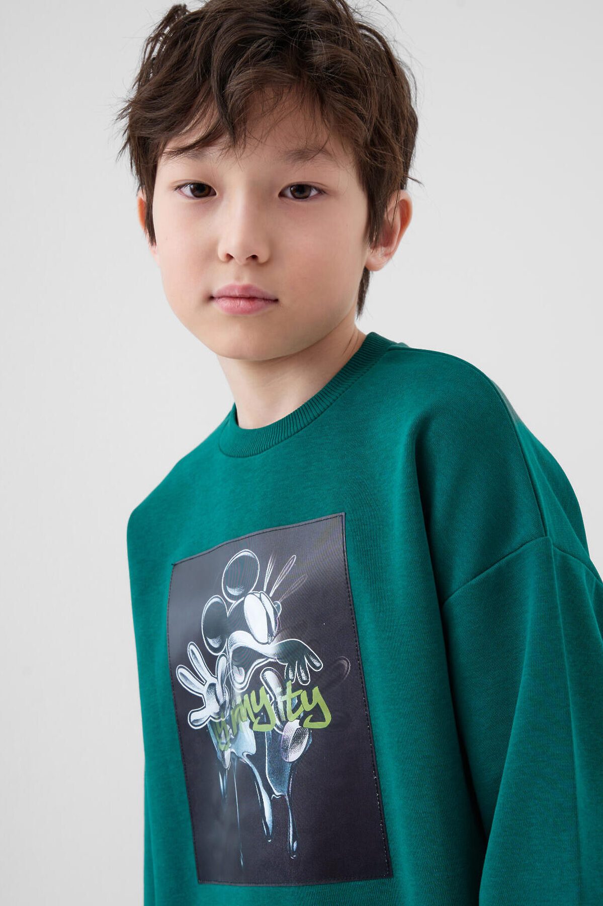 Свитшот оверсайз для мальчика подростка. Выполнен из хлопкового футера без начеса. На груди — принт с любимым мультяшным героем Микки Маусом. Манжеты и низ изделия выполнены из эластичного риба, что обеспечивает комфортную посадку.
