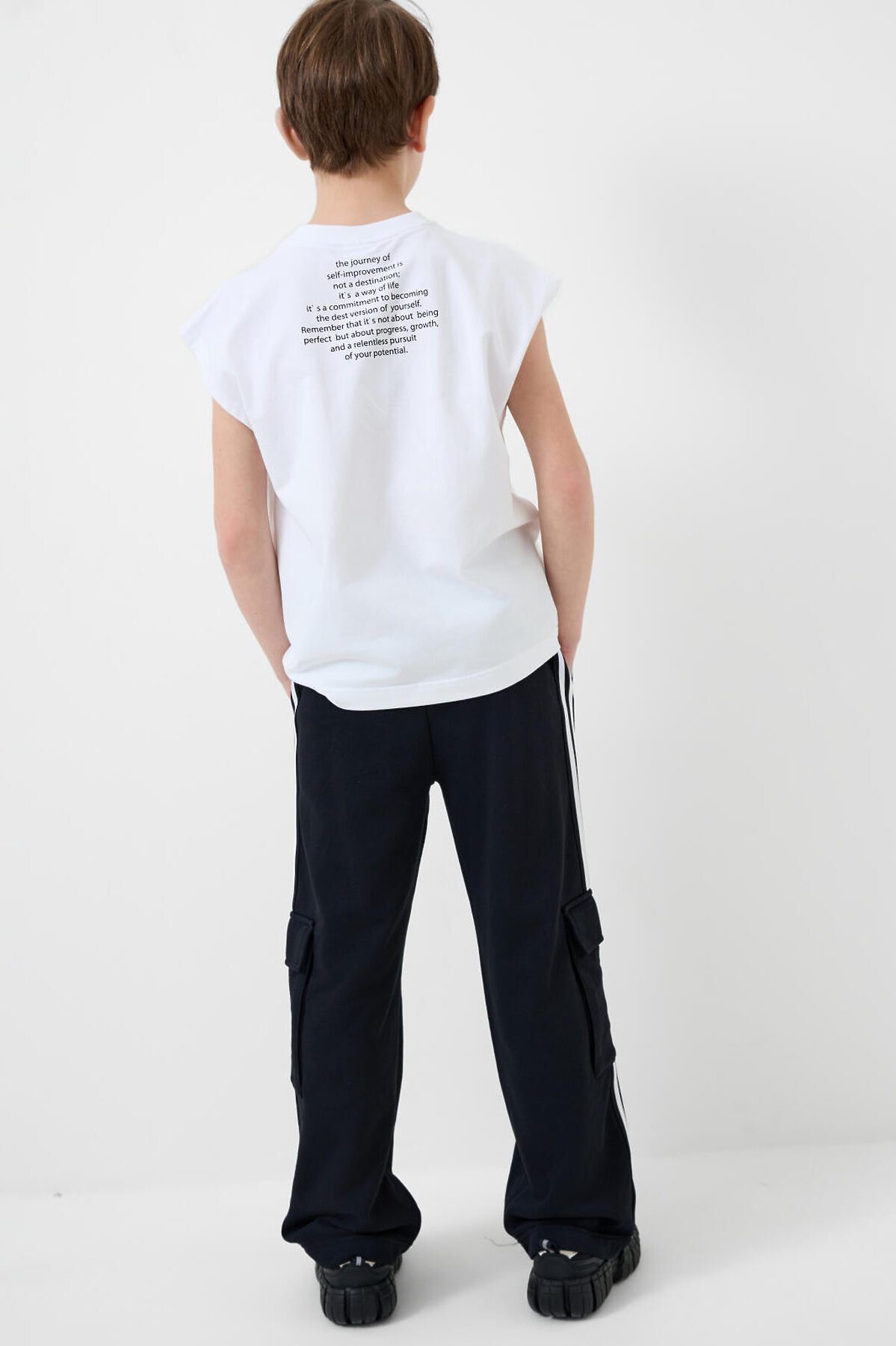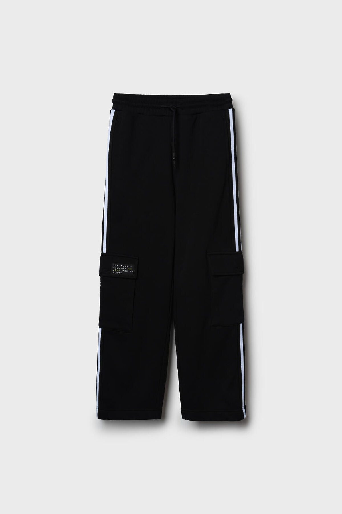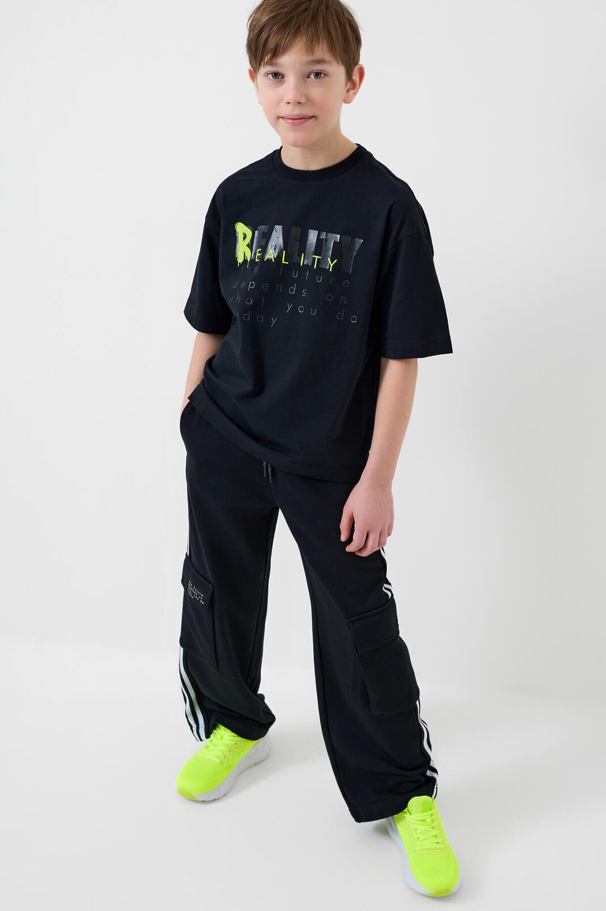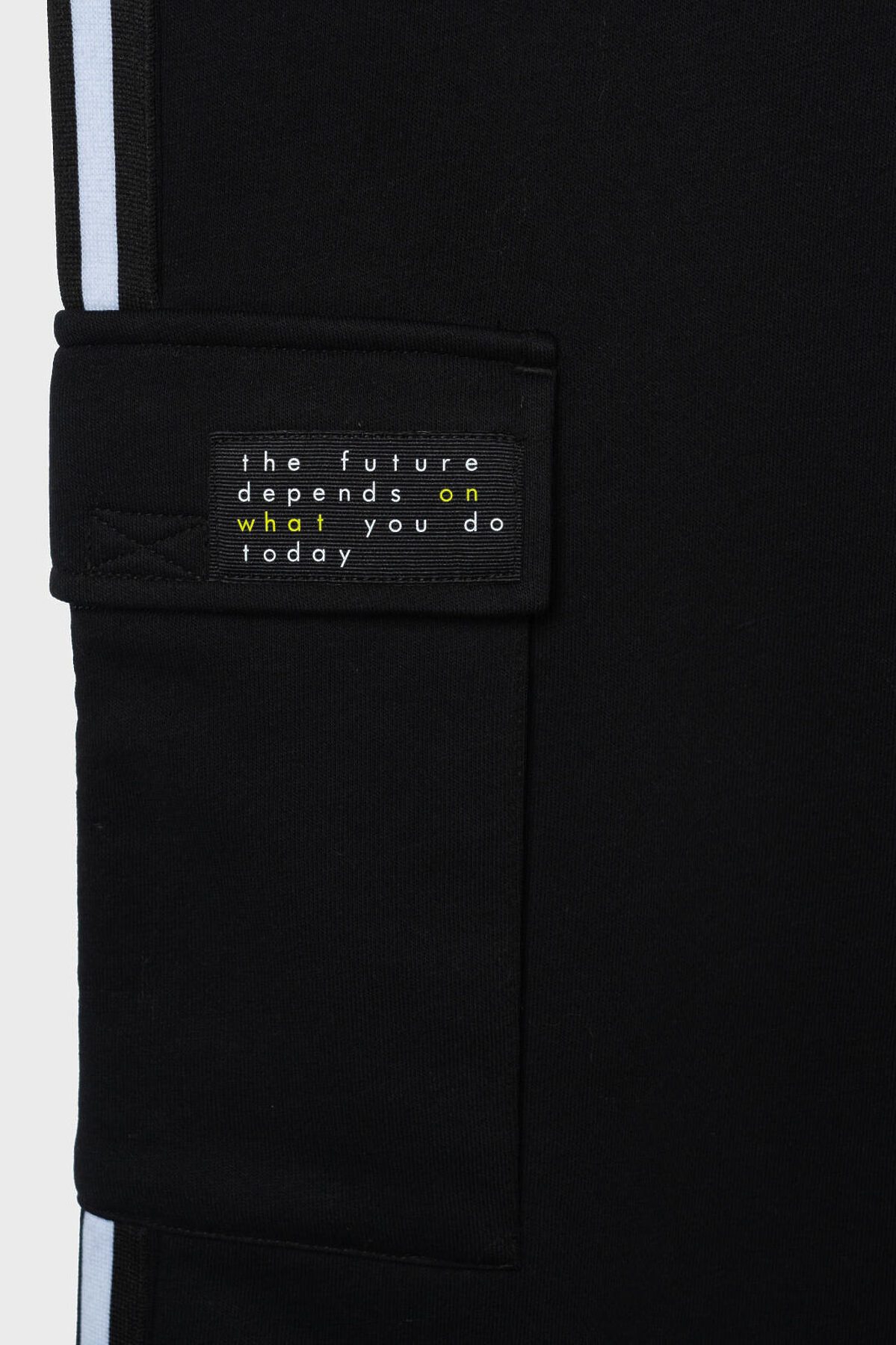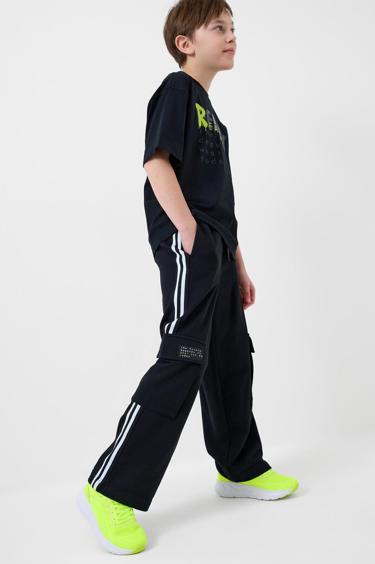 Широкие спортивные брюки для мальчика подростка. Модель из хлопкового трикотажа футер без начеса. Пояс на резинке дополнен внешним шнуром для регулировки объёма. Брюки оформлены в контрастной чёрно-белой гамме с лампасами по бокам и текстильной нашивкой с объёмным принтом. На бедрах расположены удобные боковые карманы и объёмные карманы-карго на липучке.