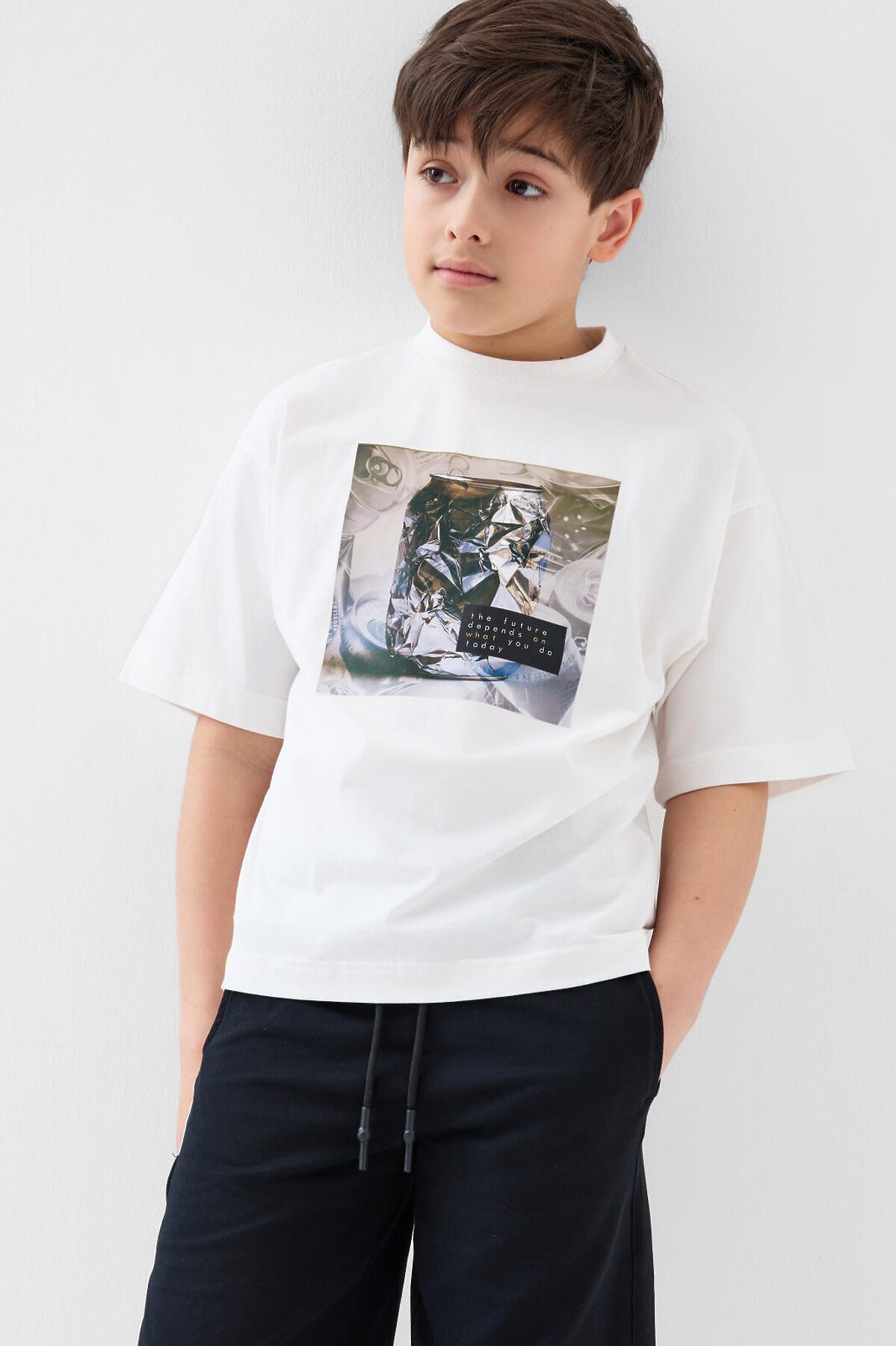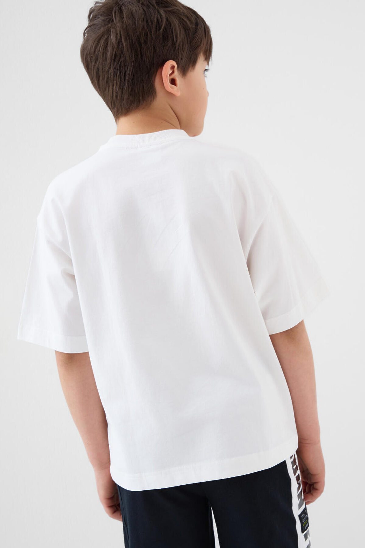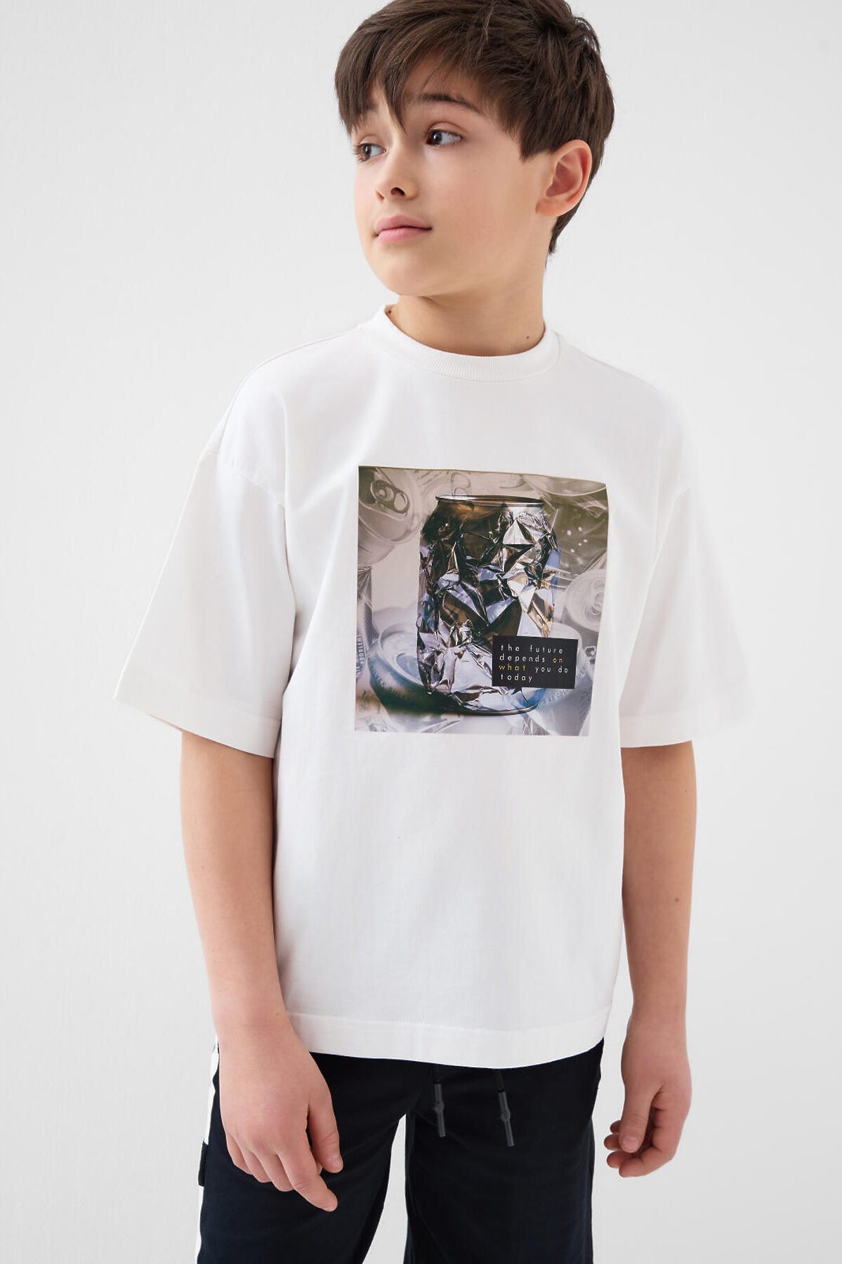 Футболка оверсайз для мальчика подростка. Модель выполнена из эластичного хлопкового трикотажа джерси. На груди расположен крупный принт. Горловина круглая, обработана эластичным рибом. В нижней части — небольшая нашивка.