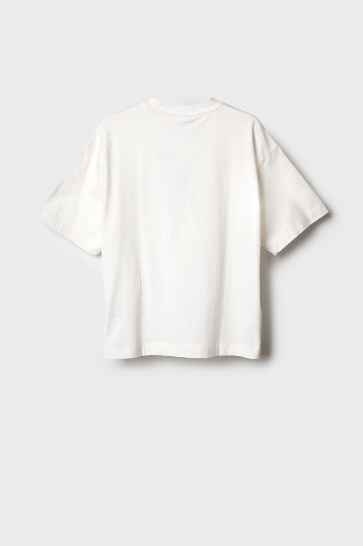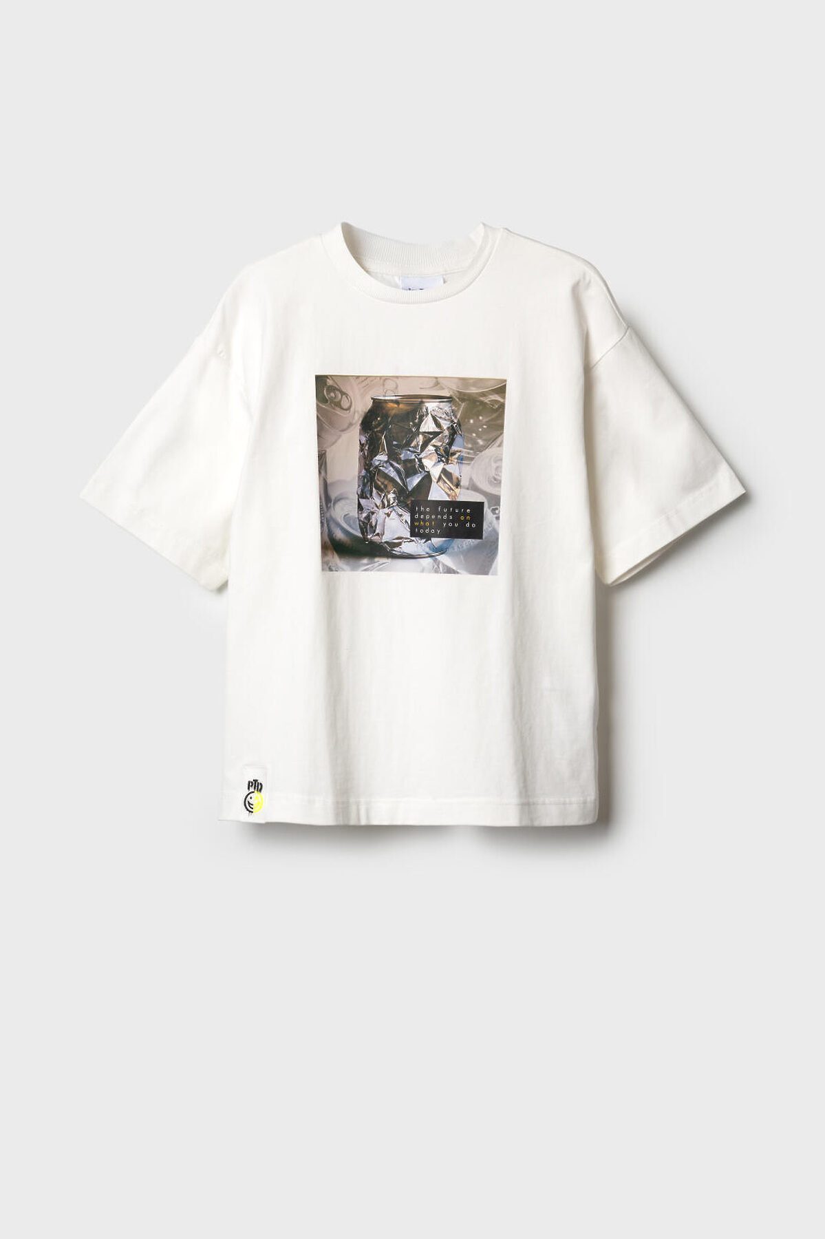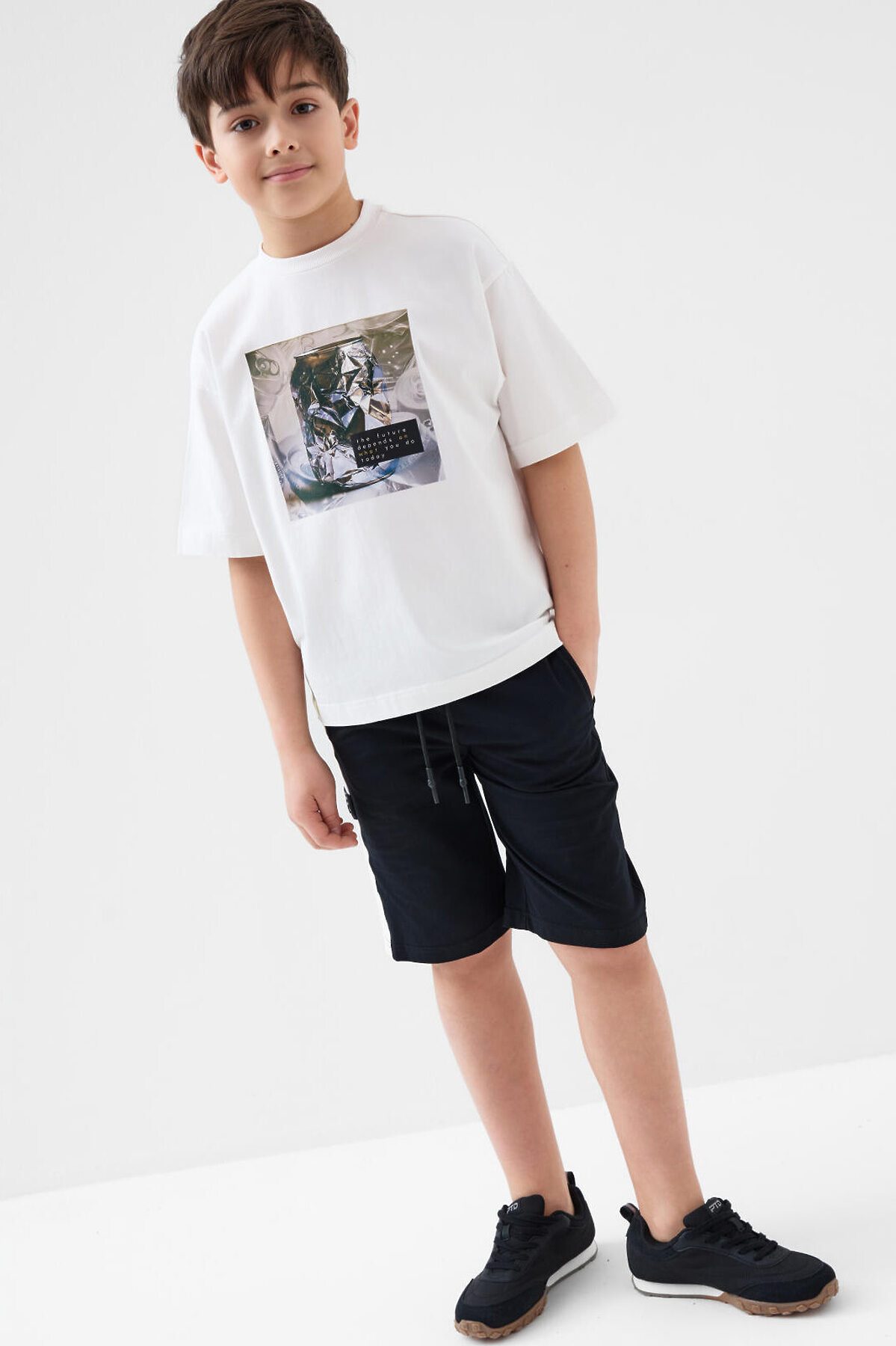 Футболка оверсайз для мальчика подростка. Модель выполнена из эластичного хлопкового трикотажа джерси. На груди расположен крупный принт. Горловина круглая, обработана эластичным рибом. В нижней части — небольшая нашивка.